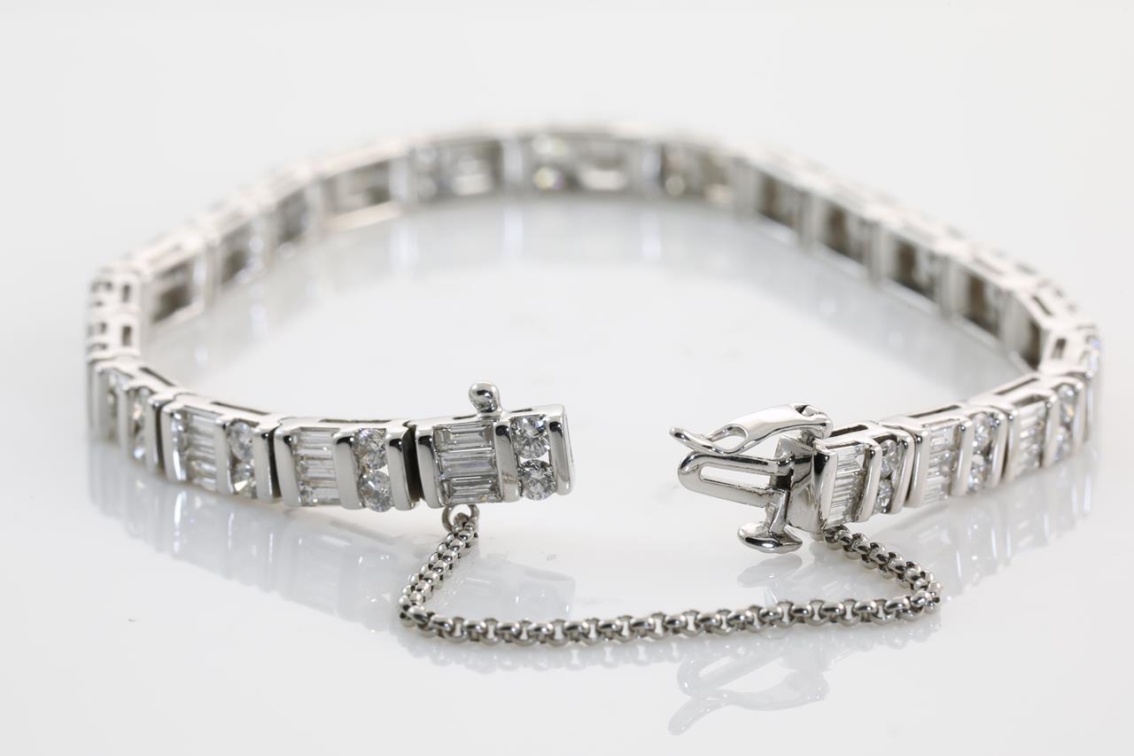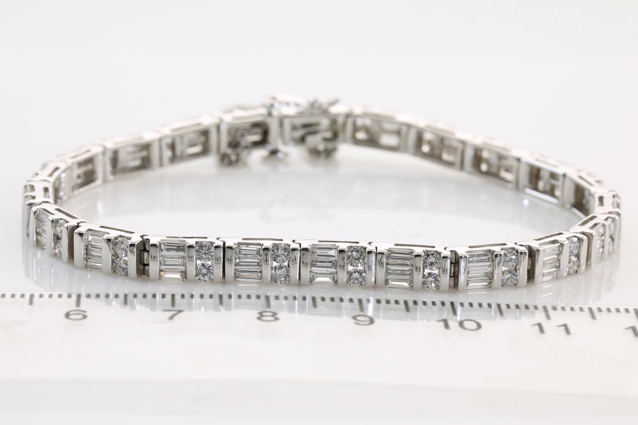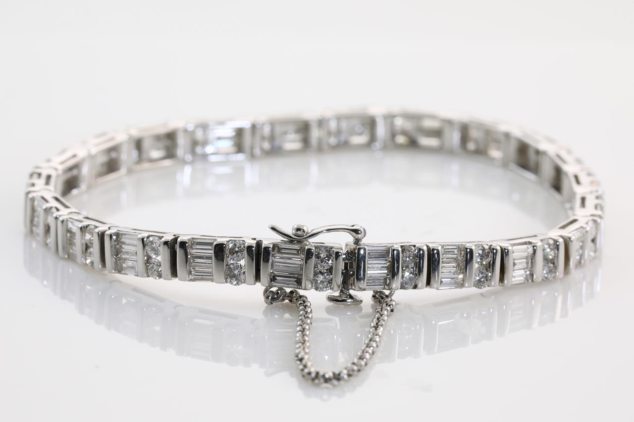 Diamond bracelet with round and baguette cut Diamonds totalling 5.00cts (Estimated grading: G-H VS-SI). 18ct white gold. Length: 18cm. With certificate #413968. Weight: 19.7g. (Pre-owned)