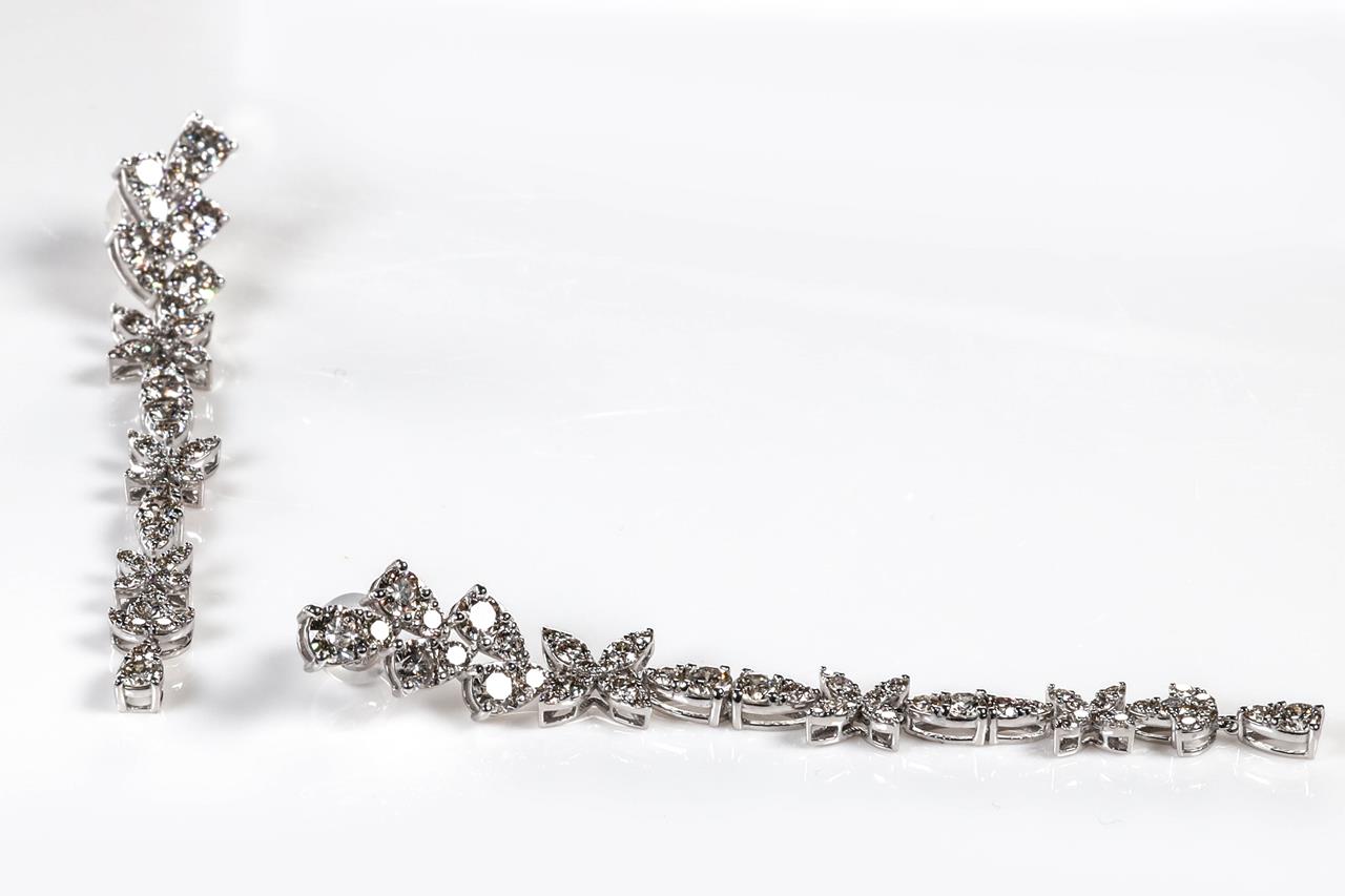 Diamond dress earrings with round brilliant cut Diamonds totalling 5.00cts (Estimated grading: I-J SI). 18ct white gold with gold & silicon backs. Weight: 9.9g. With Certificate #415188. (Pre-owned)