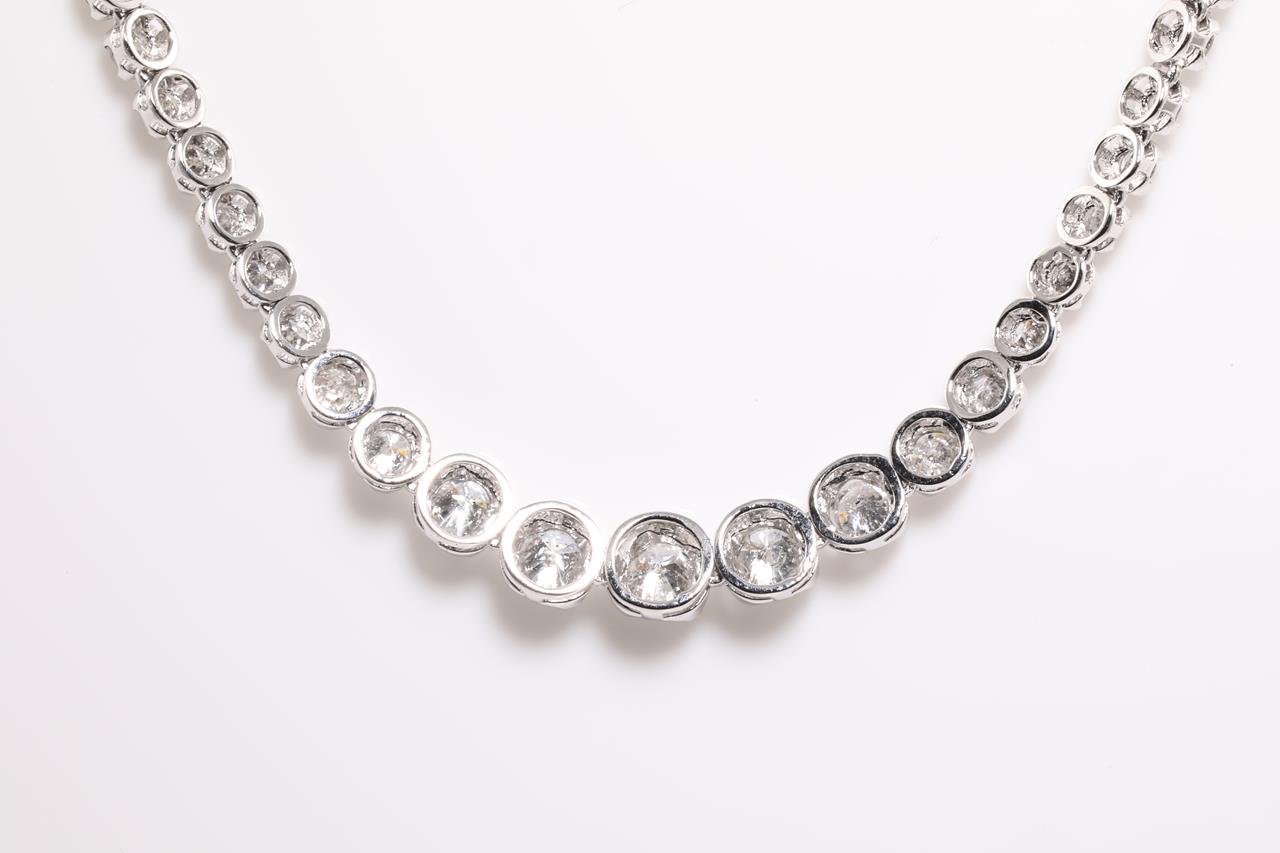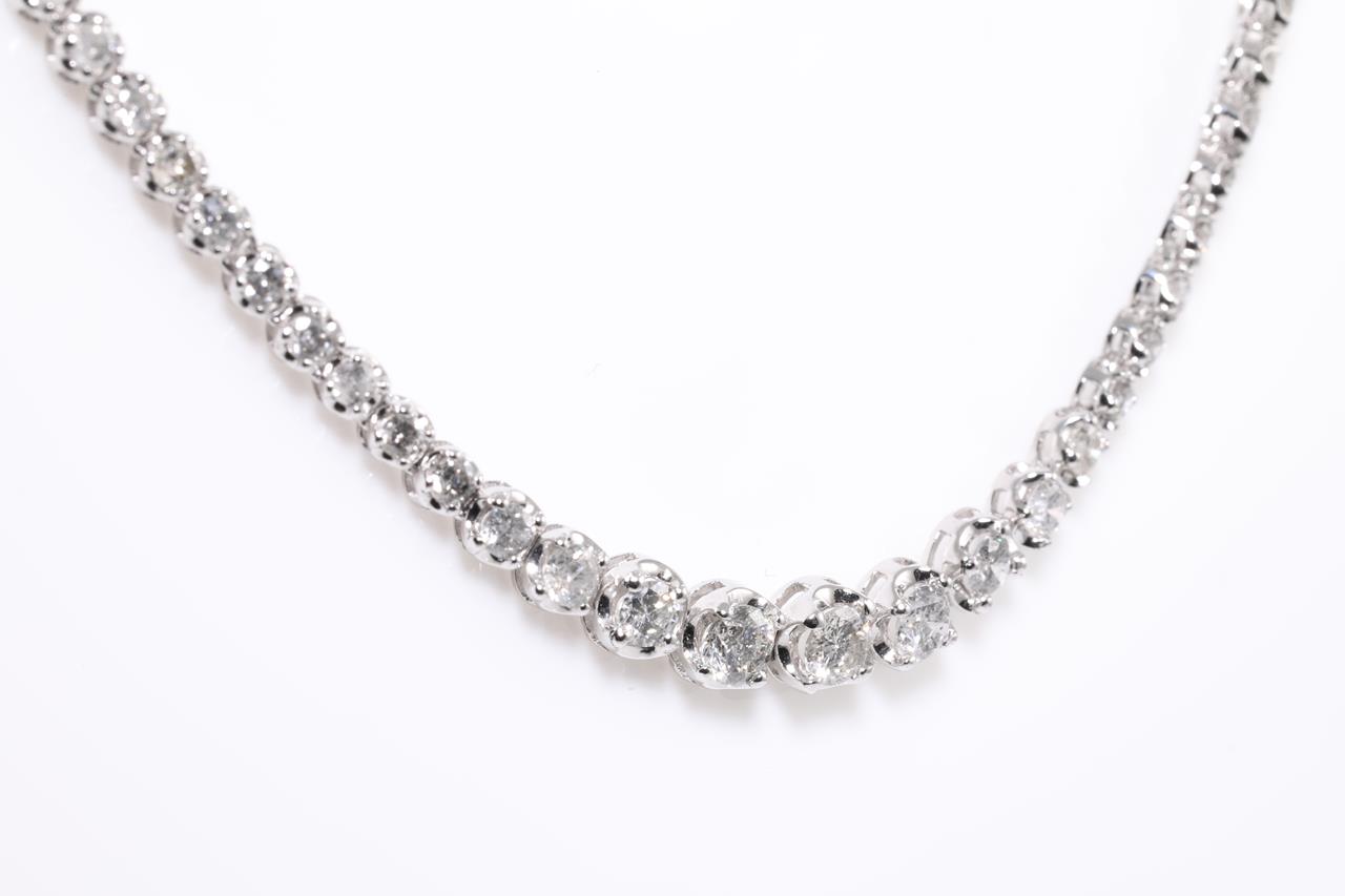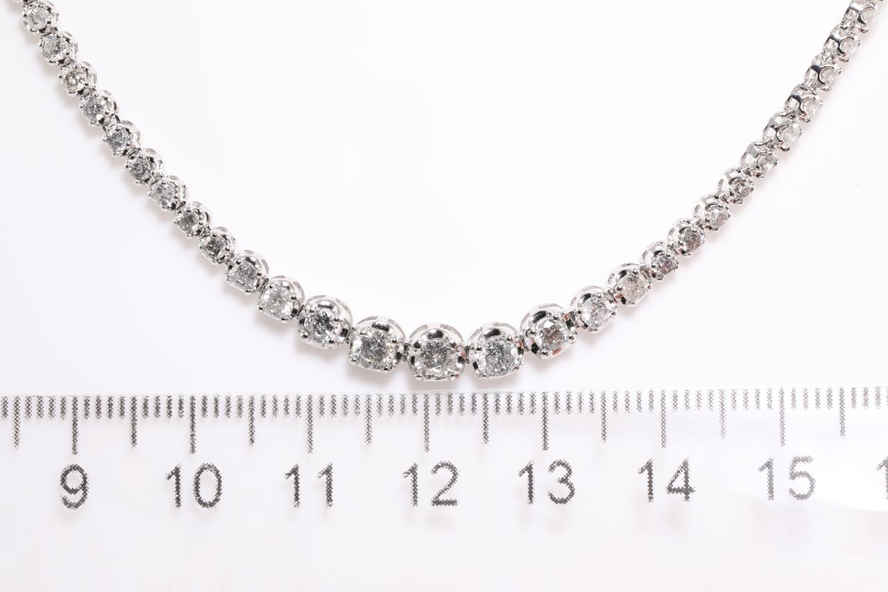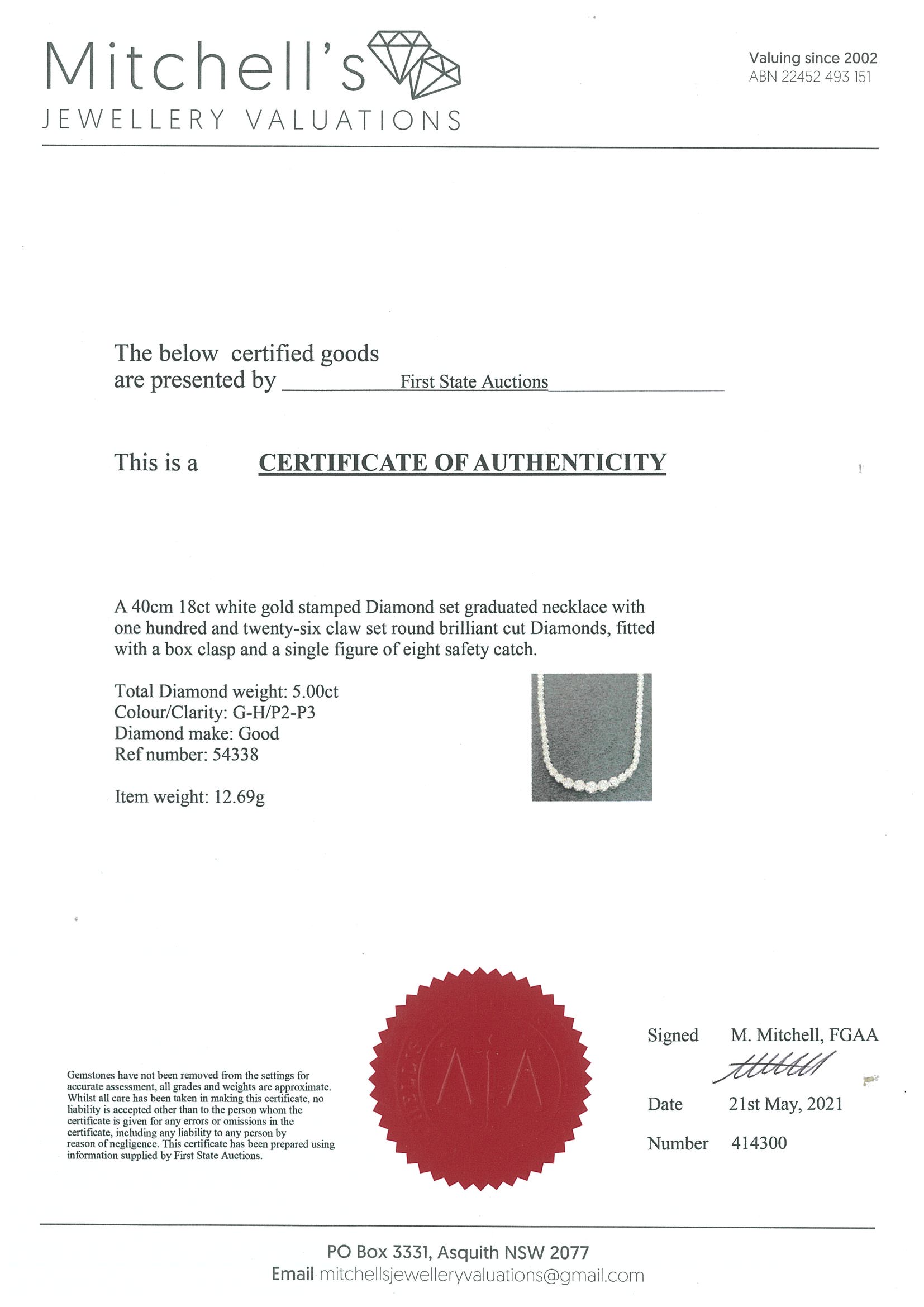 Diamond tennis necklace with round Diamonds totalling 5.00cts (Estimated grading: G-H P2-3). 18ct white gold. Length: 40cm. Weight: 12.6g. With certificate #414300. (Pre-owned)