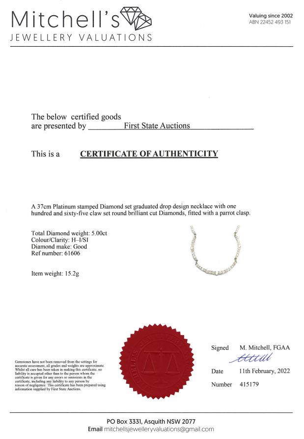 Diamond Necklace with 165 round cut Diamonds totalling 5.00cts (Estimated grading: H-I SI). Platinum. Length: 35cm. Weight: 15.2g. With certificate #415179. (Pre-owned)