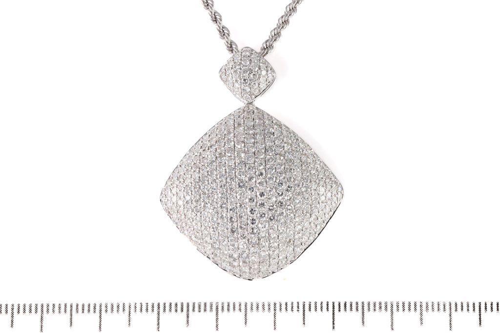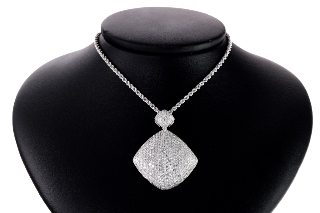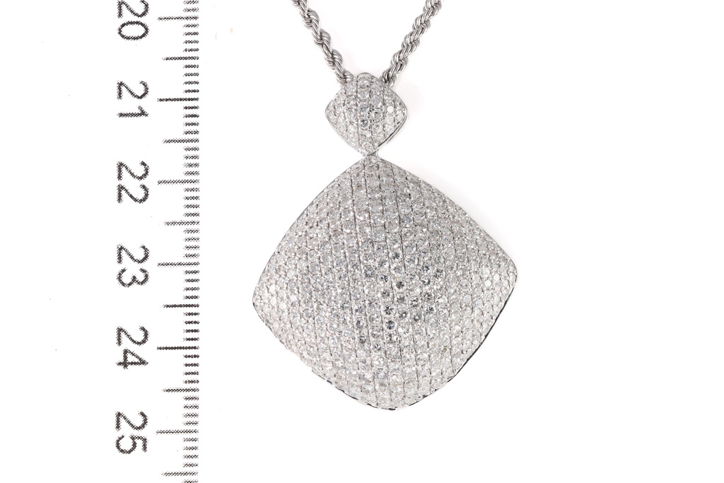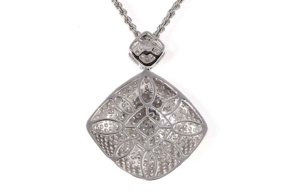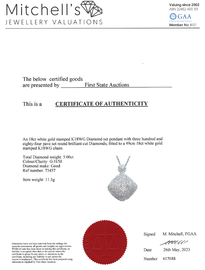 Diamond pendant with round Diamonds totalling 5.00cts (Estimated grading: G-H SI). 18ct white gold with 49cm 18ct white gold adjustable chain. Weight: 11.3g. With Certificate #417088. (Pre-owned)