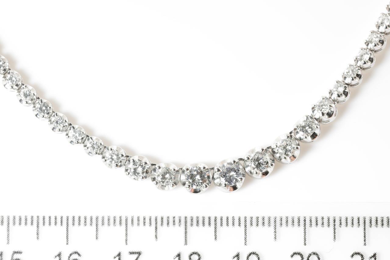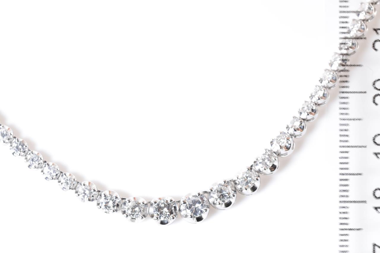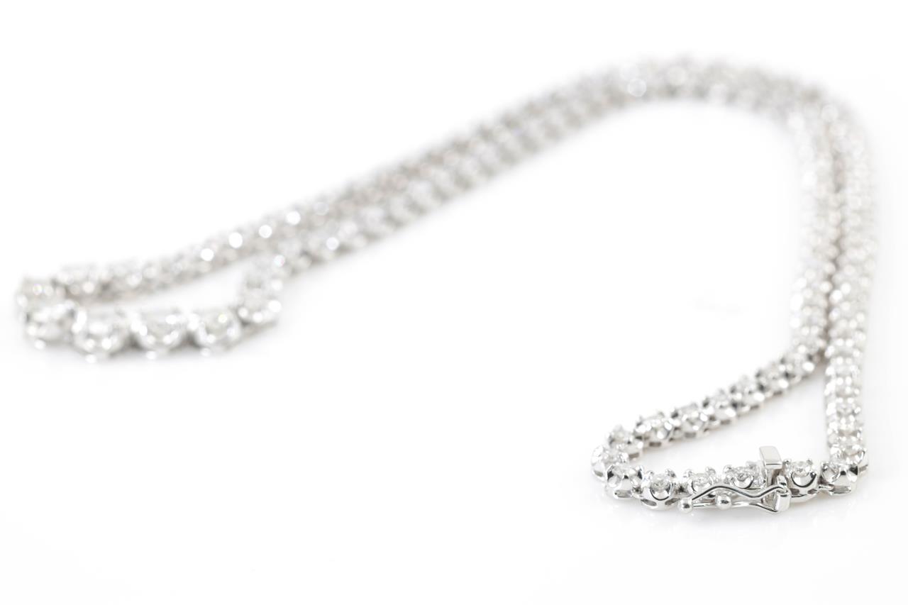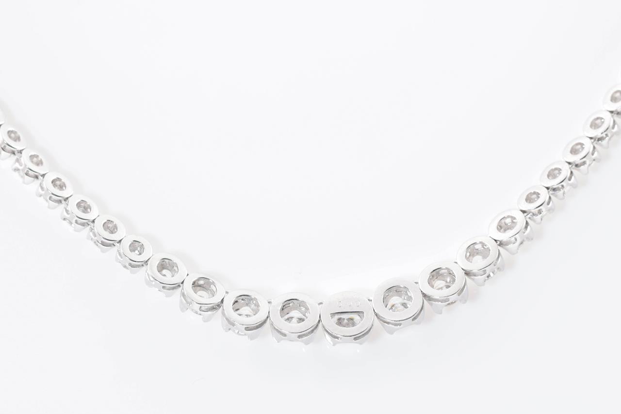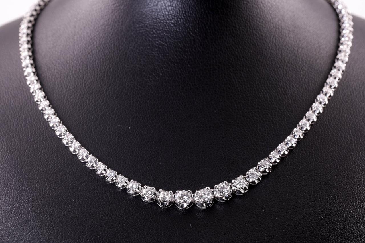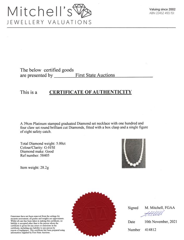 Diamond tennis necklace with 104 round Diamonds totalling 5.00cts (Estimated grading: G-H SI). Platinum. Length: 39cm. Weight: 28.2g. With certificate #414812. (Pre-owned)