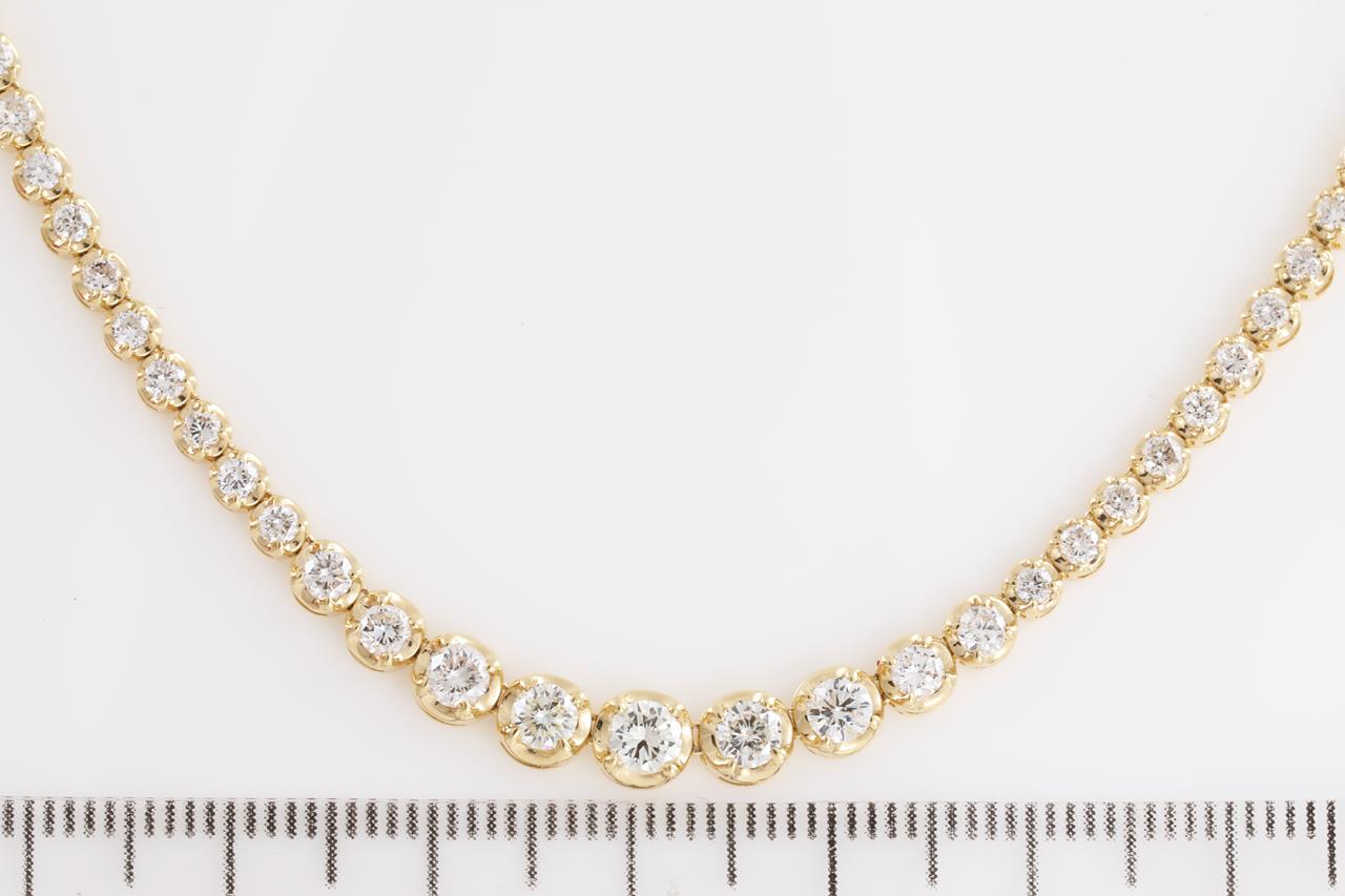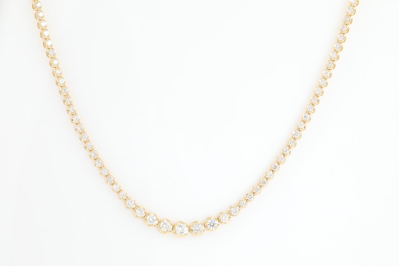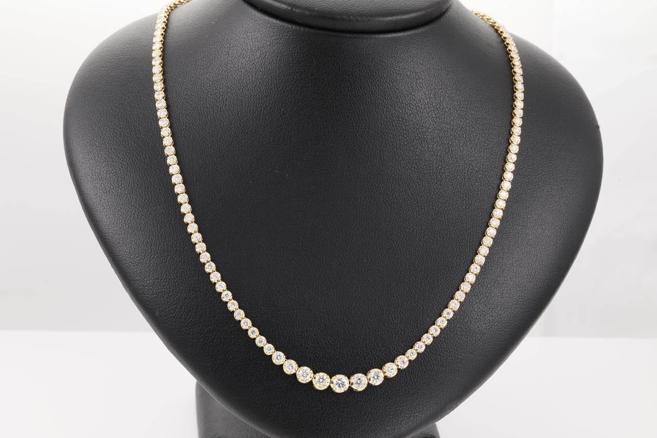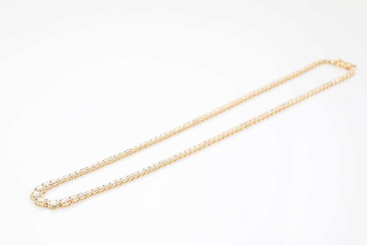 Diamond tennis necklace with TBA slightly graduated round Diamonds totalling 5.00cts (Estimated grading: HIJ SI). 18ct yellow gold. Length: 42cm. With certificate #59879. Weight: 11.2g (Pre-owned)