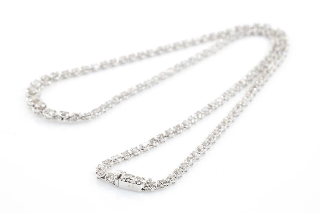 Diamond tennis necklace with 123 slightly graduated round Diamonds totalling 5.00cts (Estimated grading: I-J P2). 18ct white gold. Length: 42cm. Weight: 13.1g. With certificate #415150. (Pre-owned)