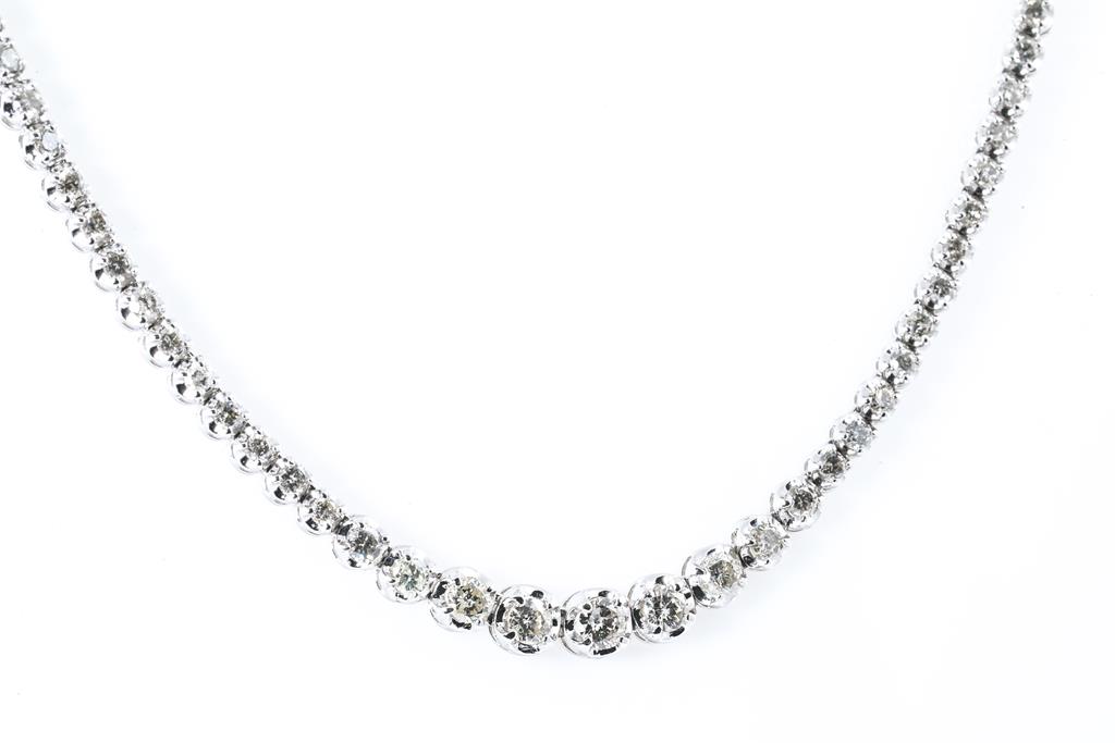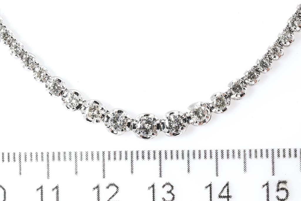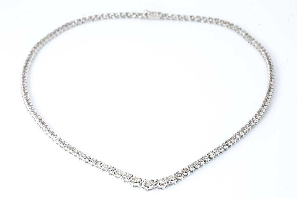 Diamond tennis necklace with graduated round Diamonds totalling 5.00cts (Estimated grading: K-L P1). Platinum. Length: 41cm. Weight: 19.6g. With certificate #415737. (Pre-owned)