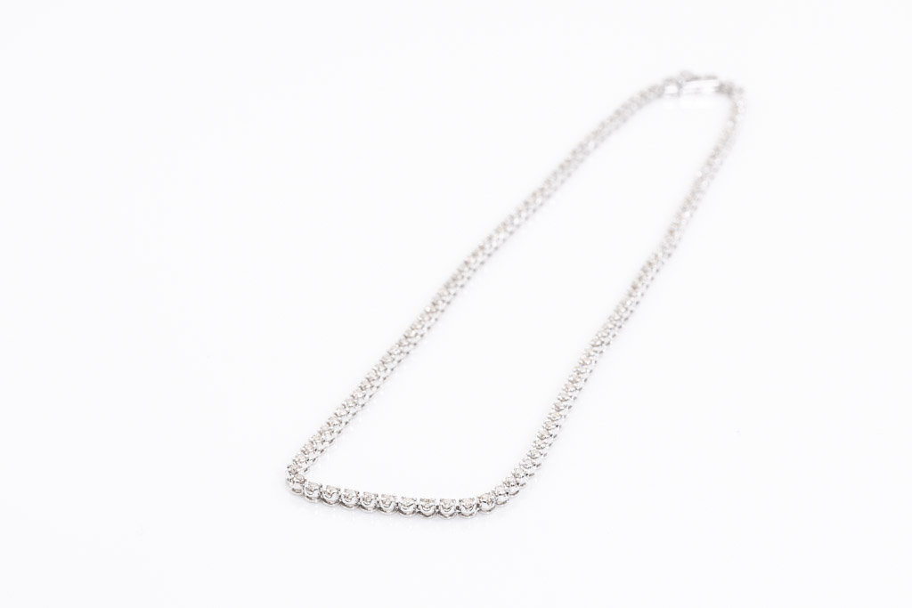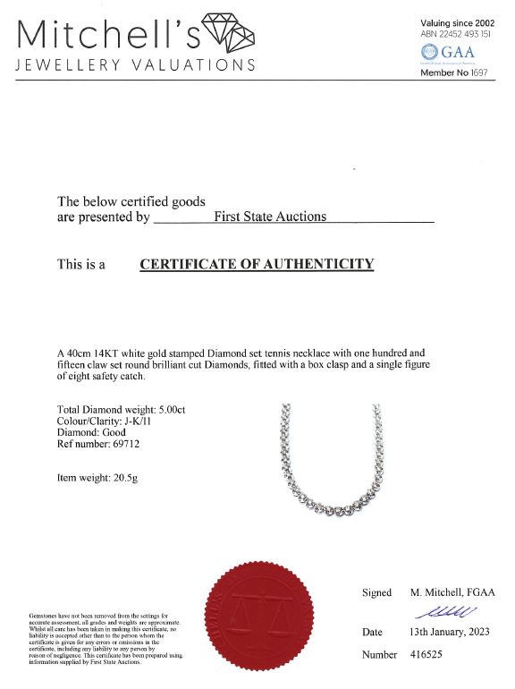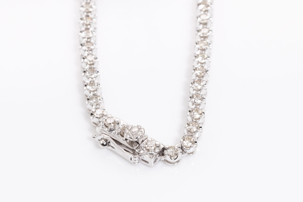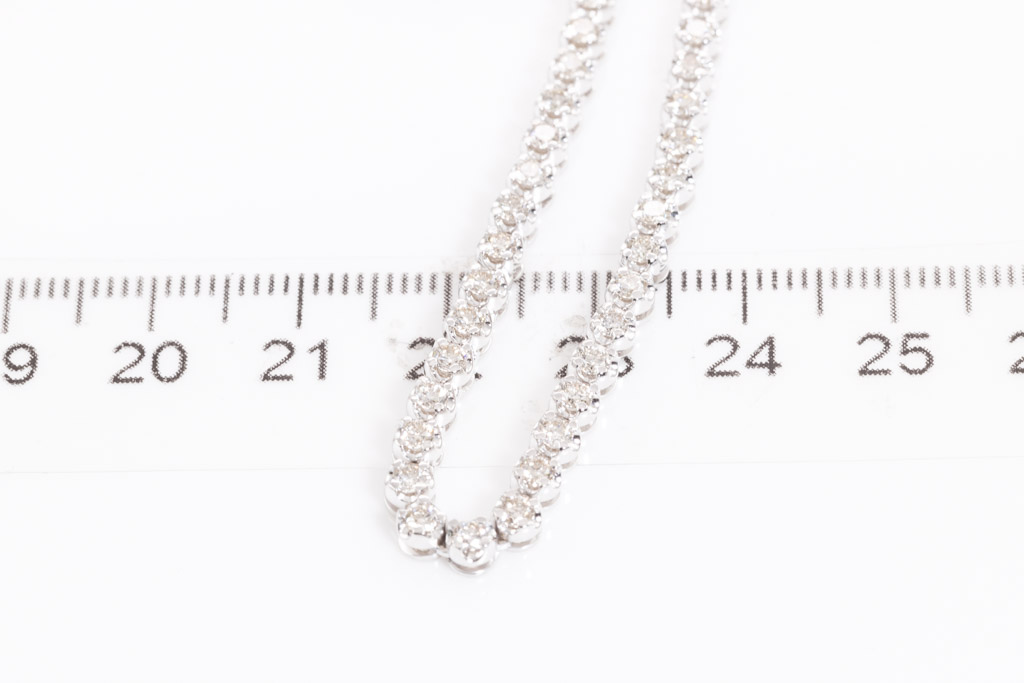 Diamond tennis necklace with 115 round Diamonds totalling 5.00cts. (Estimated grading: J-K P1). 14ct white gold. Length: 40cm. Weight: 20.5g. With Certificate #416525. (New)