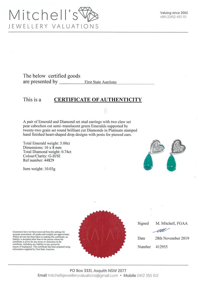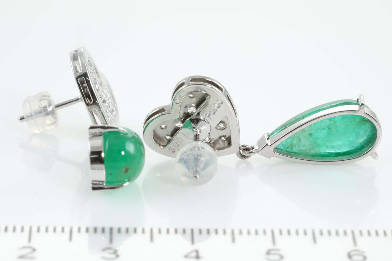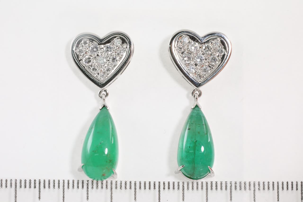 Emerald and Diamond earrings with Cabochon cut Emeralds totalling 5.00cts and Diamonds totalling 0.74cts (Estimated grading: G-H SI). Platinum, weight: 10g. With certificate #412955 (Pre-owned)