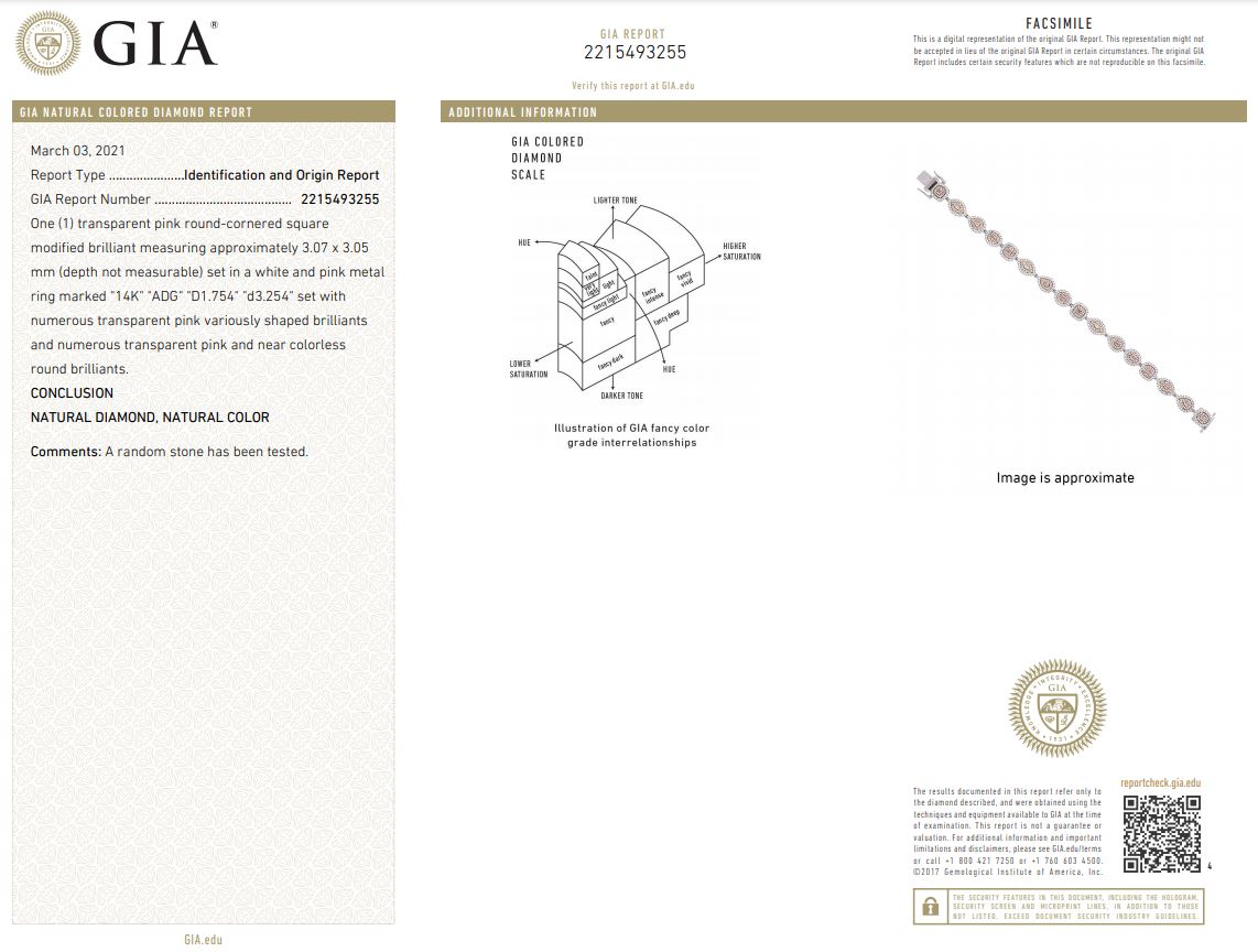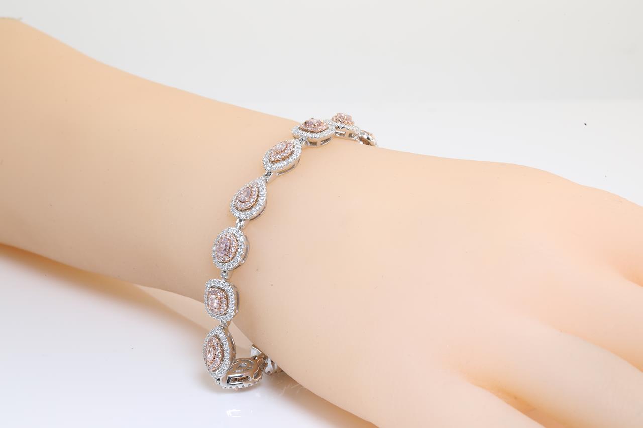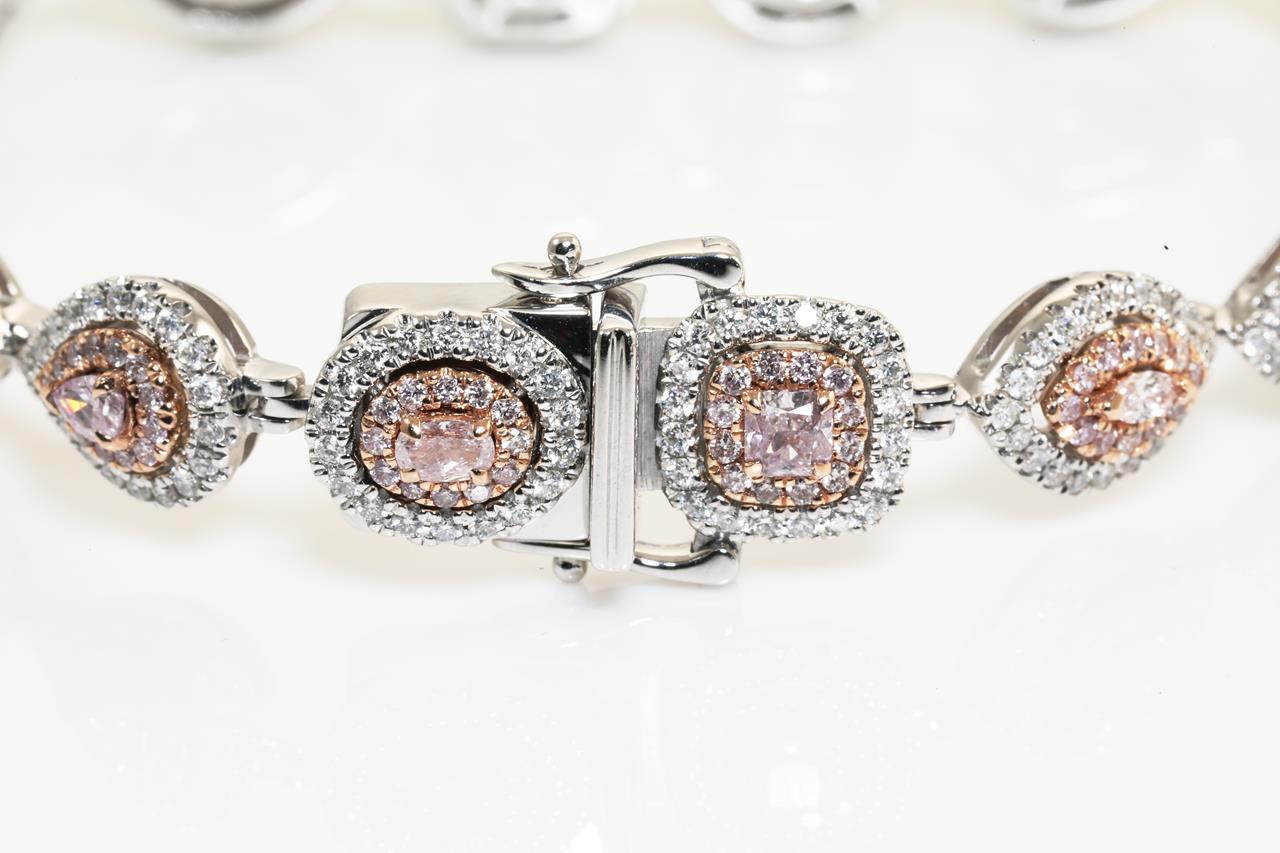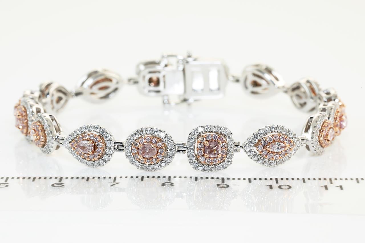 Diamond bracelet with 16 fancy shape pink diamonds, surrounded by pink round diamonds totalling 1.75cts (with GIA report # 2215493255) and white diamonds totalling 3.25cts (Estimated grading: TBA). 14ct white gold. Length: 19cm Weight: 25.5g (New)