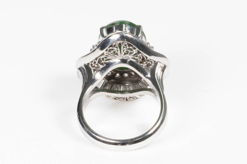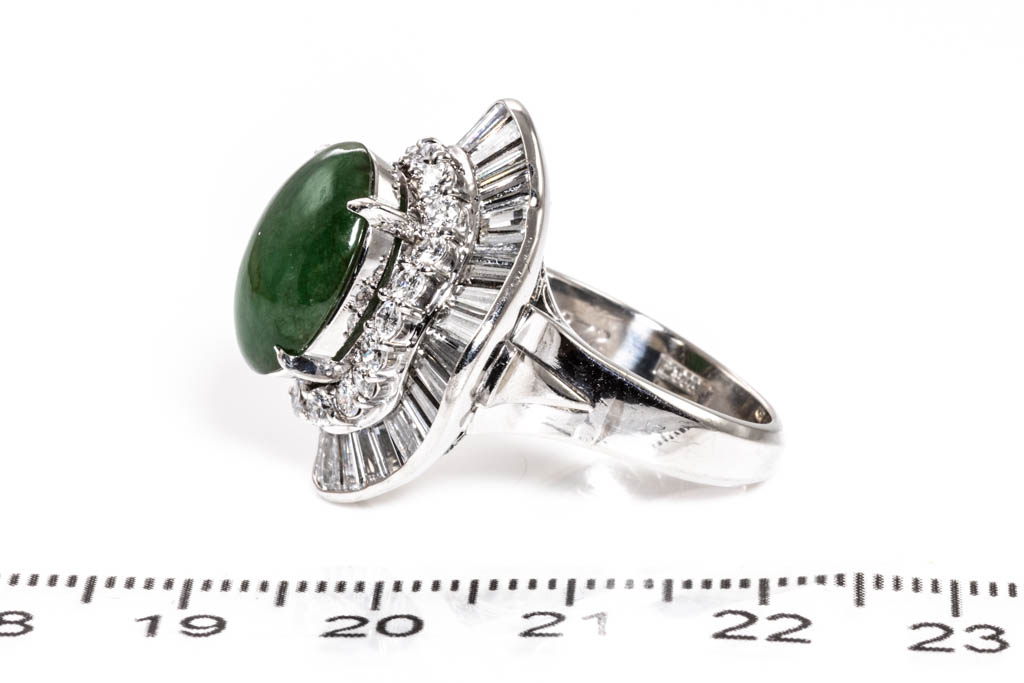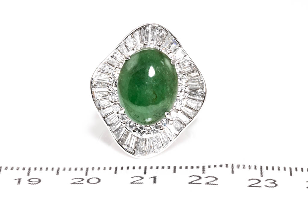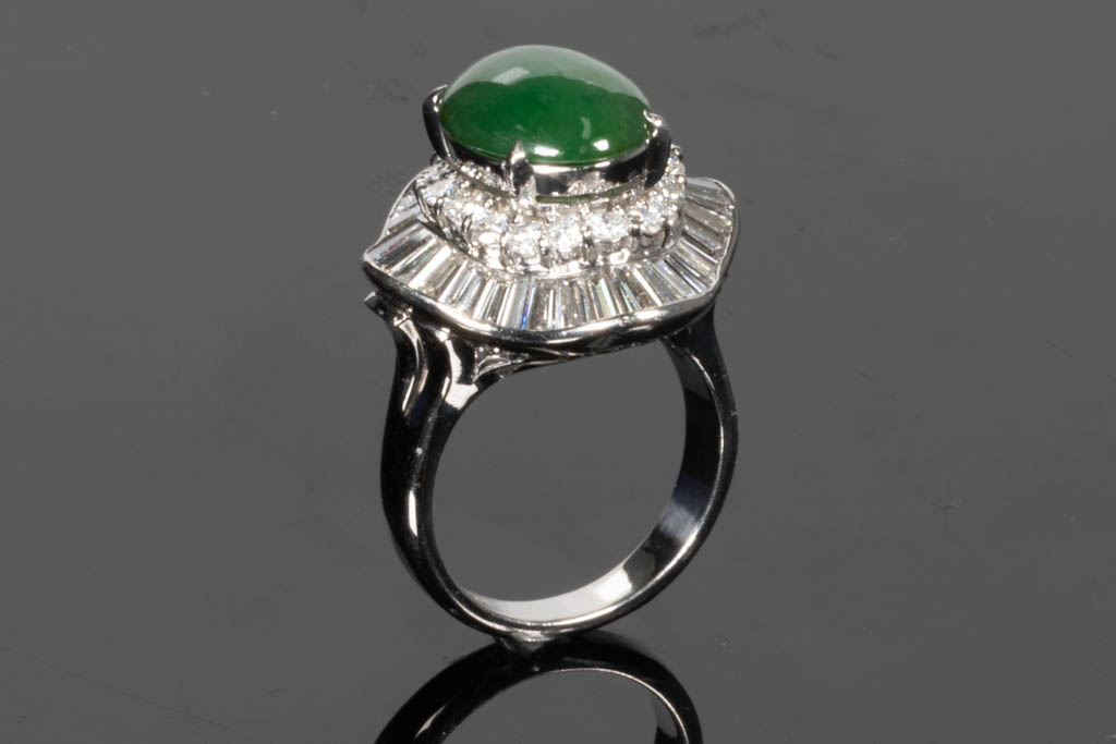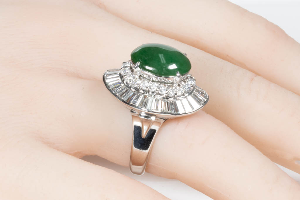 Jade and Diamond ring with cabochon cut natural Jadeite Jade - Type A of approximately 5.00ct and round & baguette cut Diamonds totalling 2.72cts (Estimated grading: H SI). Platinum. Ring size L. Weight: 15.8g. With Certificate #416463. (Pre-owned)