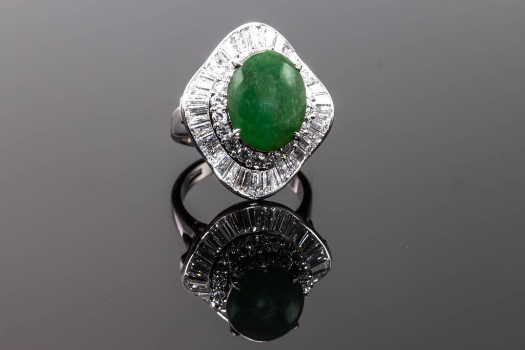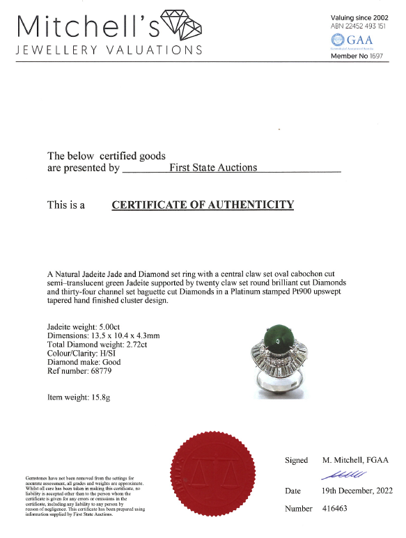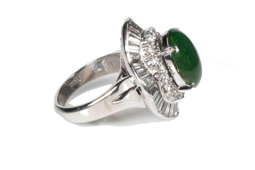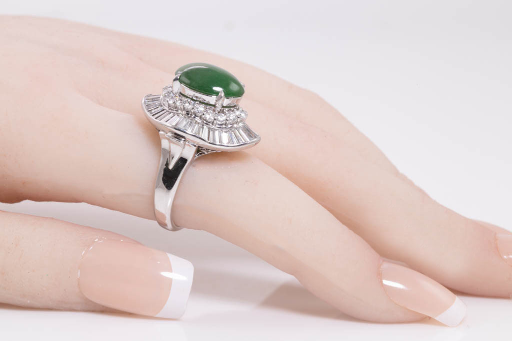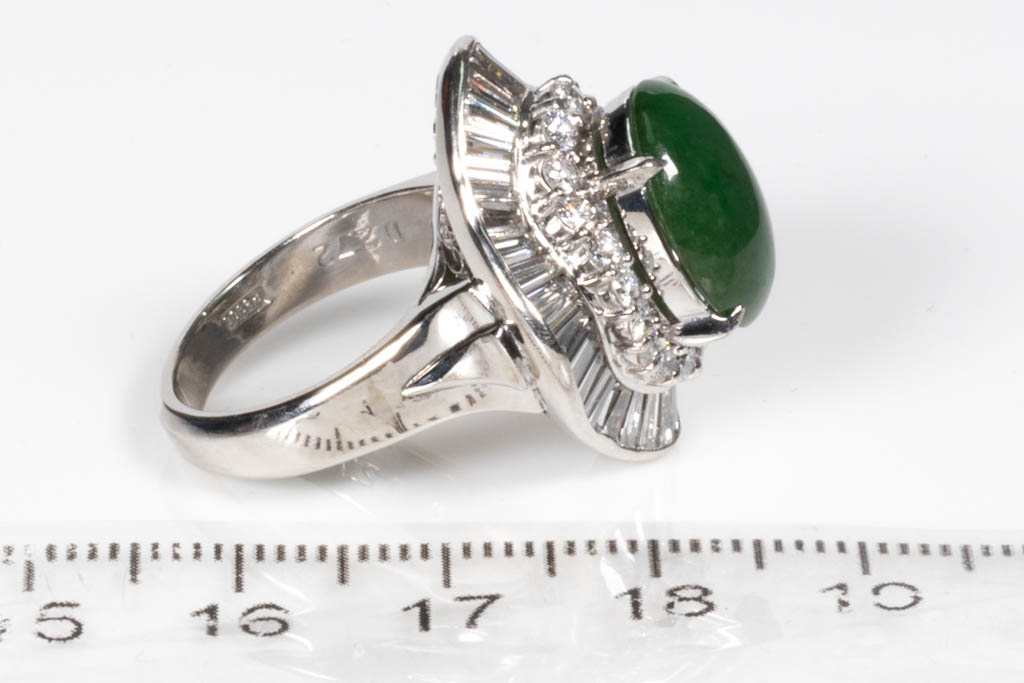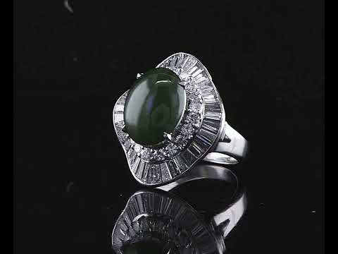 Jade and Diamond ring with cabochon cut natural Jadeite Jade - Type A of approximately 5.00ct and round & baguette cut Diamonds totalling 2.72cts (Estimated grading: H SI). Platinum. Ring size L. Weight: 15.8g. With Certificate #416463. (Pre-owned)