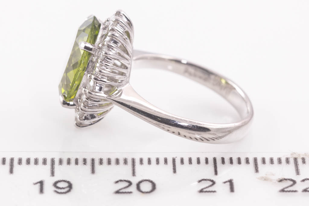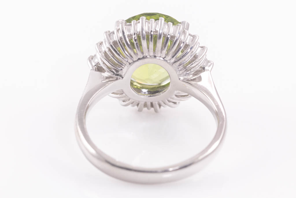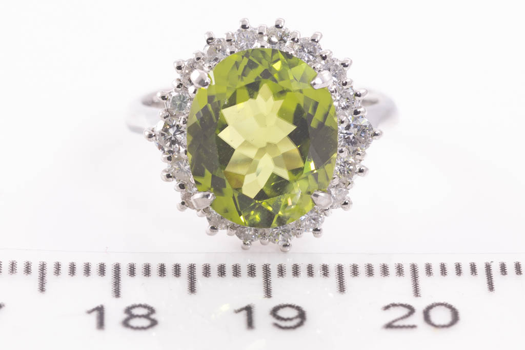 Peridot and Diamond ring with oval shape Peridot of 5.00ct and round Diamonds totalling 0.70cts (Estimated grading: H-I SI). Platinum. Ring size K. Weight: 7.5g. (Pre-owned)
