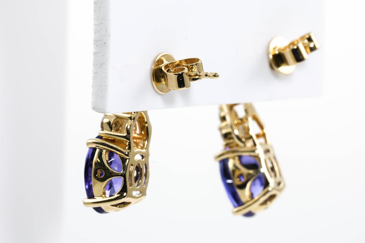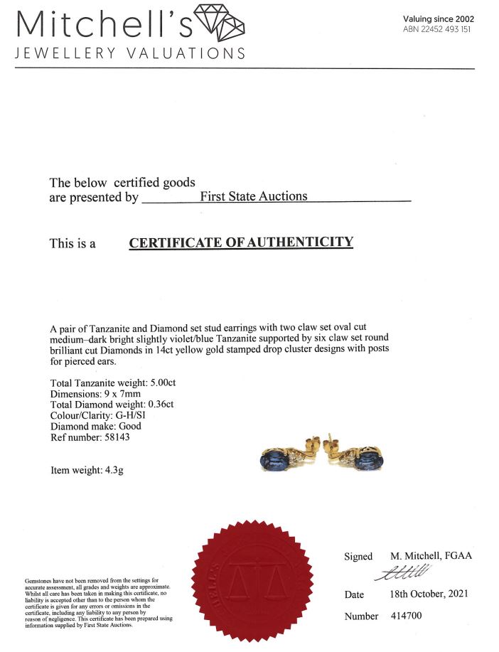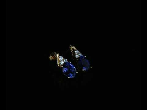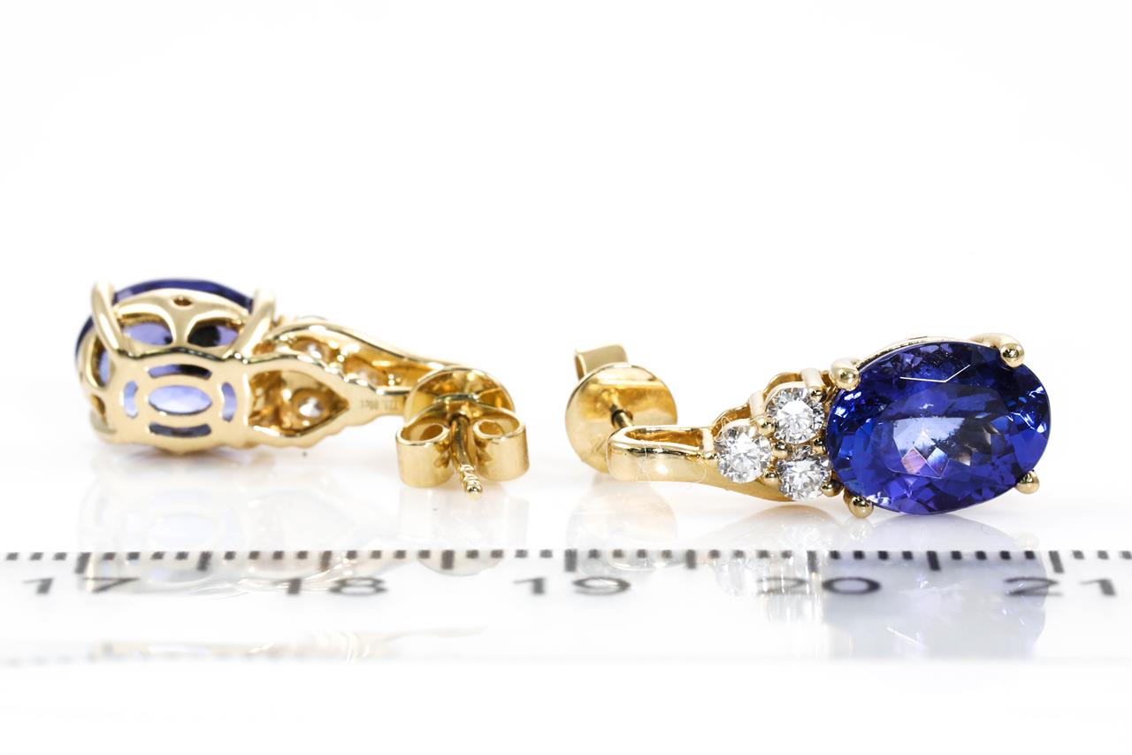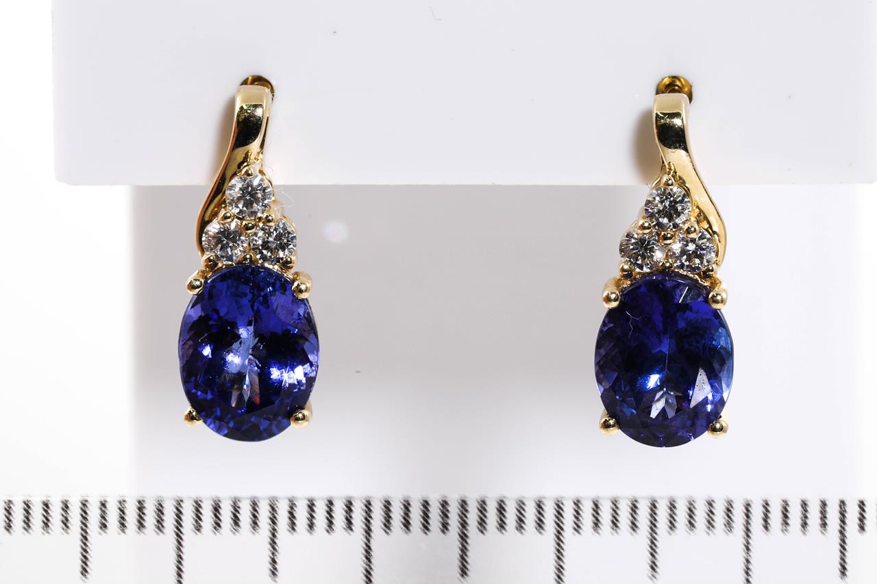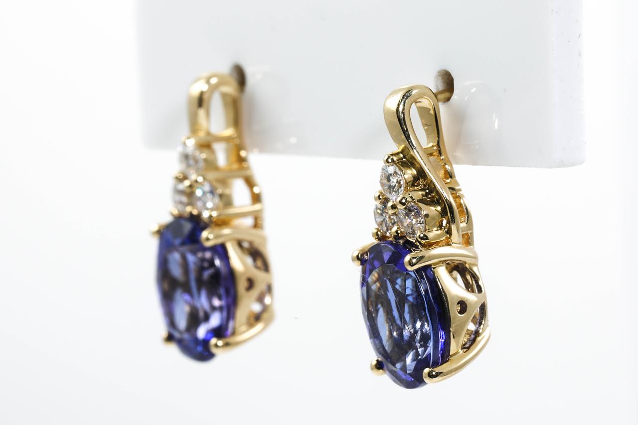 Tanzanite and Diamond earrings with oval Tanzanite totalling 5.00cts and Diamonds totalling 0.36cts (Estimated grading: G-H SI). 14ct yellow gold. Weight: 4.3g. With certificate #414700. (As new)