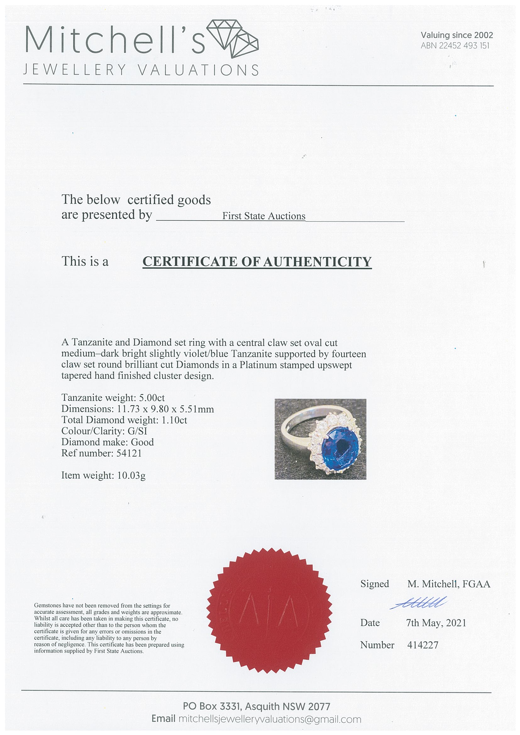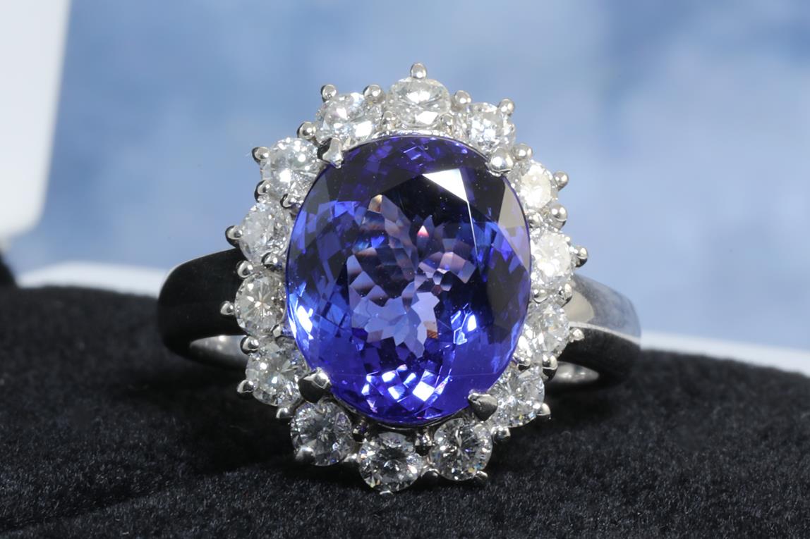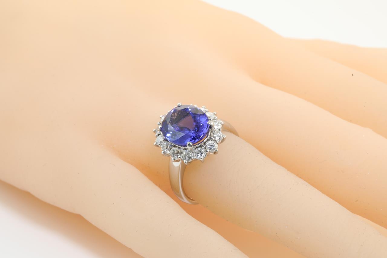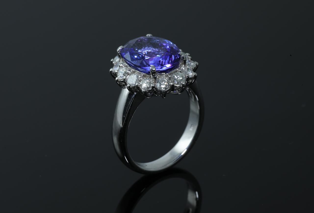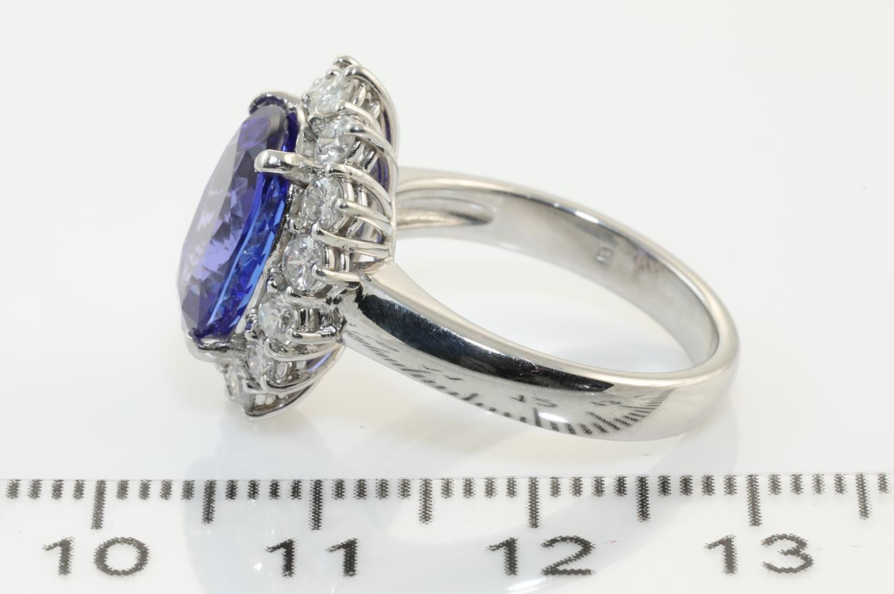 Tanzanite and Diamond ring with an oval Tanzanite of 5.00ct and Diamonds totalling 1.10cts (Estimated grading: G SI). Platinum. Ring size L1/2. With certificate #414227. Weight: 10g. (Pre-owned)