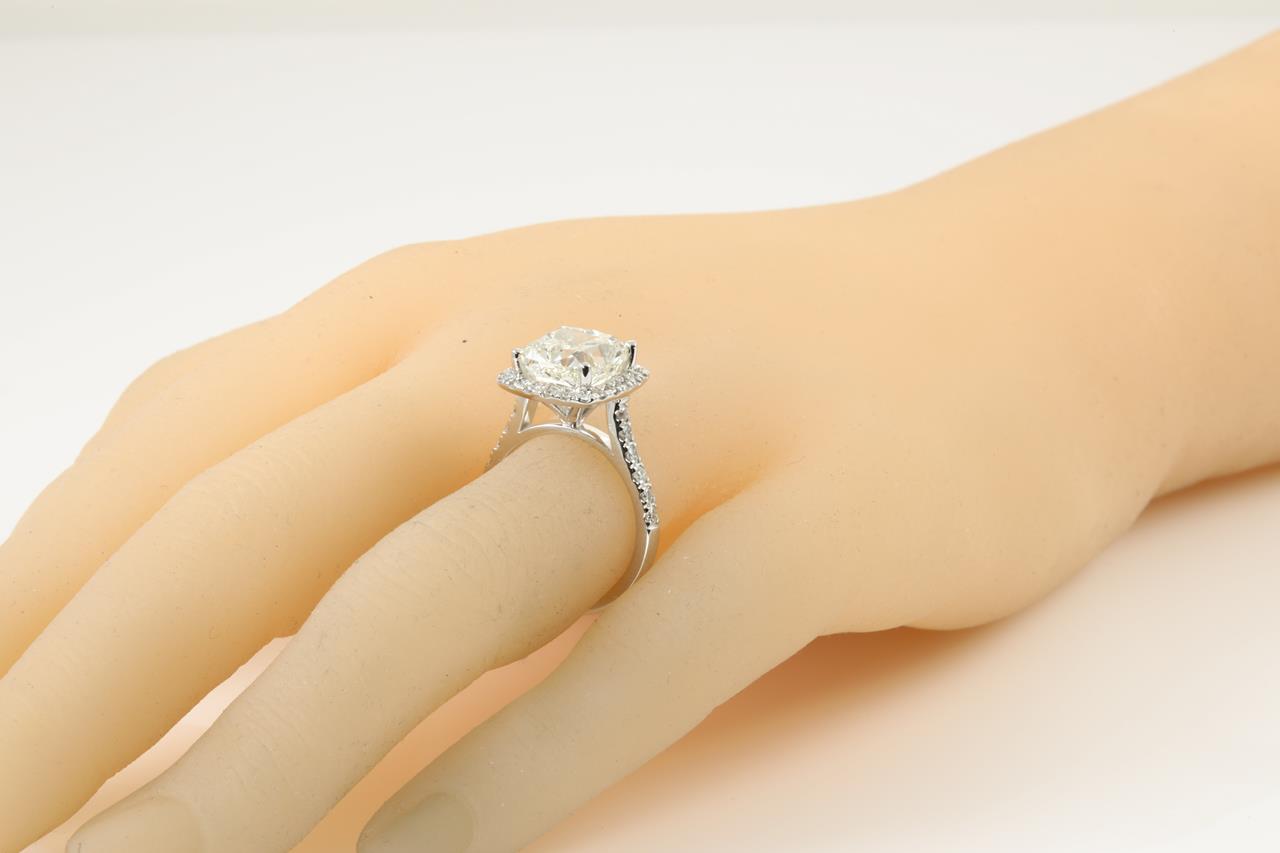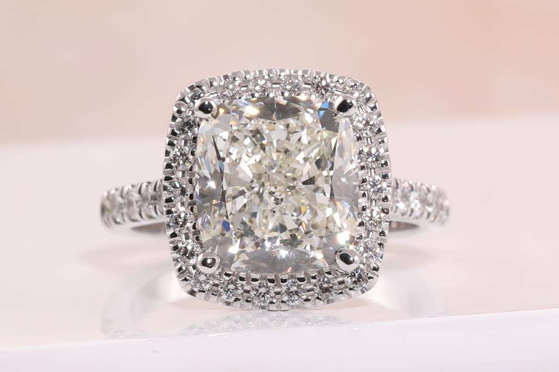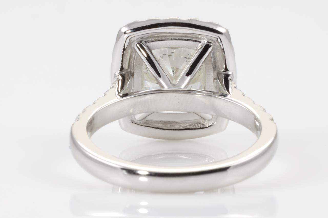 Diamond halo ring with centre Cushion Diamond of 5.01ct (with HRD report graded as H SI2 #2100000044834) and remaining Diamonds totalling 0.50cts. 18ct white gold. Ring size L. Weight: 7g. (New)