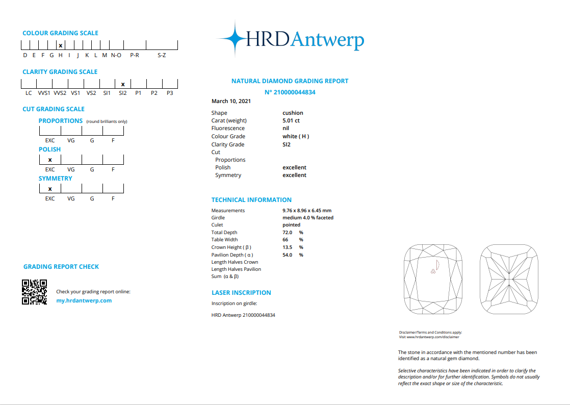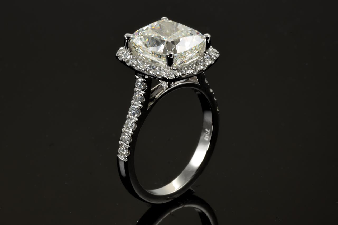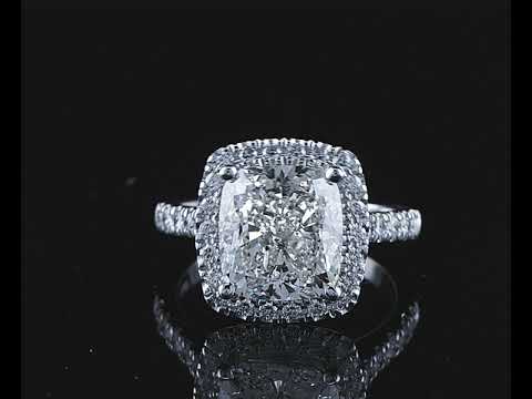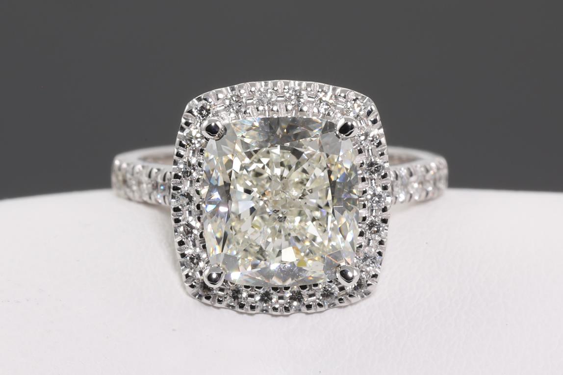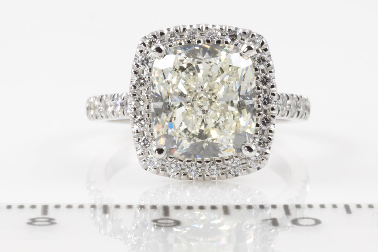 Diamond halo ring with centre Cushion Diamond of 5.01ct (with HRD report graded as H SI2 #2100000044834) and remaining Diamonds totalling 0.50cts. 18ct white gold. Ring size L. Weight: 7g. (New)