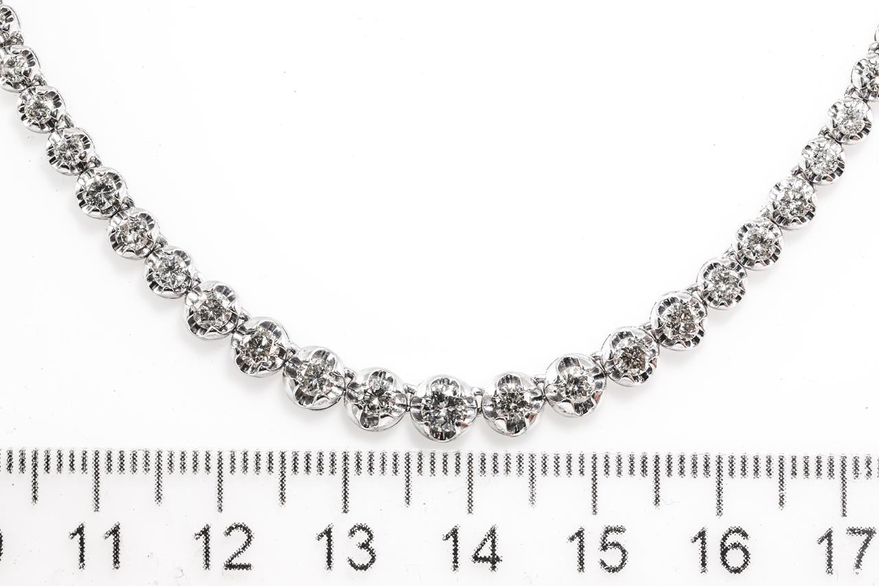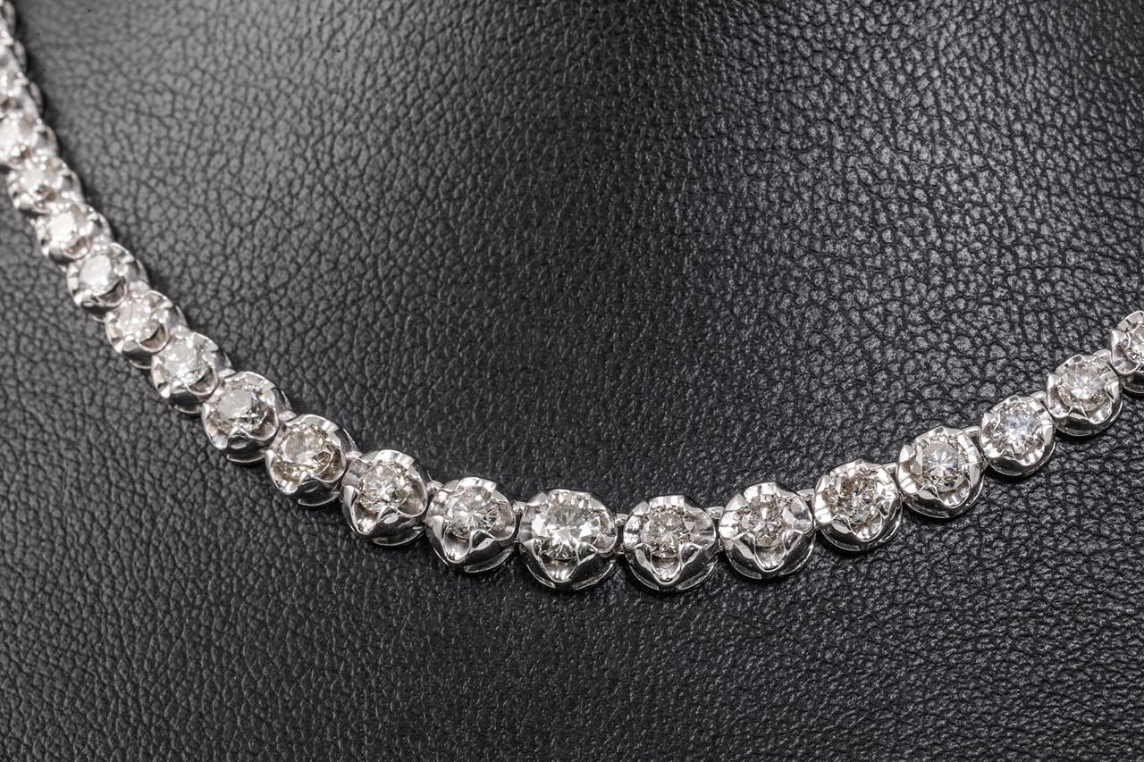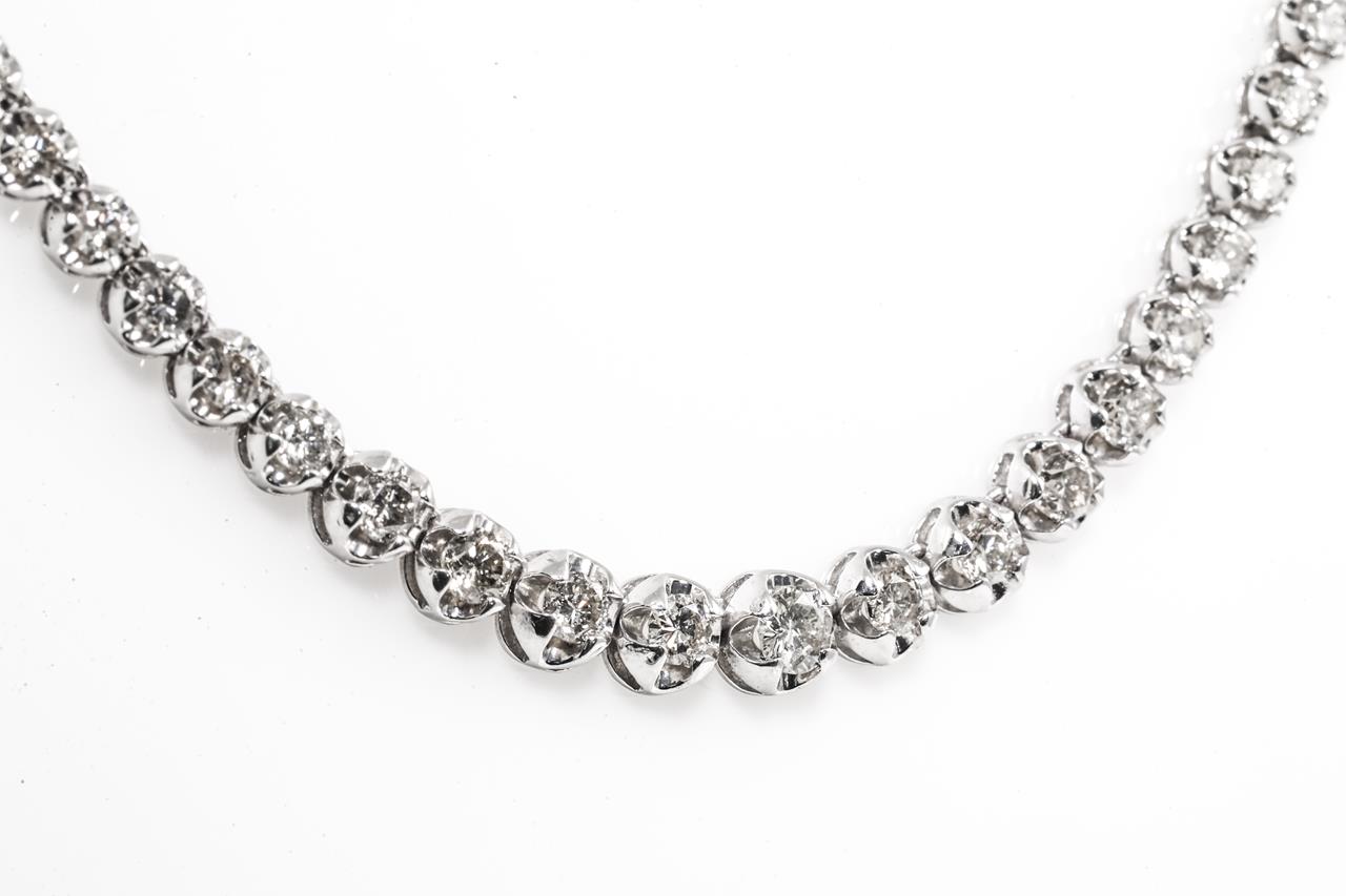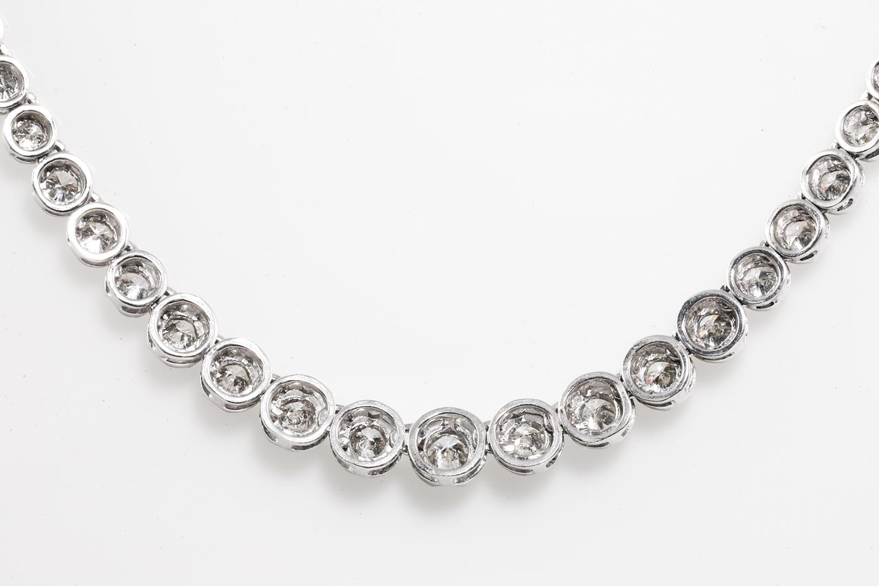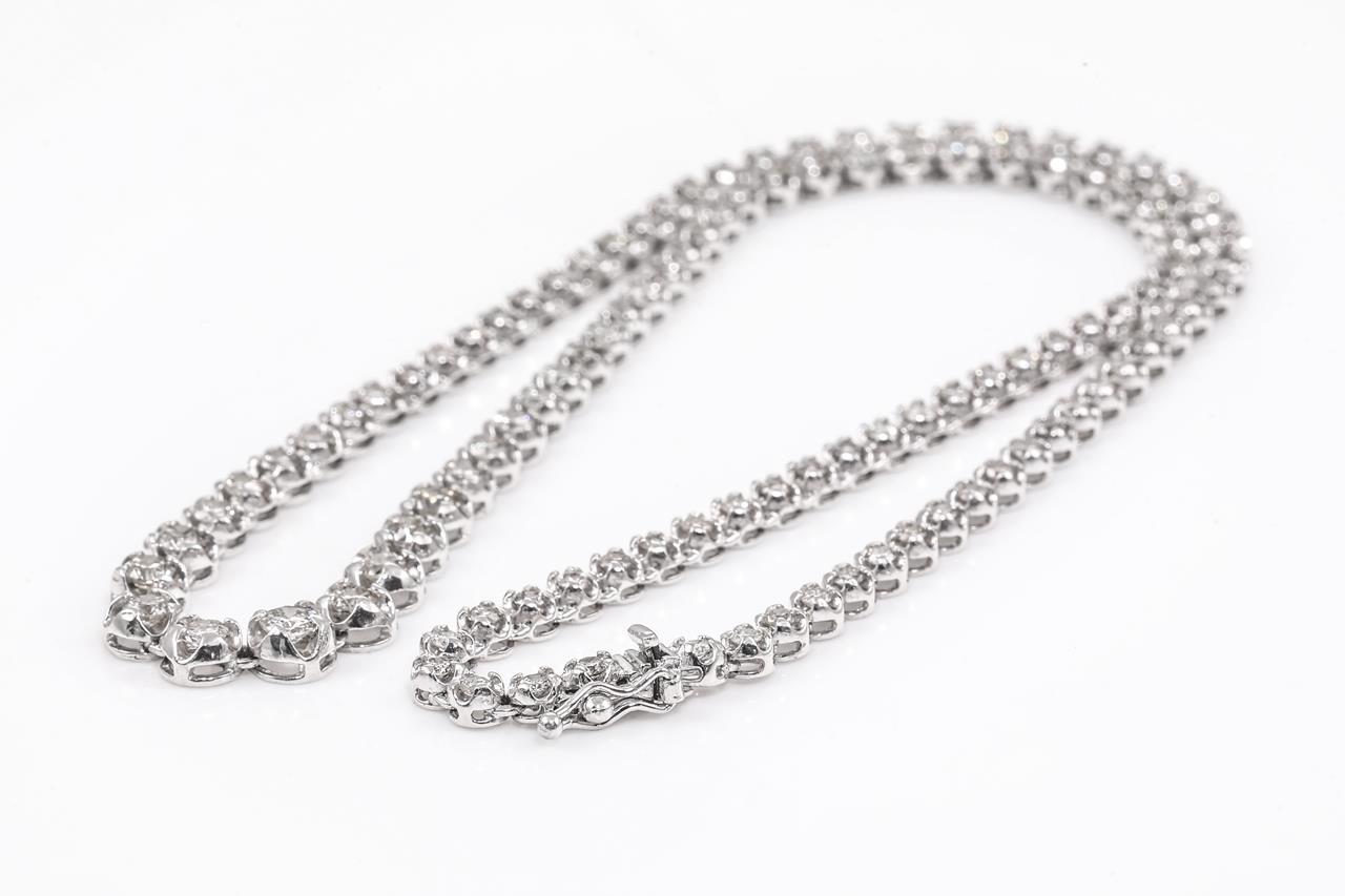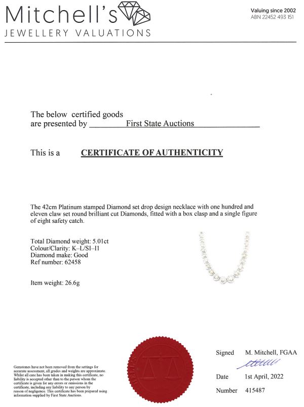 Diamond tennis necklace with round Diamonds totalling 5.01cts (Estimated grading: K-L SI-P1). Platinum. Length: 42cm. With Certificate #415487. Weight: 26.6g (Pre-owned)