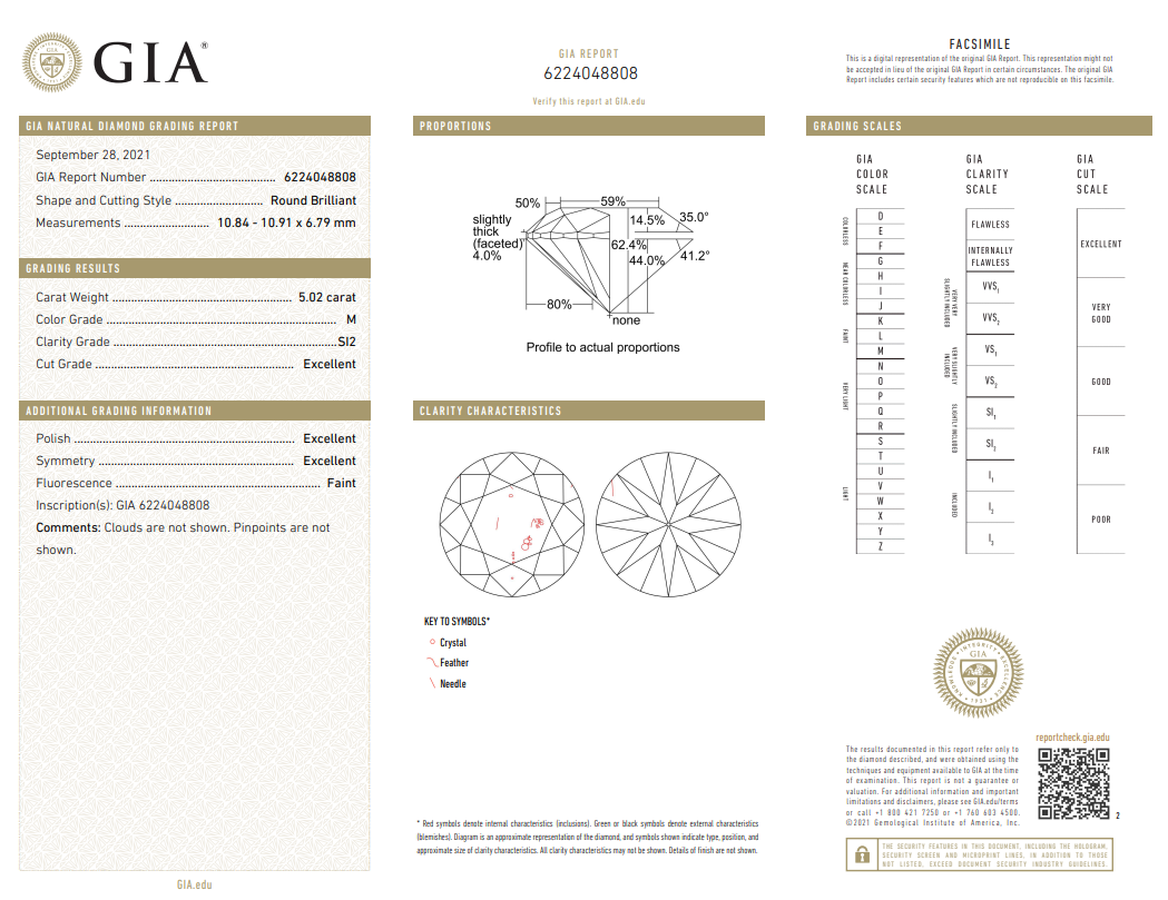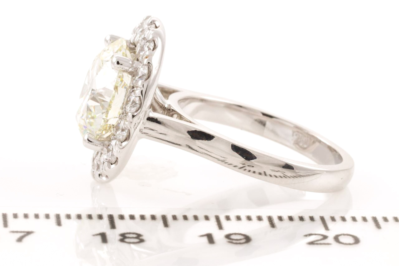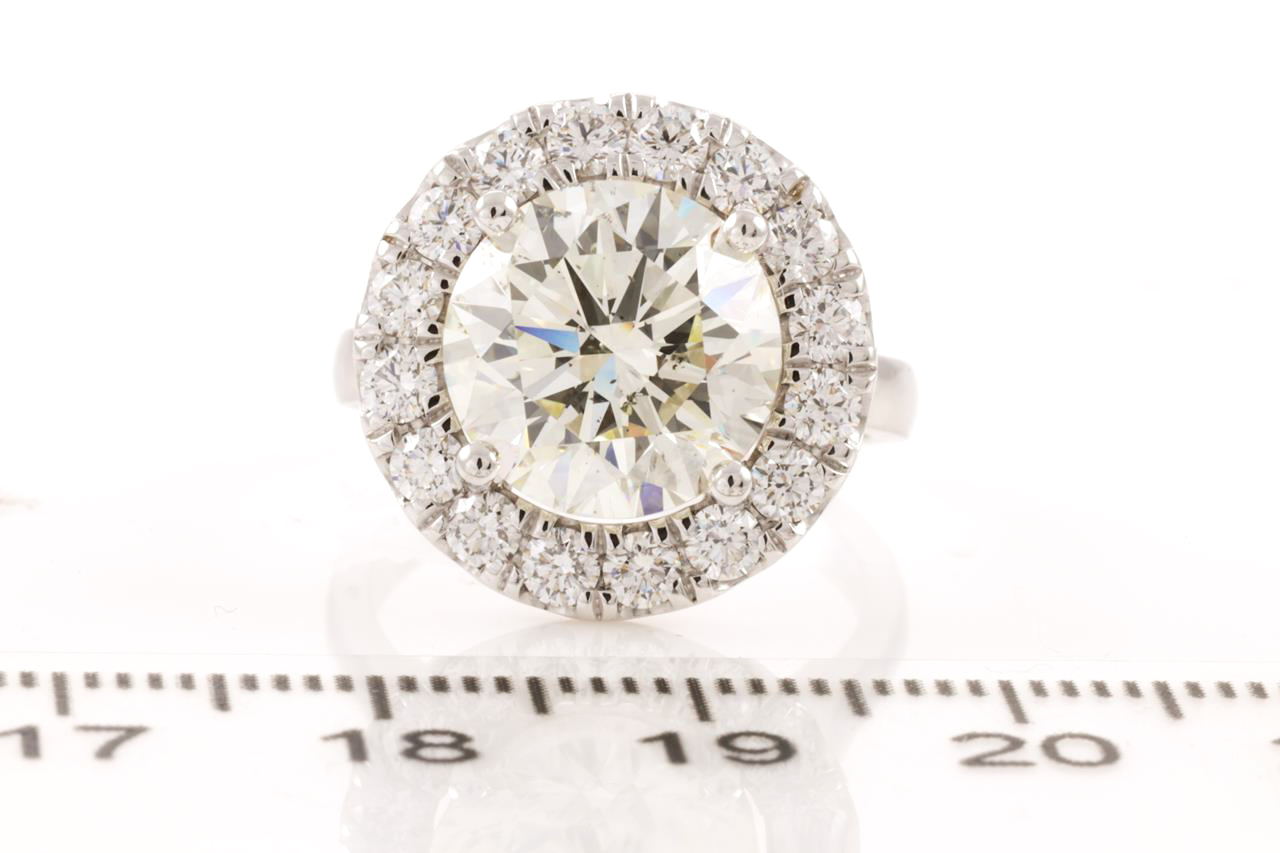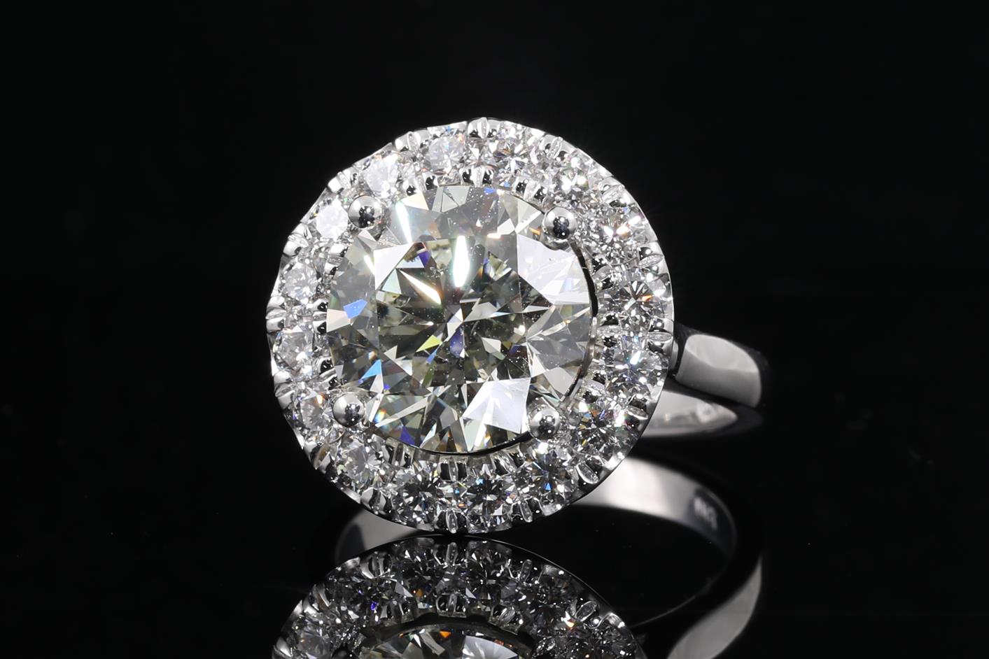 Diamond halo ring with round brilliant cut Diamond of 5.02ct (With GIA report graded as M SI2 #6224048808) with surrounding diamonds totalling 1.00cts (Estimated grading: F SI1). 18ct white gold. Ring size L. Weight: 9.1g (New)