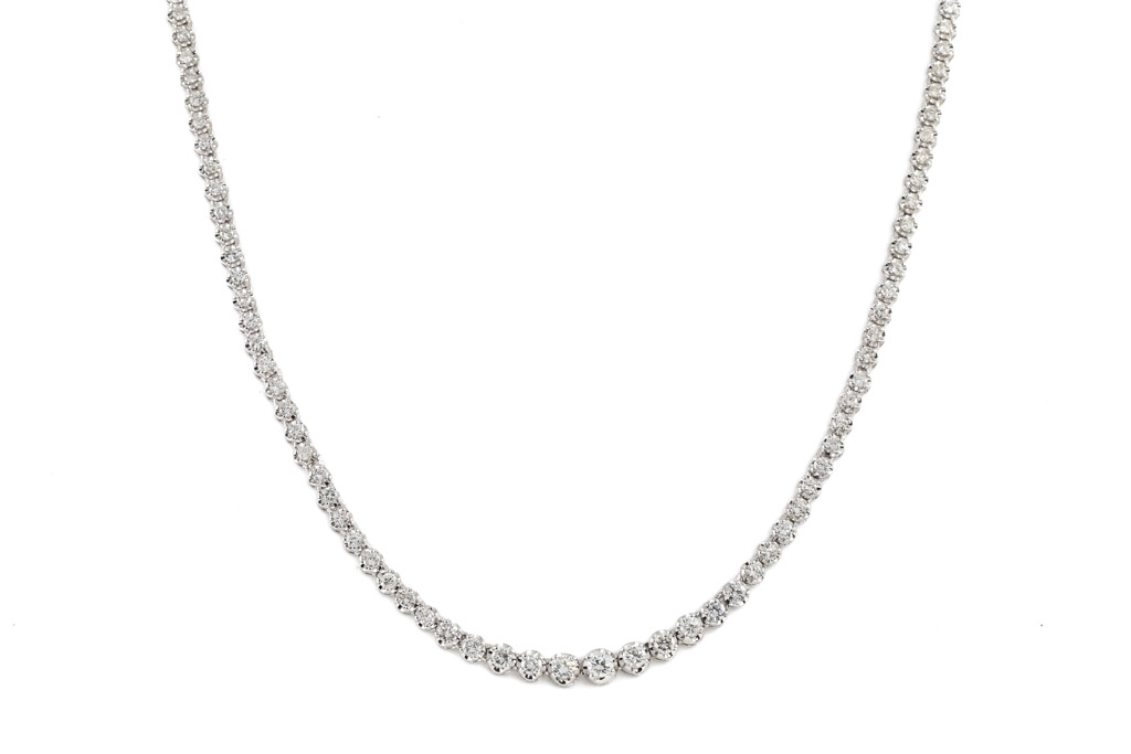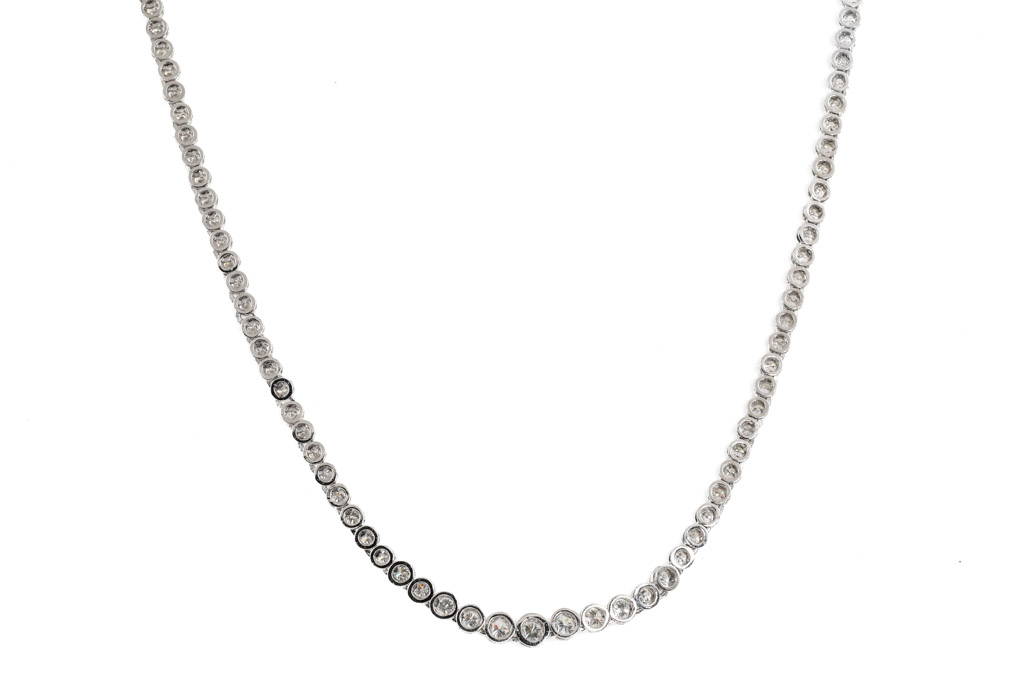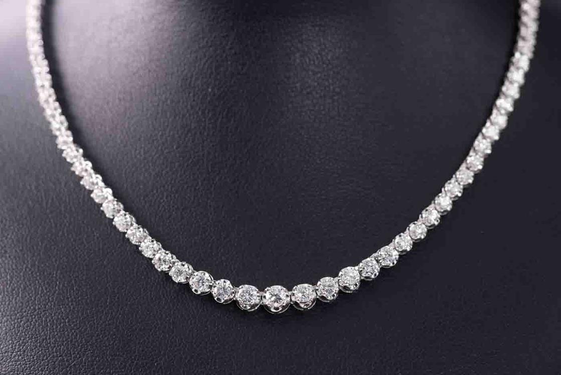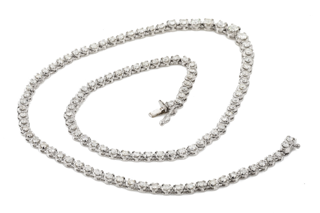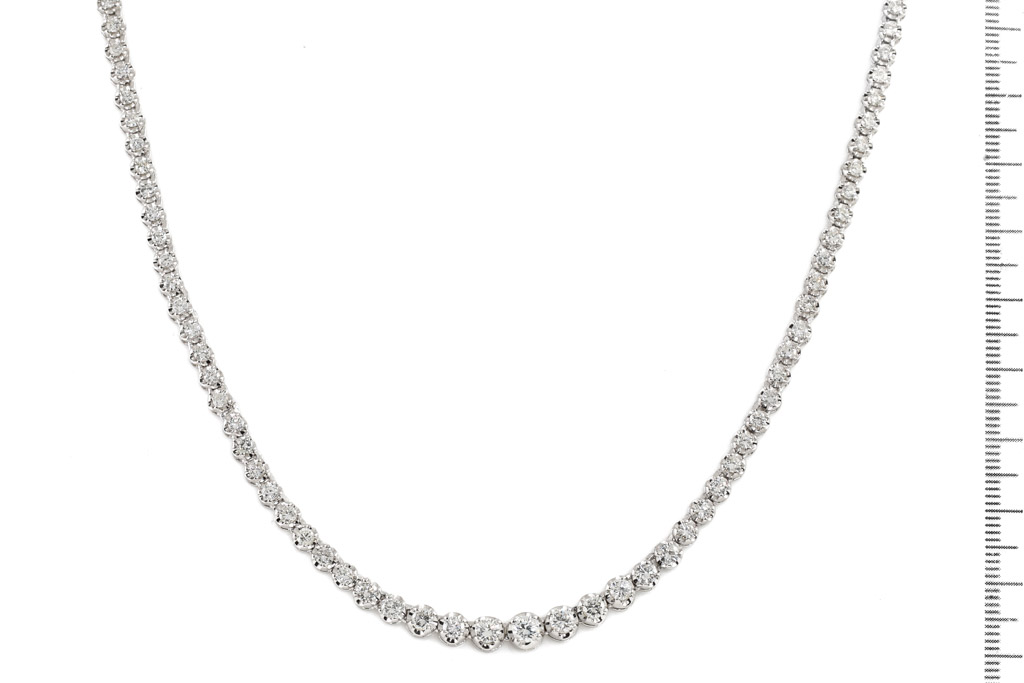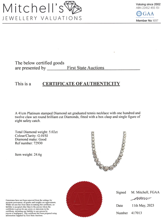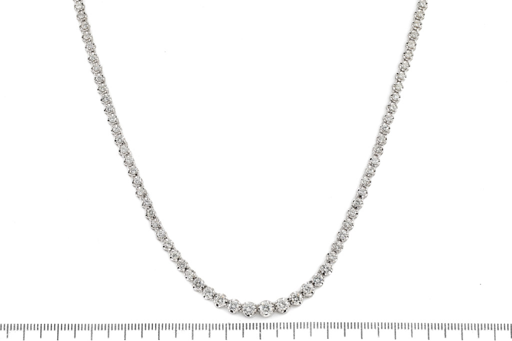 Diamond tennis necklace with Diamonds totalling 5.02cts (Estimated grading: G-H SI). Platinum. Length: 41cm. Weight: 24.6g. With certificate #417013. (Pre-owned)