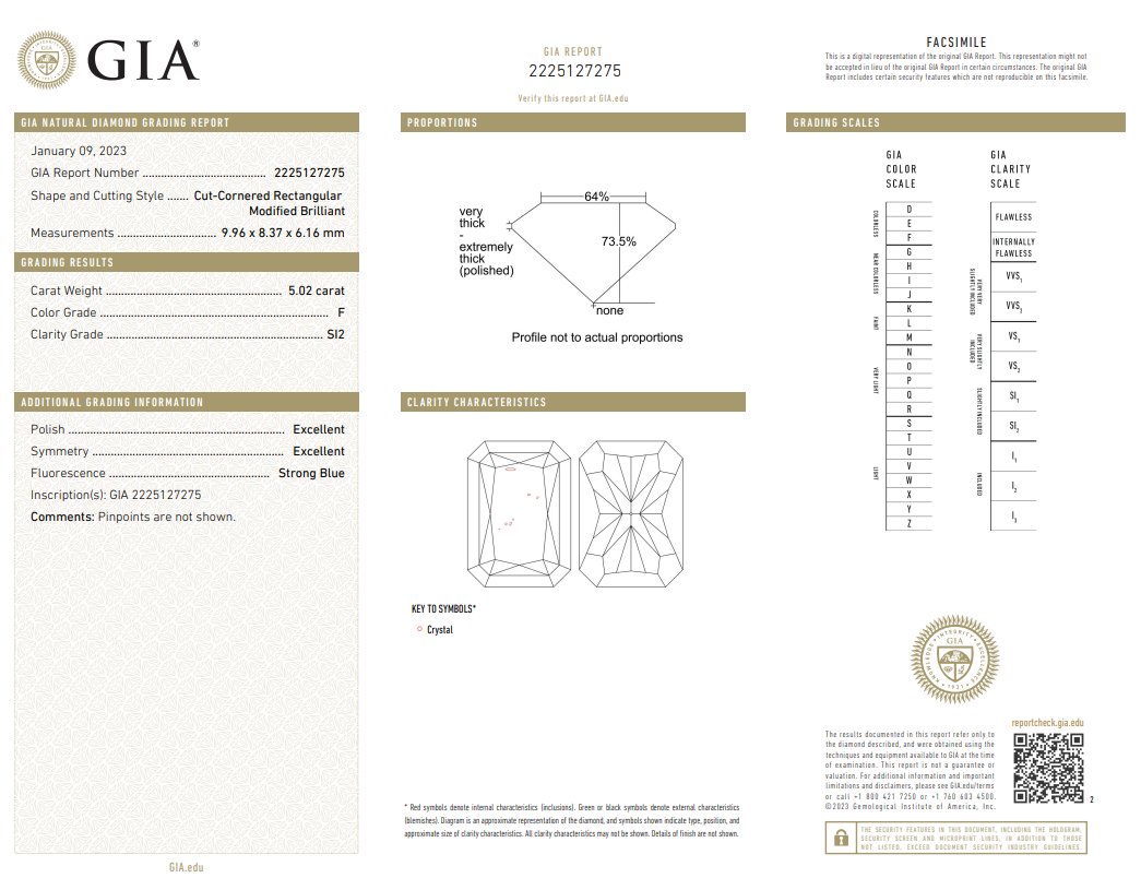 A loose radiant cut Diamond of 5.02ct (with GIA report graded as F SI2 #2225127275