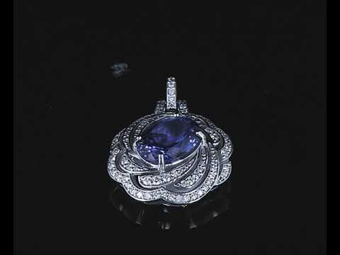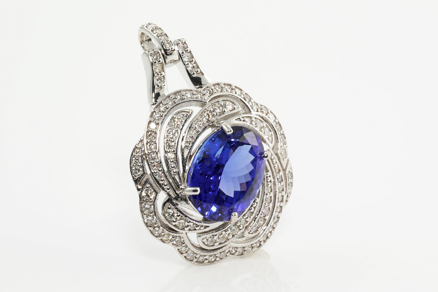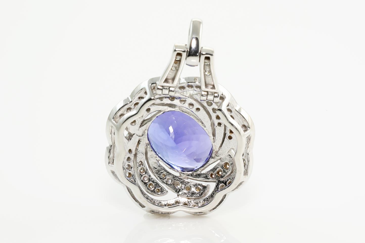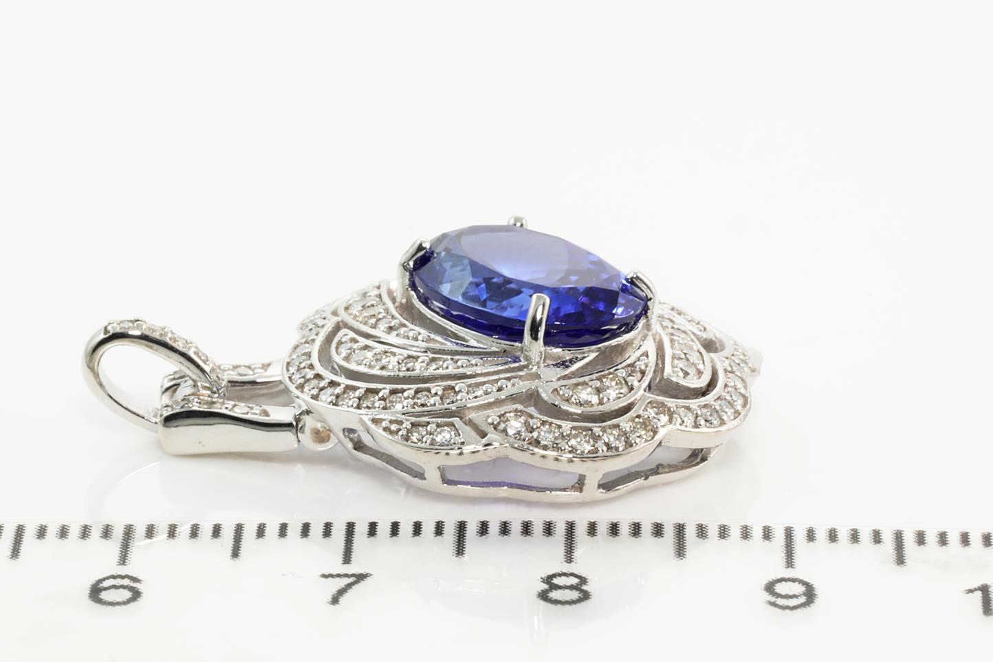 Tanzanite and Diamond pendant with an oval Tanzanite of 5.02ct and round Diamonds totalling 0.78cts (Estimated grading: I-J SI). 18ct white gold. No chain provided. Weight:1.9g (As New)