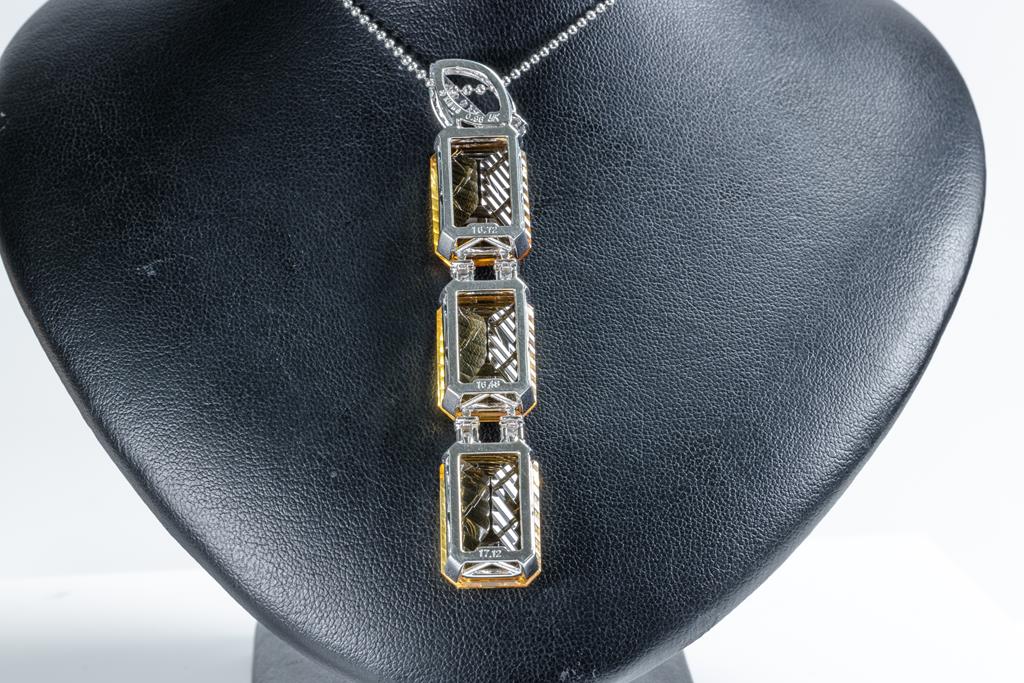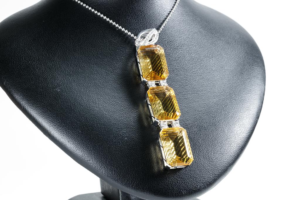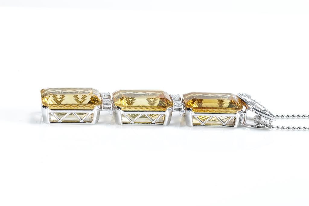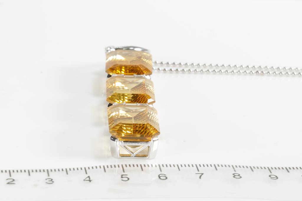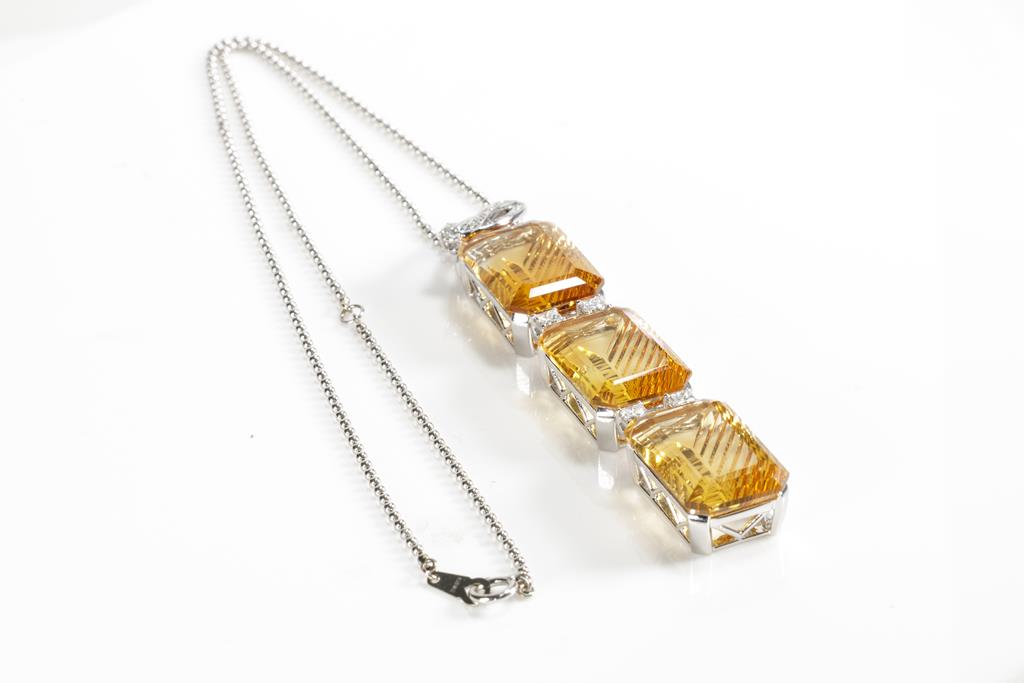 Tasaki Citrine and Diamond pendant with 3 emerald fancy cut Citrines totalling 50.32cts with round & princess cut Diamonds totalling 0.96cts (Estimated grading: G VS). 18ct white gold with adjustable 45cm unbranded chain. Weight: 28.9g. With certificate #415886. (Pre-owned)