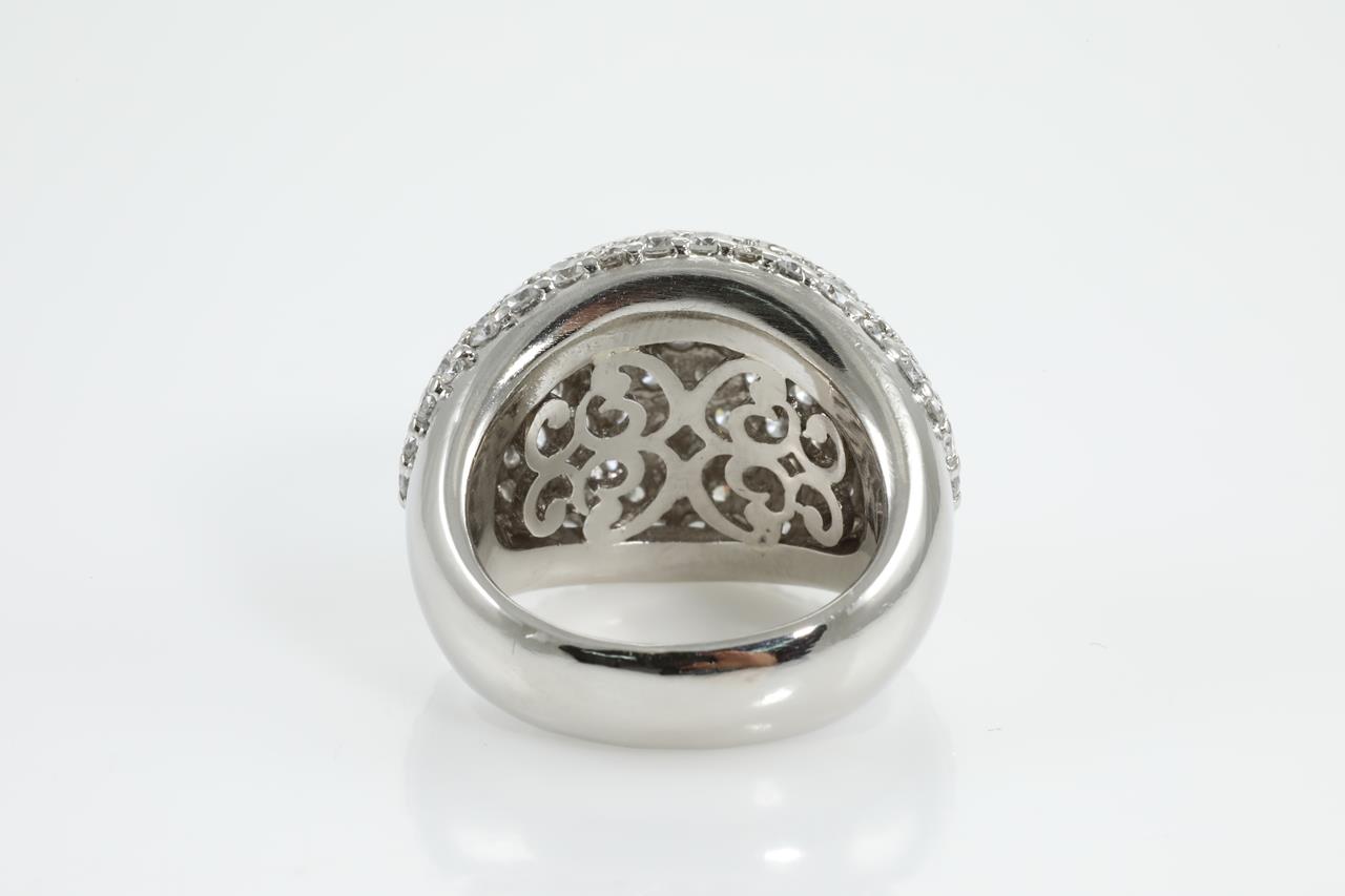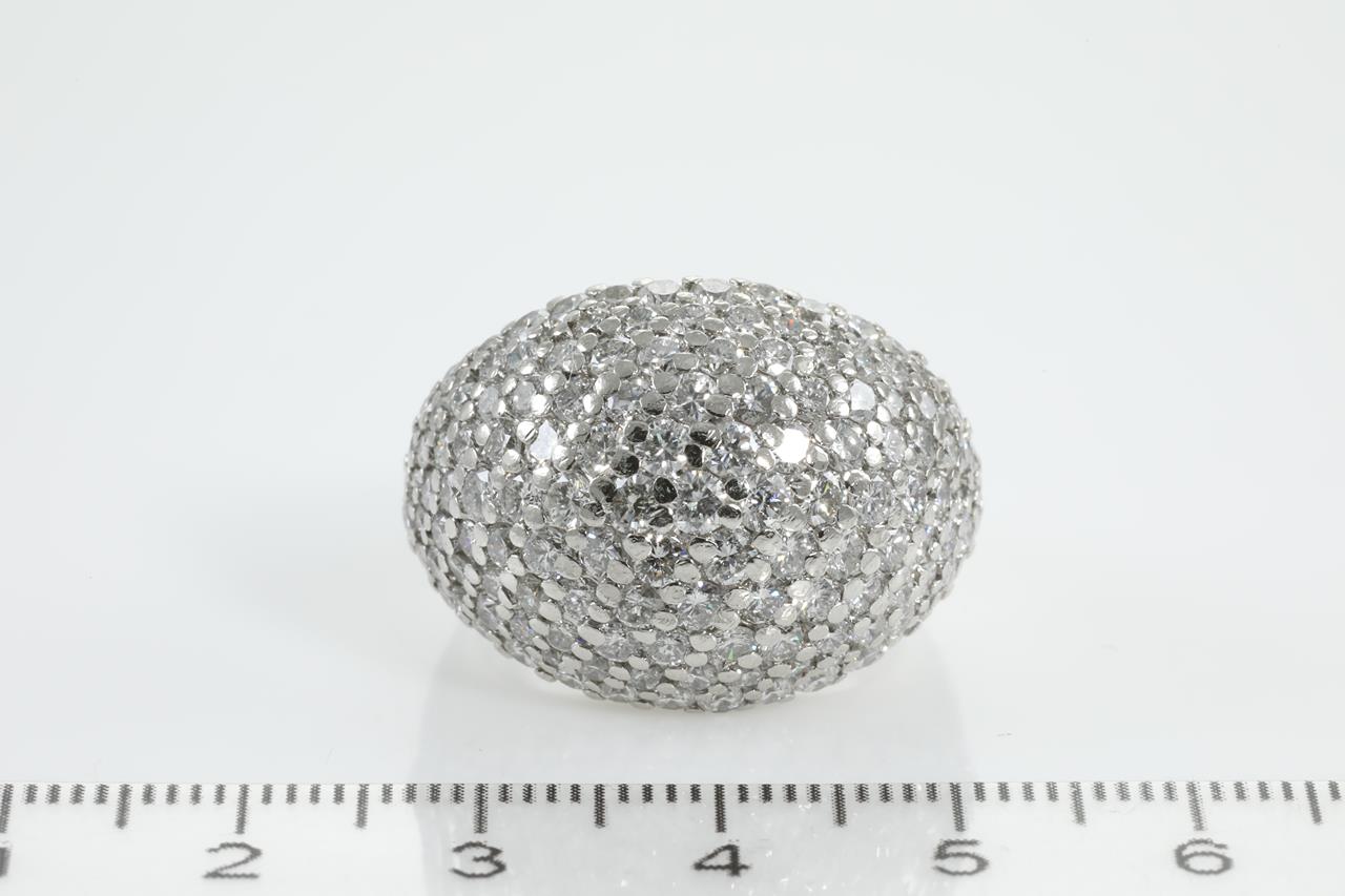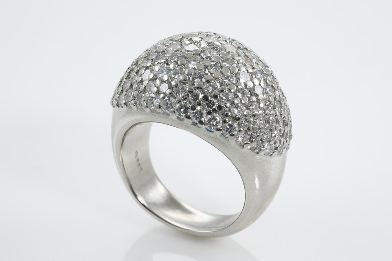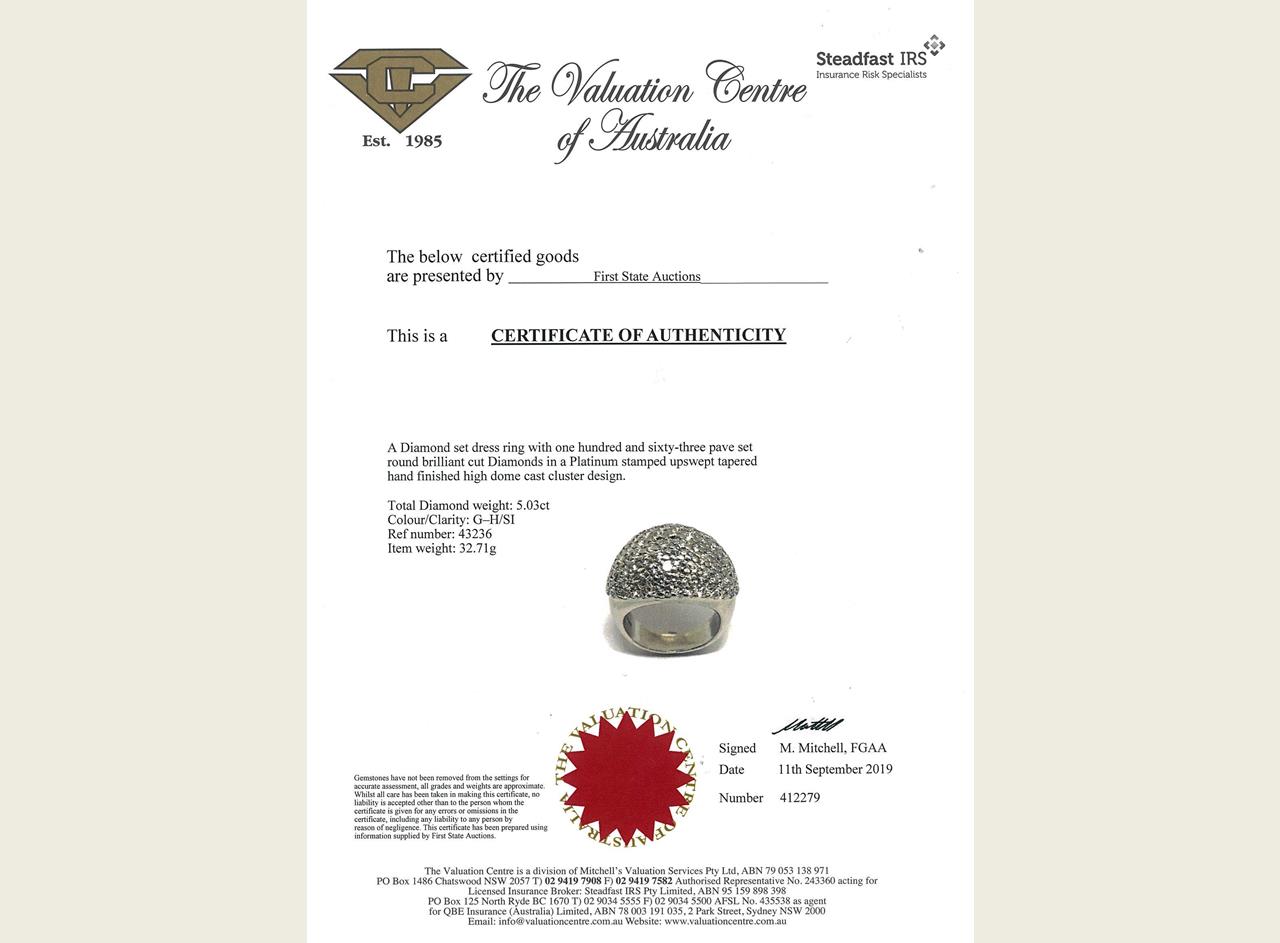 Diamond dress ring with round Diamonds totalling 5.03cts (Estimated grading: G-H SI). Platinum. Ring size O. With certificate #412279. Weight: 32.7g. (Pre-owned)