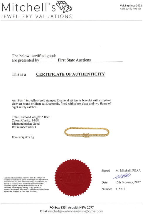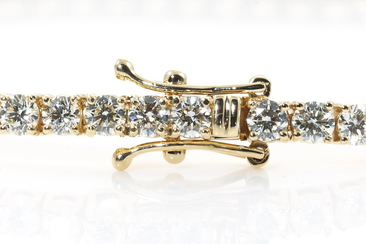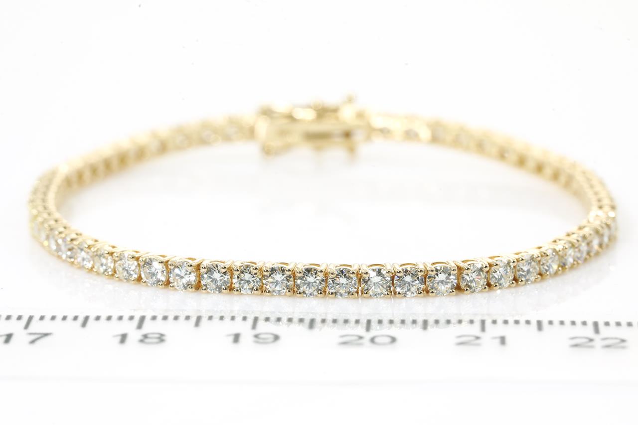 Diamond tennis bracelet with 62 round Diamonds totalling 5.03cts (Estimated grading: I-J SI). 18ct yellow gold. Length: 18cm. Weight: 9.8g. With certificate #415217. (New)