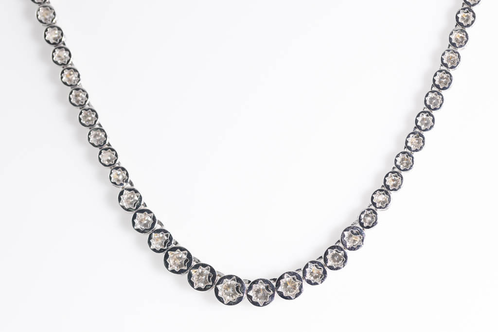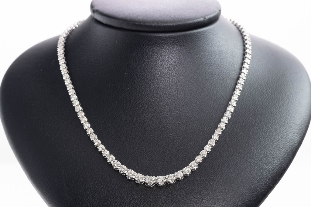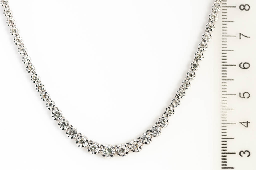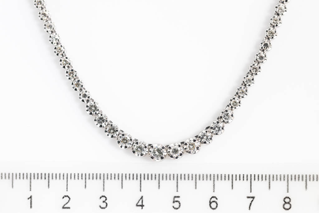 Diamond tennis necklace with graduated round Diamonds totalling 5.03cts (Estimated grading: J-K SI). 18ct white gold. Length: 43cm. Weight: 20.8g. With Certificate #416947. (Pre-owned)
