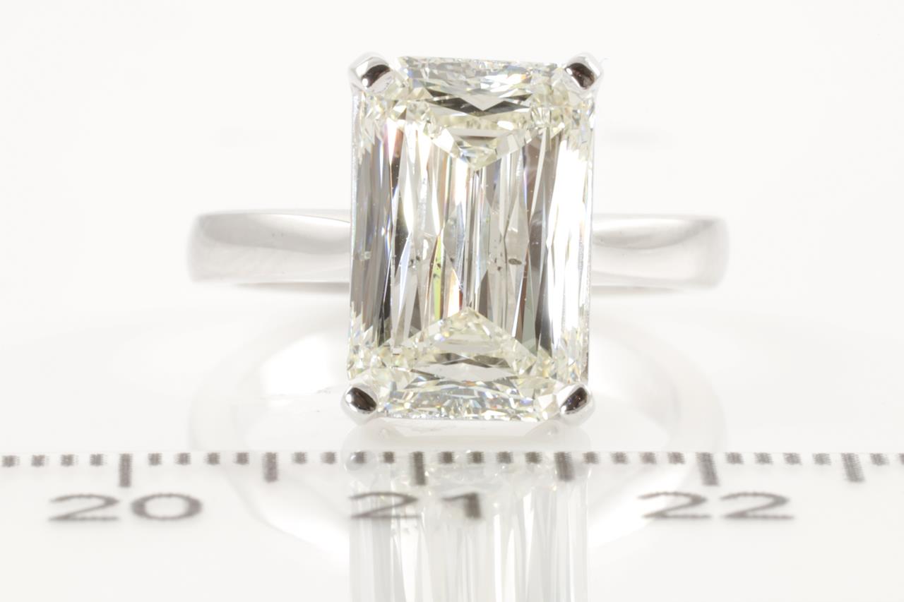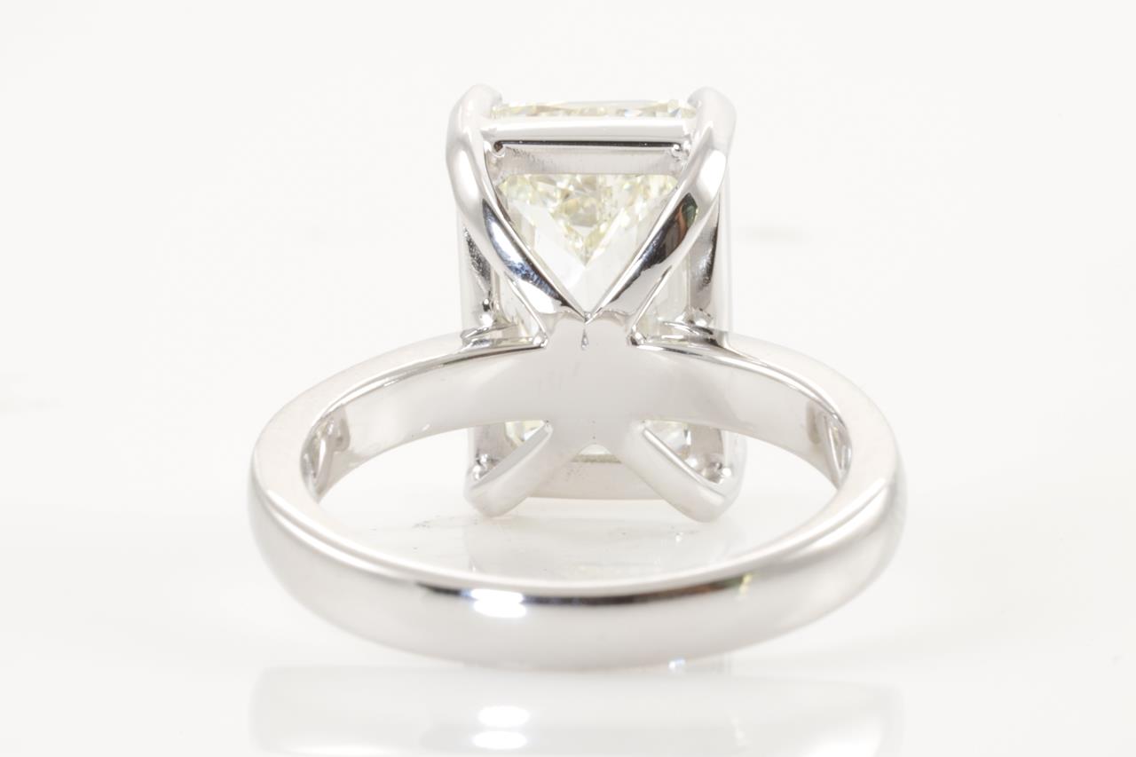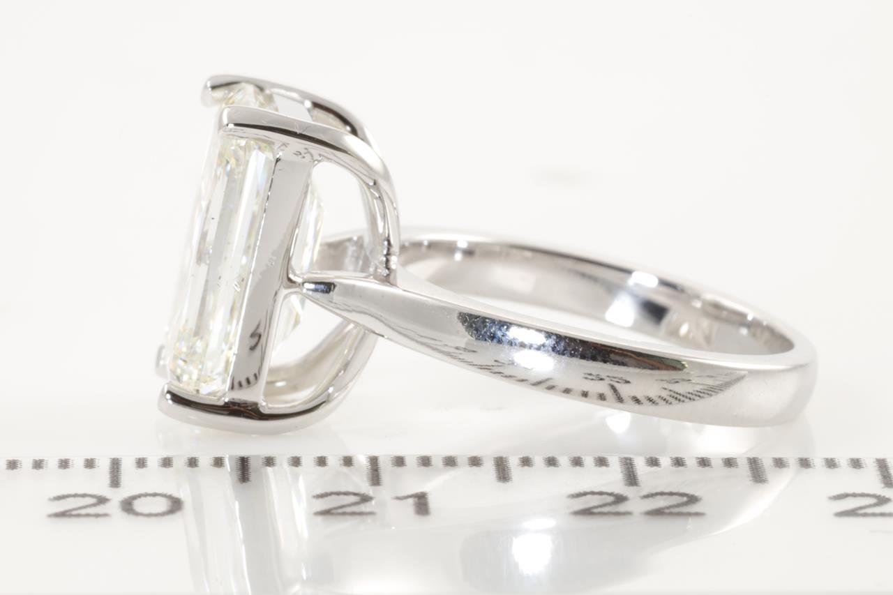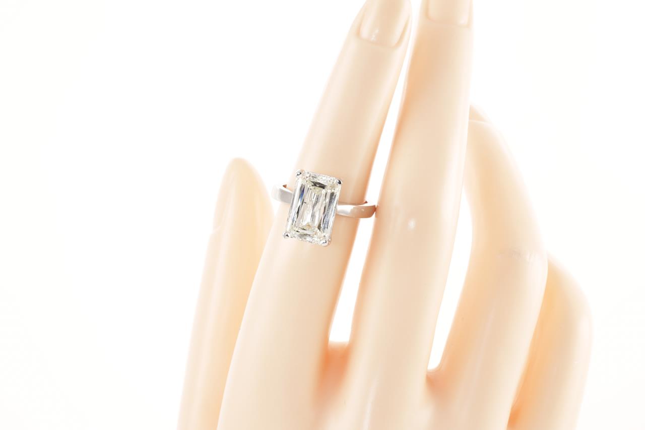 Diamond Solitaire ring with an emerald cut Diamond of 5.03ct (with copy of GIA report graded K SI2 #2205768141) set in 18ct white gold ring. Ring size K1/2. Weight: 7g (Pre-owned)