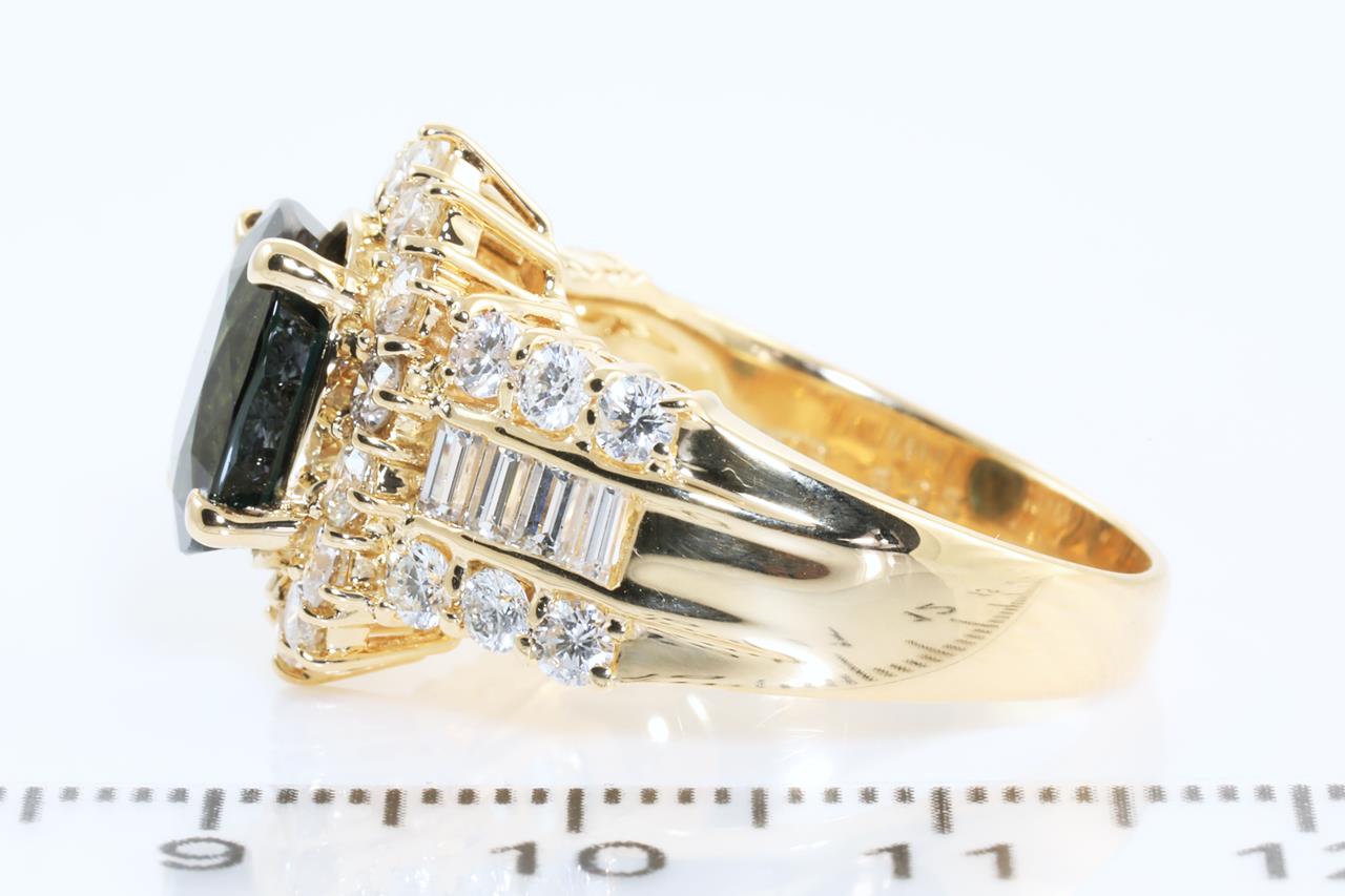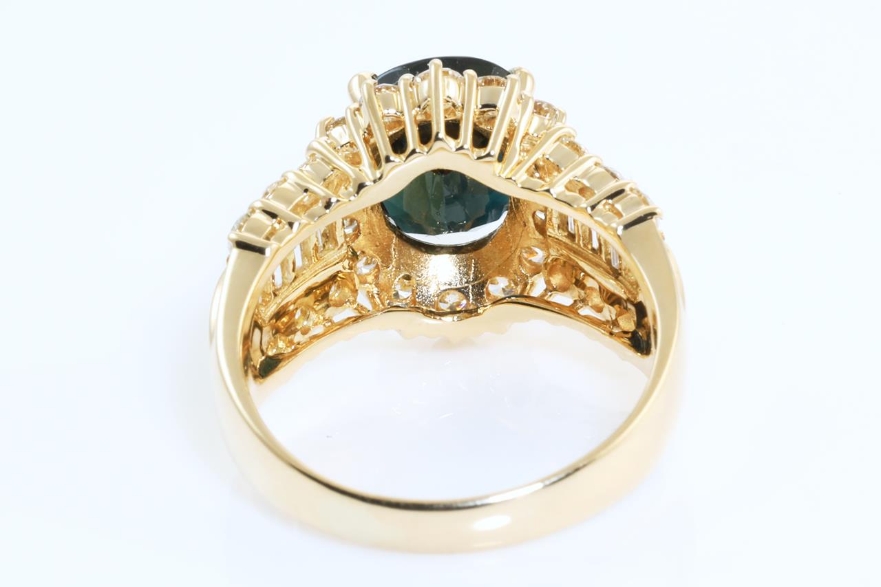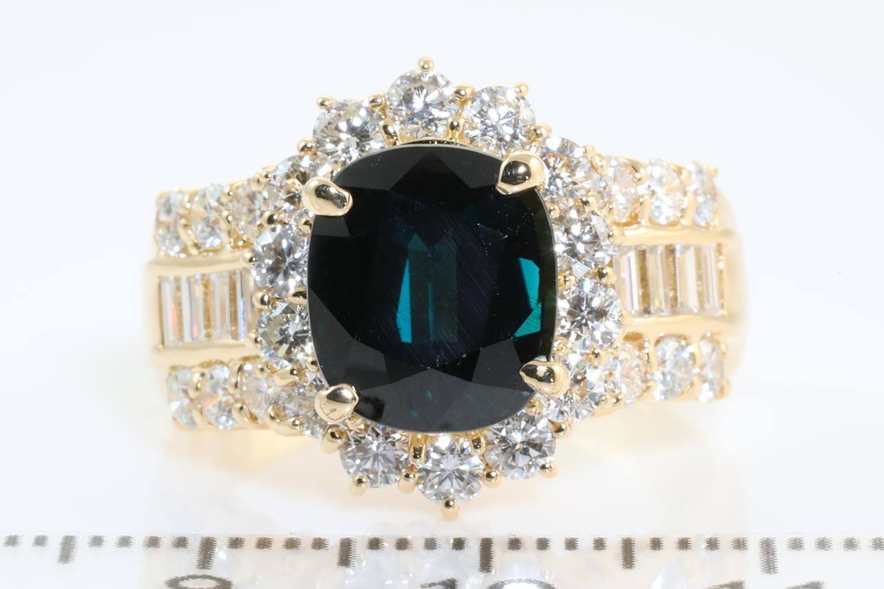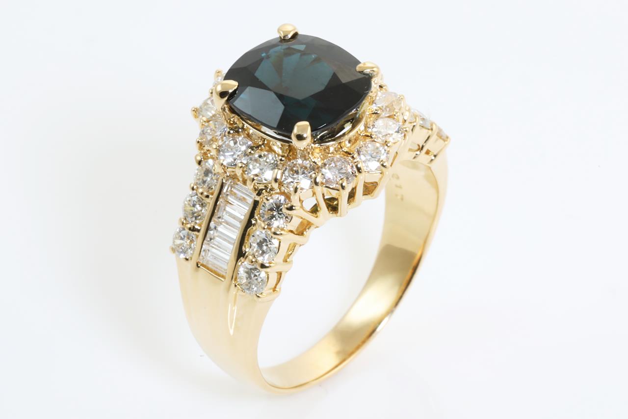 Sapphire and Diamond ring with an oval Sapphire of 5.03ct with baguette and round Diamonds totalling 2.17cts (Estimated grading: FGH VS-SI). 18ct yellow gold. Ring size: Q1/2. Weight: 10.4g With Certificate# 4387. (Pre-owned)