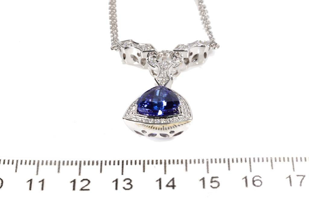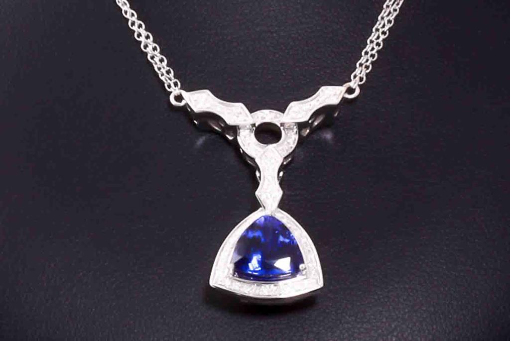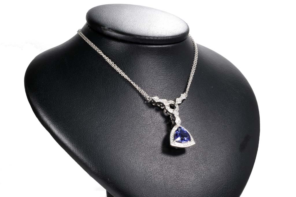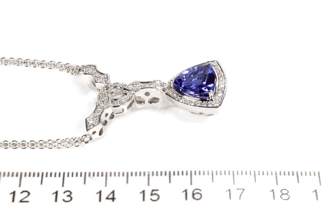Tanzanite and Diamond necklace with a trilliant cut Tanzanite of 5.03ct and round Diamonds totalling 0.52cts (Estimated grading: H-I SI). 14ct white gold with 14ct white gold attached double chain. Length: 48cm. Weight: 14.6g. With Certificate #415795. (AS new)