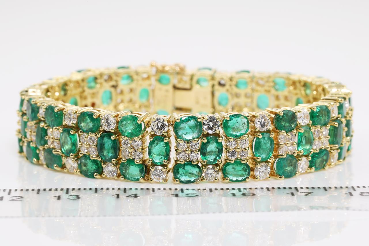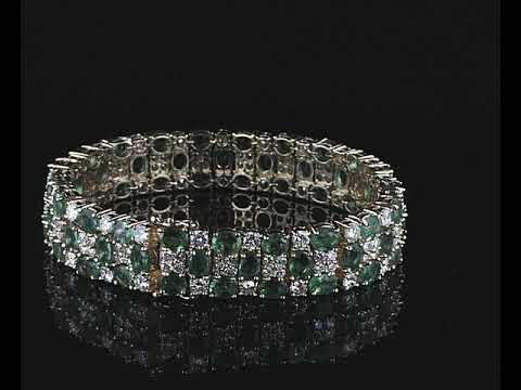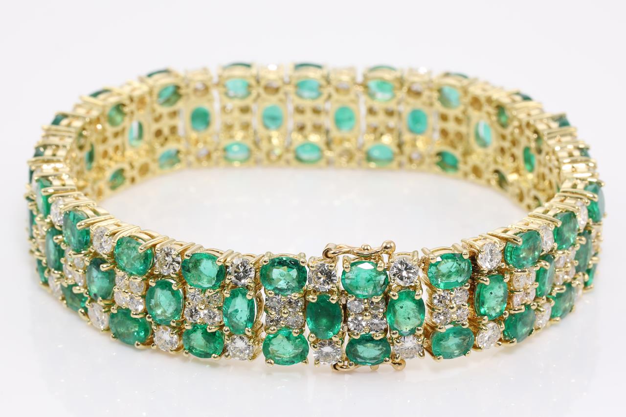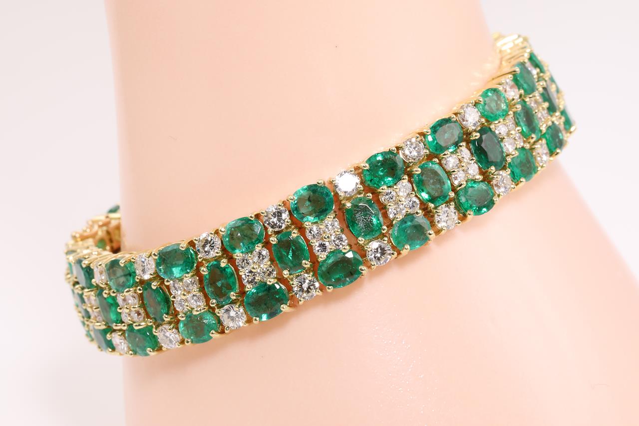 Emerald and Diamond bracelet with oval Emeralds totalling 50.50cts and Diamonds totalling 7.35cts (Estimated grading: G SI). 18ct yellow gold. Length: 18cm. Weight: 50.7g. With certificate #414450. (Pre-owned)