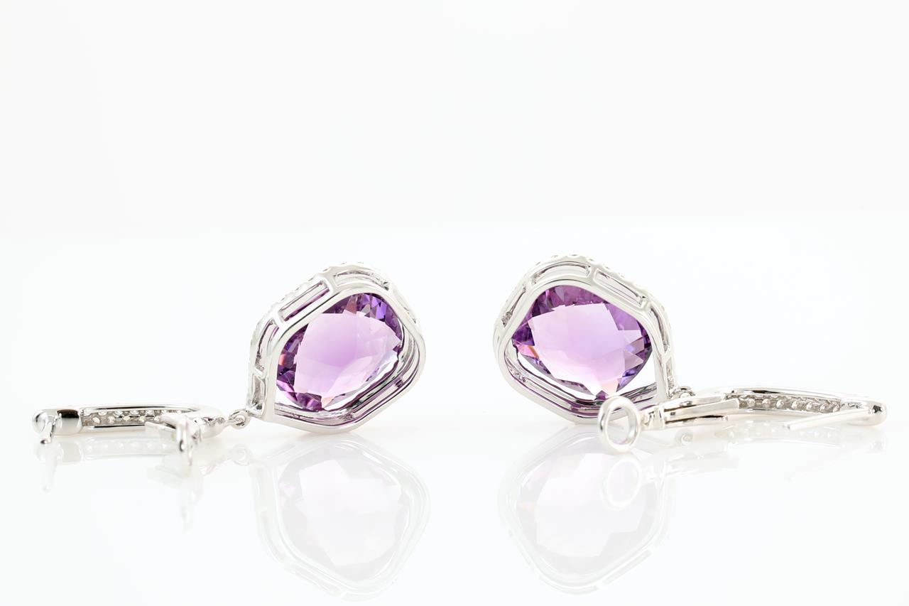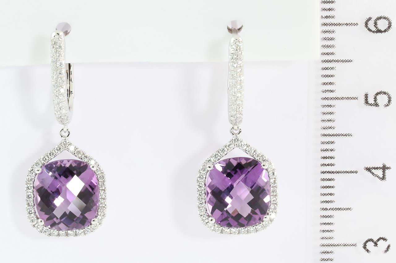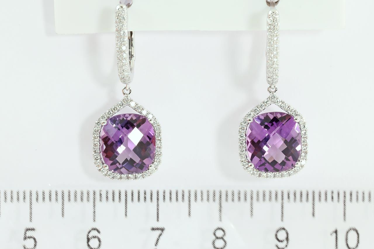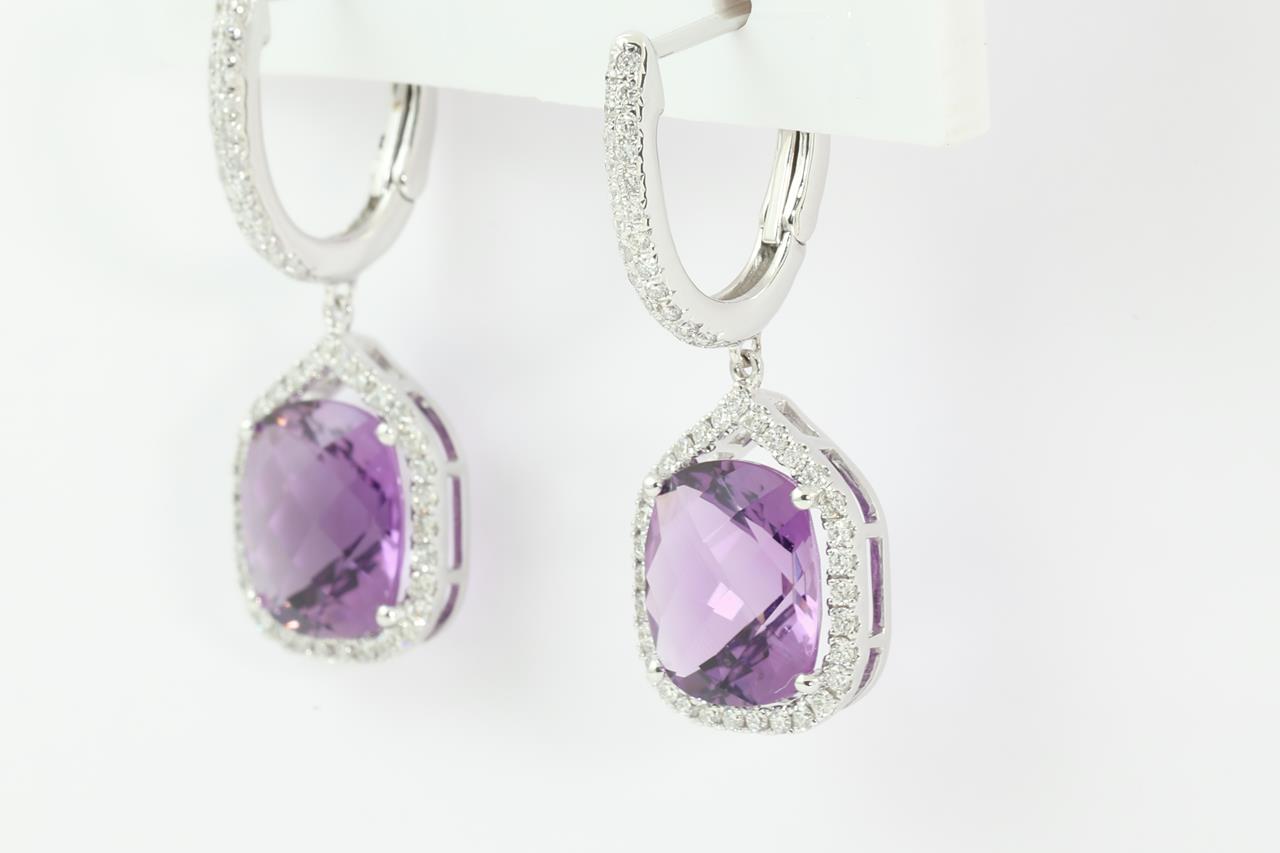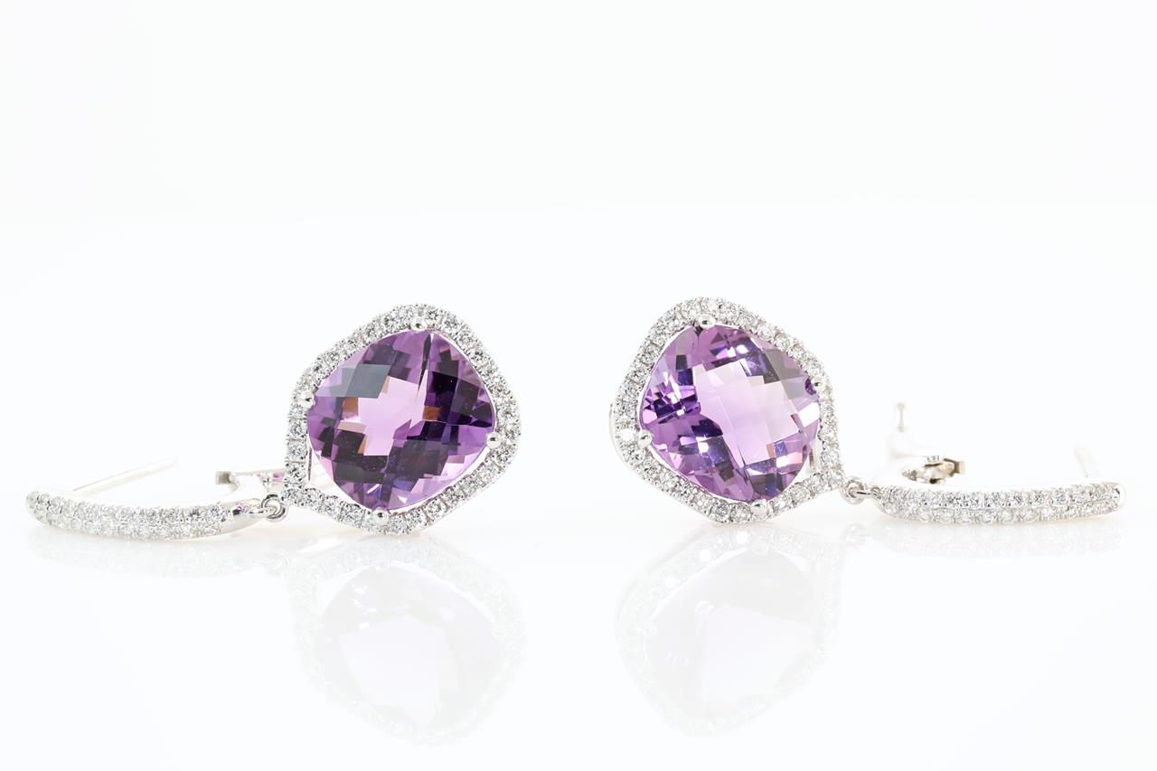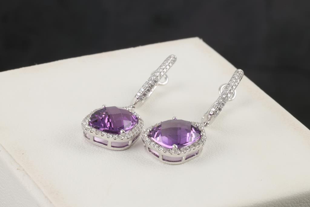 Amethyst and Diamond earrings with cushion checkerbord cut Amethyst of 5.05ct and Diamonds totalling 0.49cts (Estimated grading: H SI). 14ct white gold. Weight: 4.0g (New)
