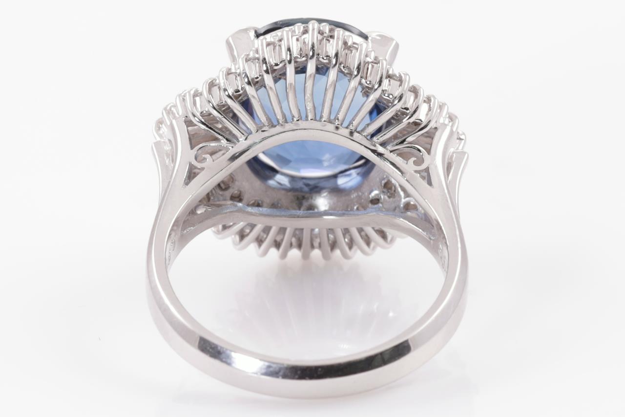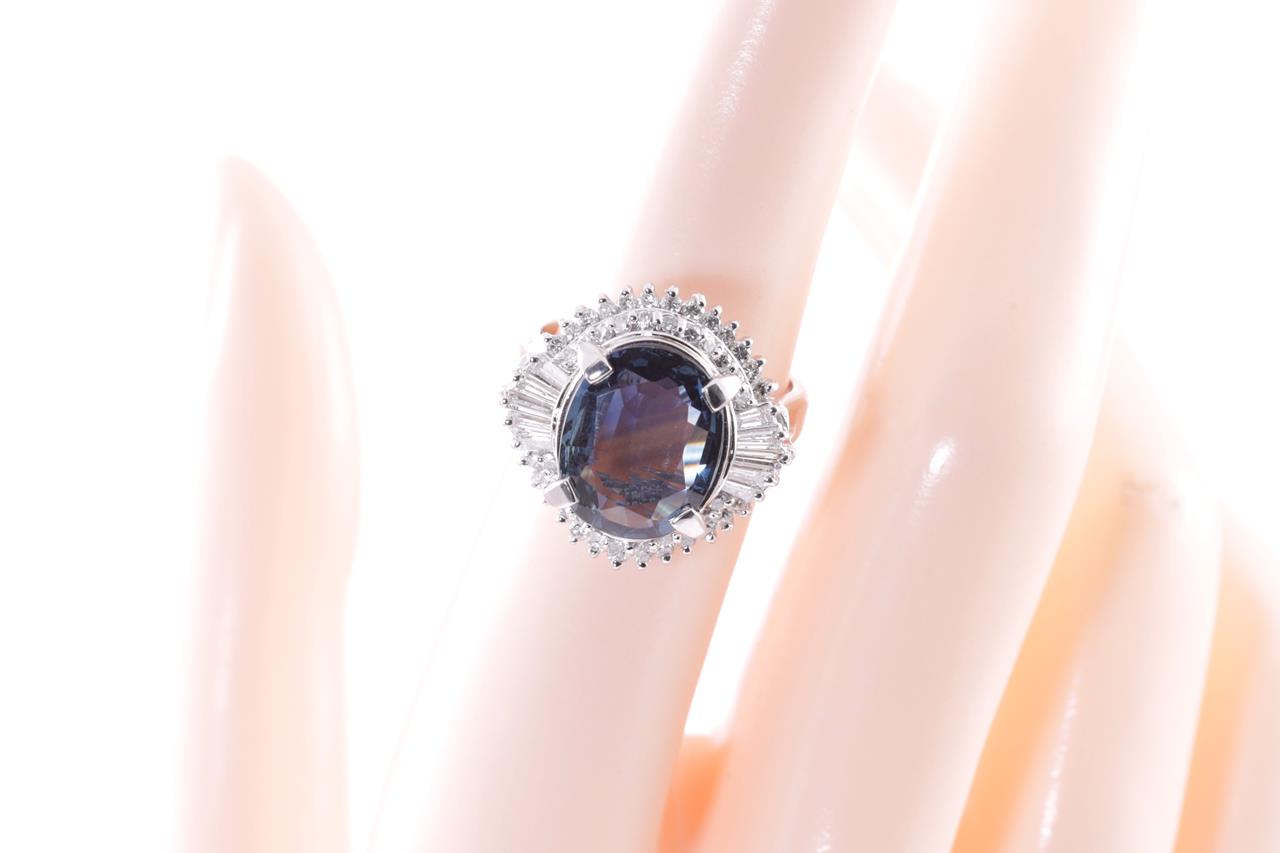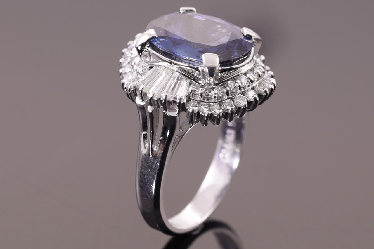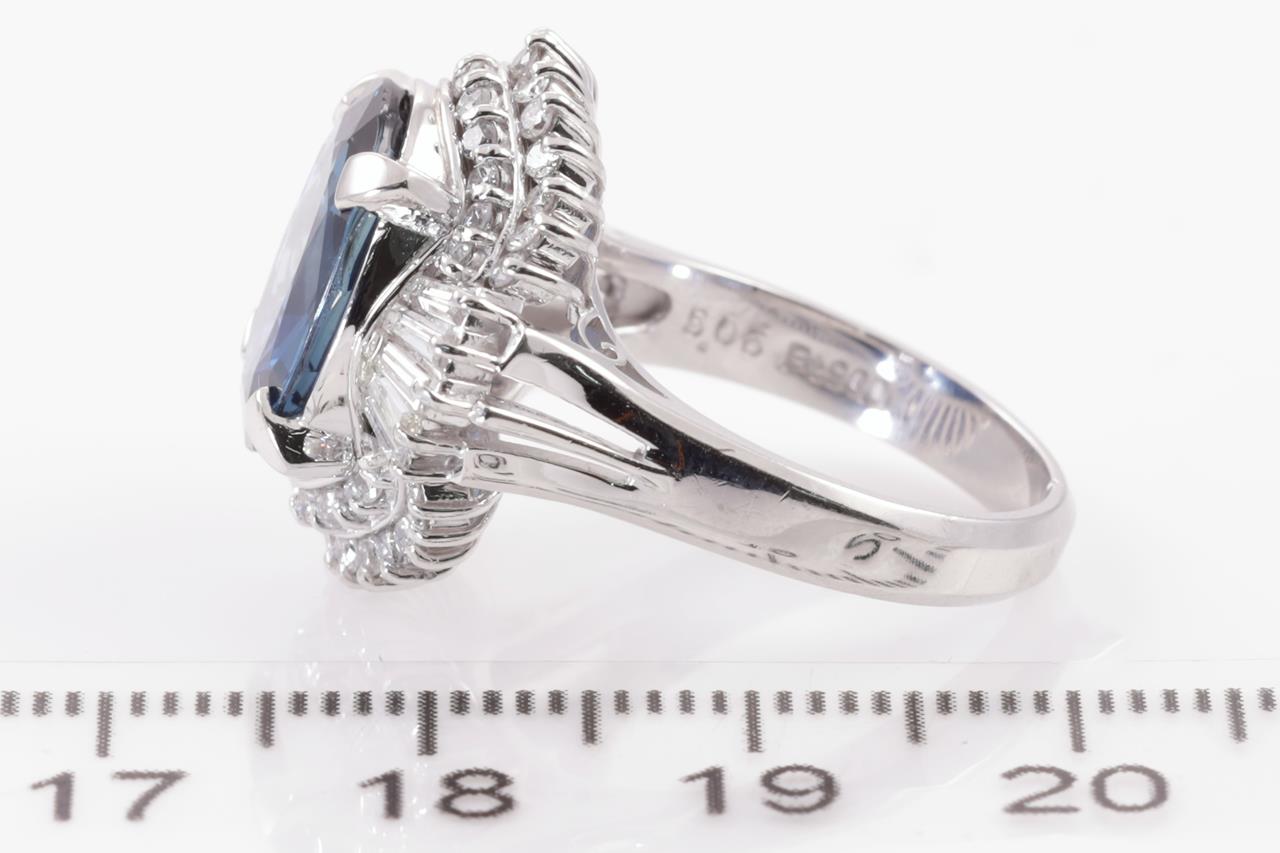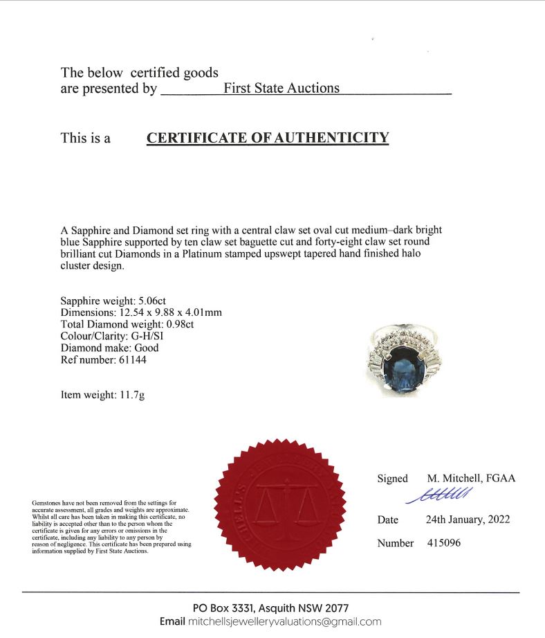 Sapphire and Diamond ring with an oval cut blue Sapphire of 5.06ct and Diamonds totalling 0.98cts (Estimated grading: G-H SI). Platinum. Ring size L. With certificate #415096. Weight: 11.7g. (Pre-owned)