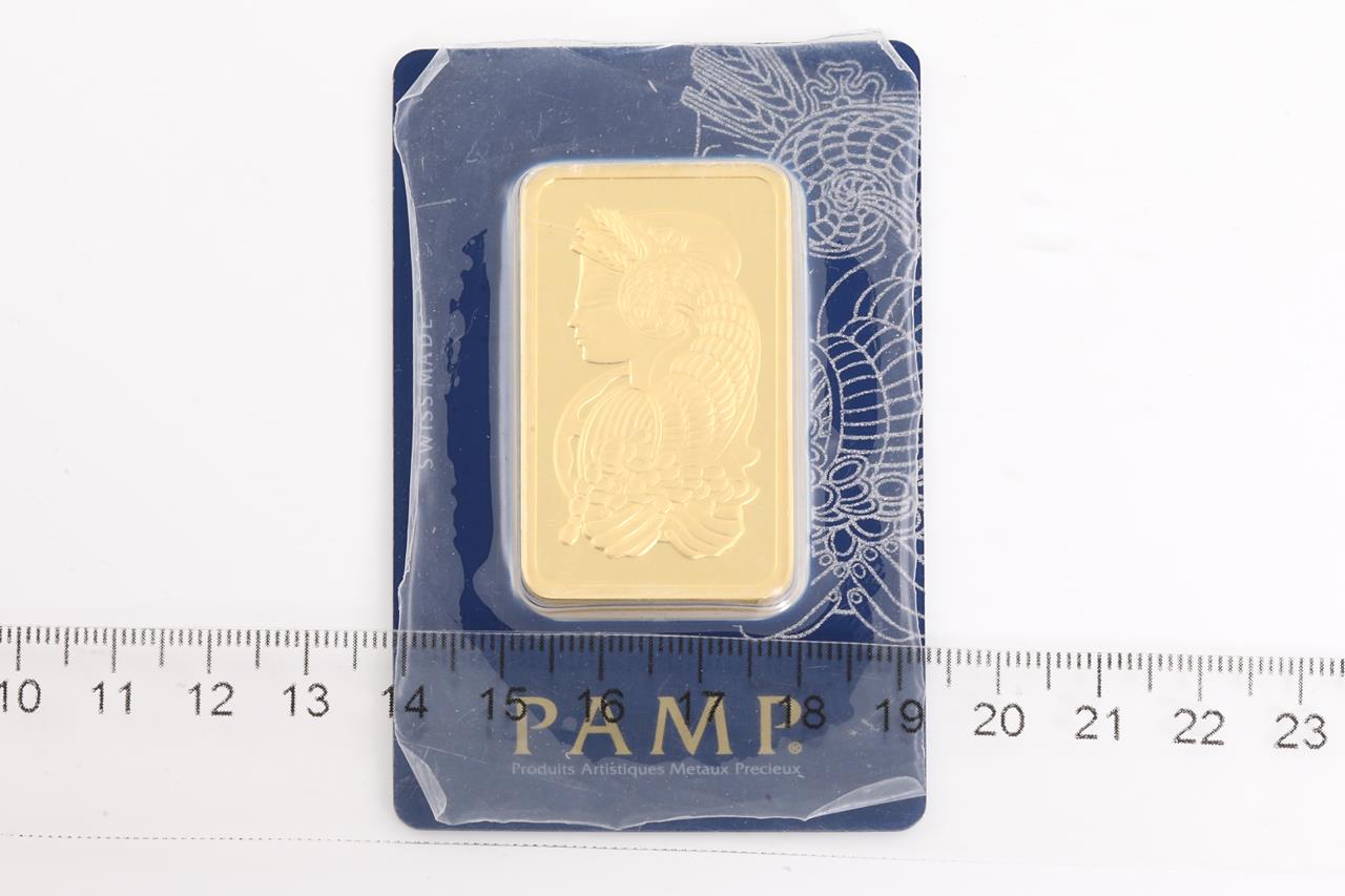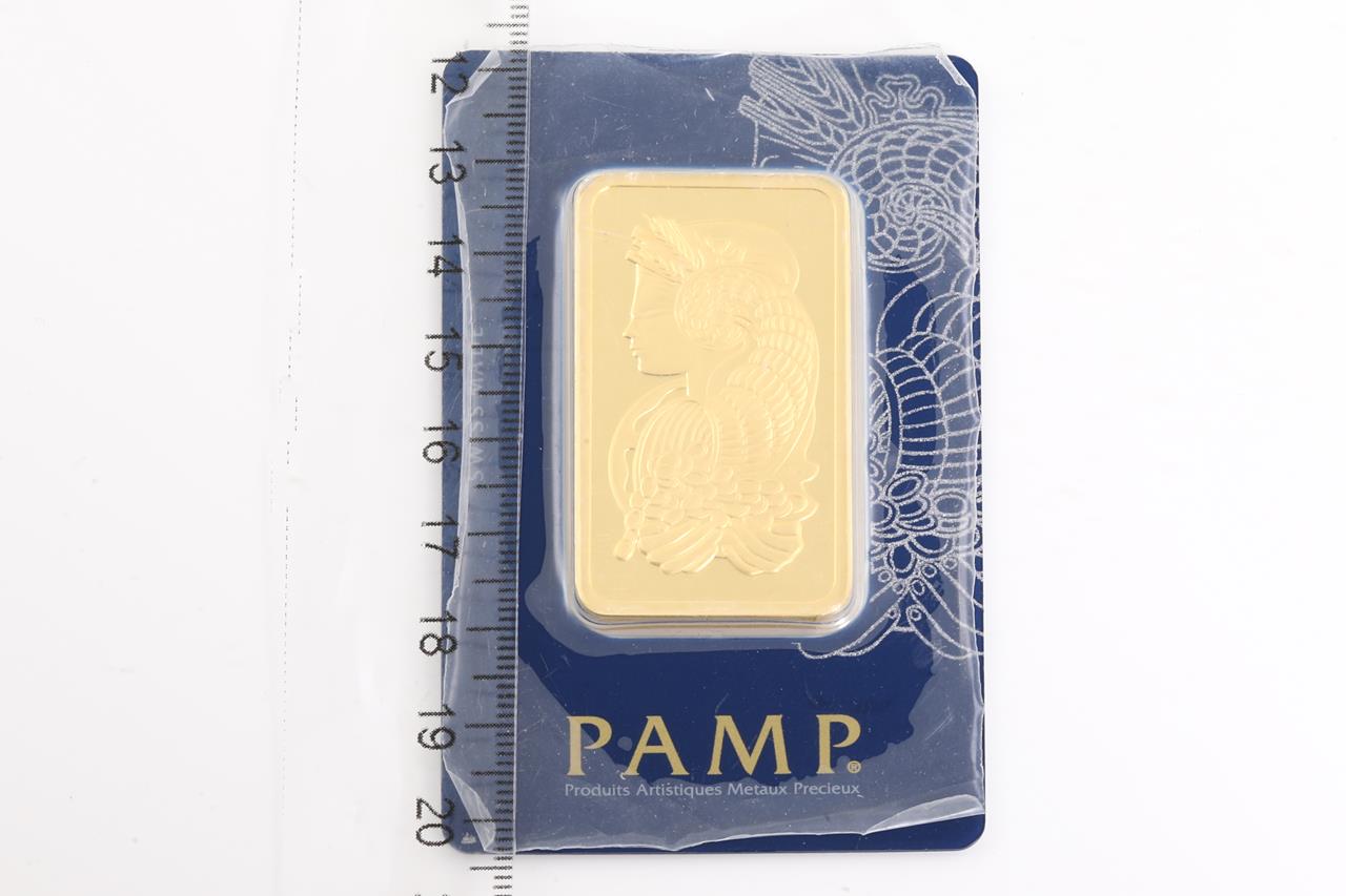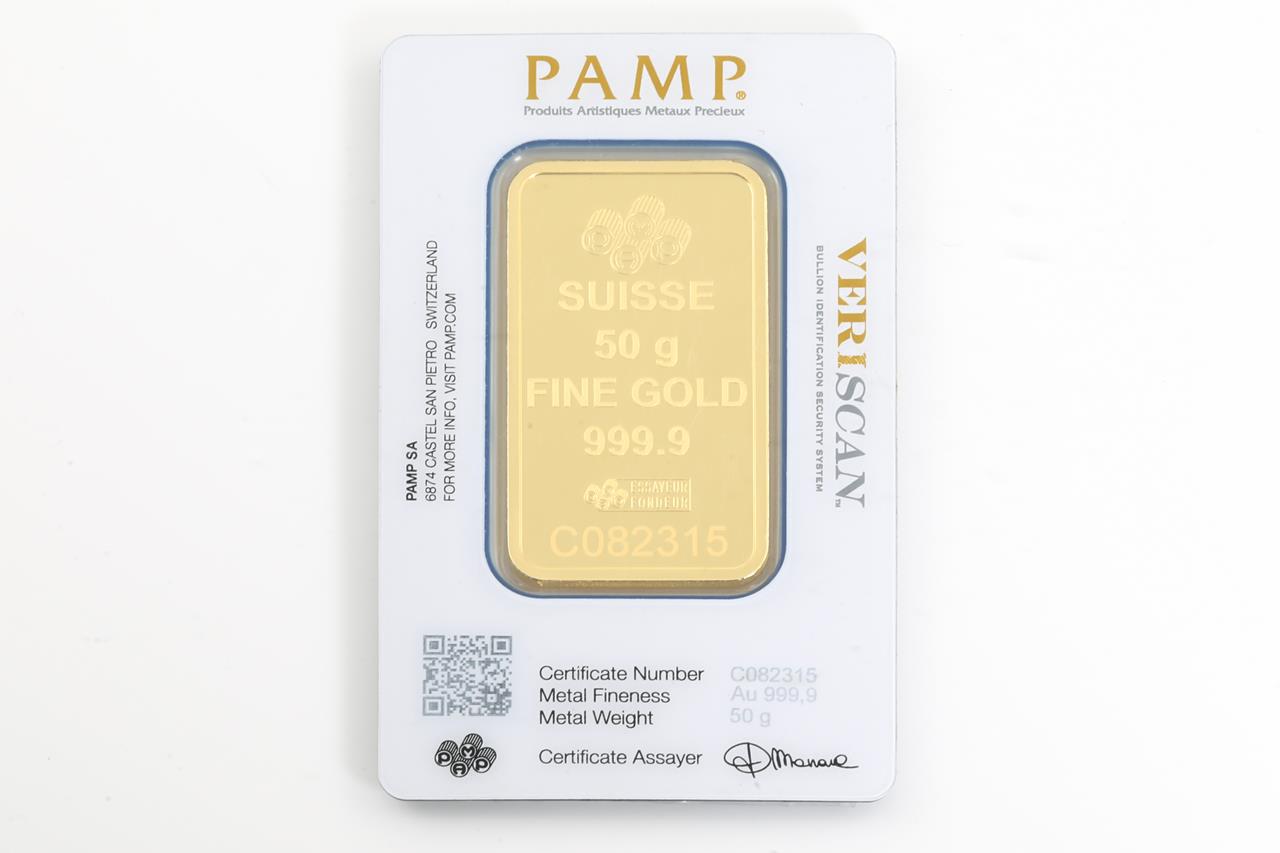 A PAMP Fine Gold Bar. Weight: 50g. Serial number C082315. ***Gold bullion attracts no GST and no Buyers Premium***