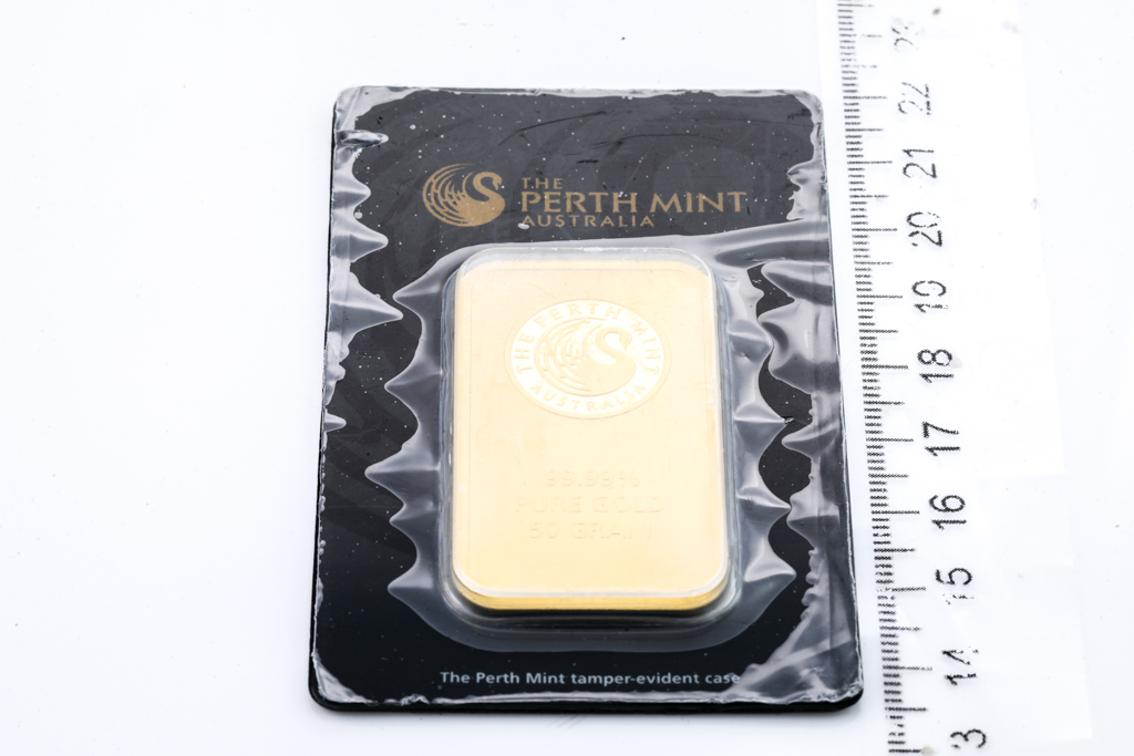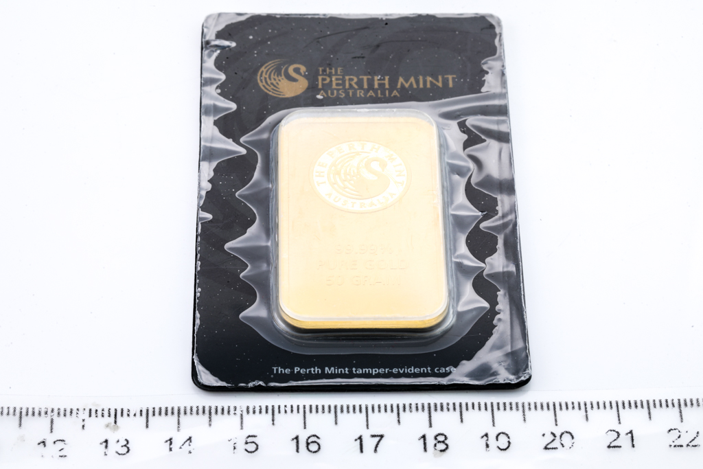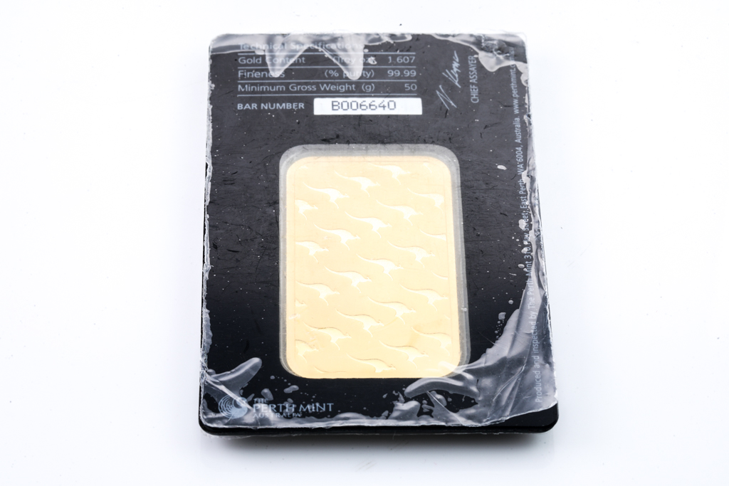 A Perth Mint Fine Gold Bar. Weight: 50g. Serial number B006640. ***Gold bullion attracts no GST and no Buyers Premium. Available for shipping within Australia only***