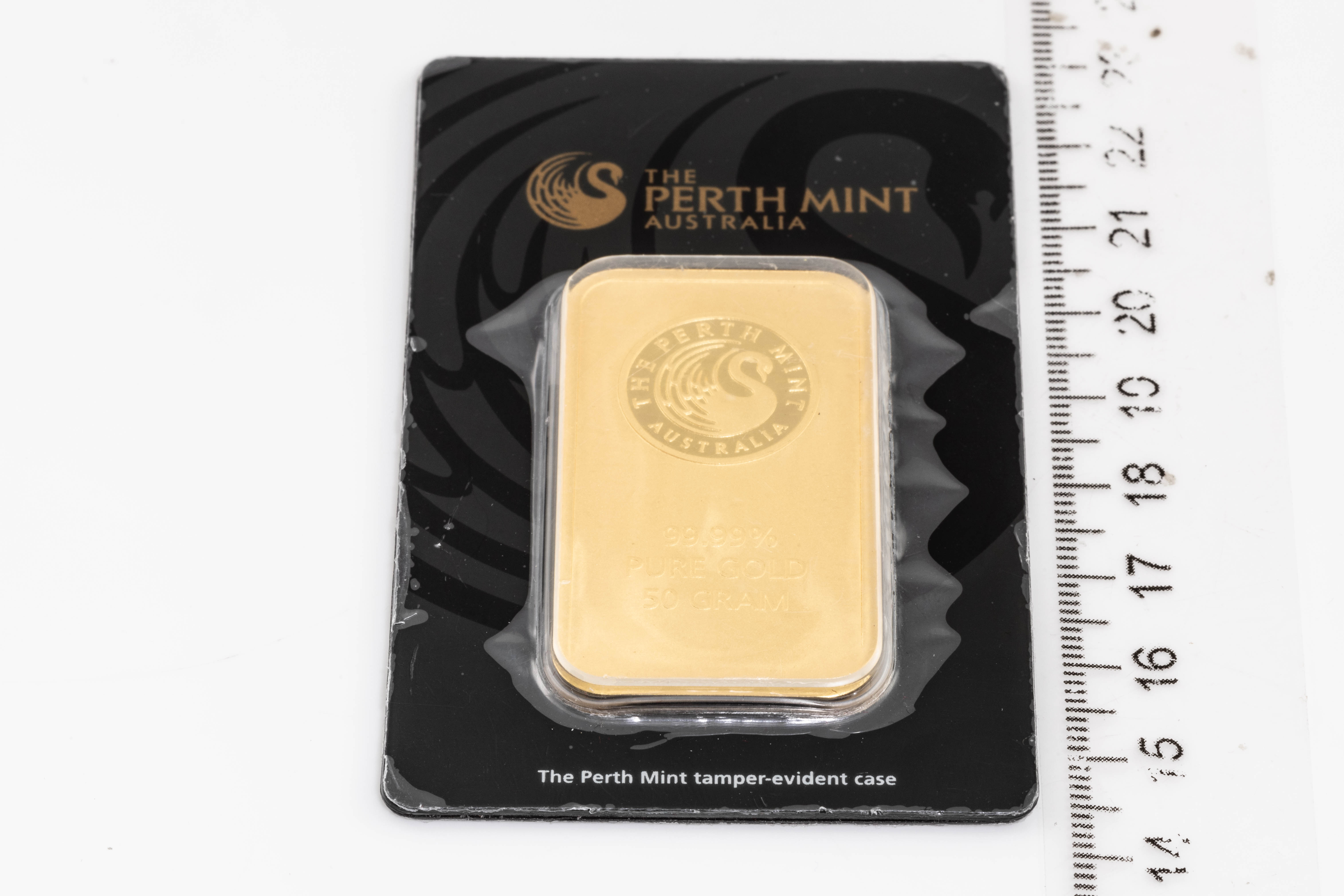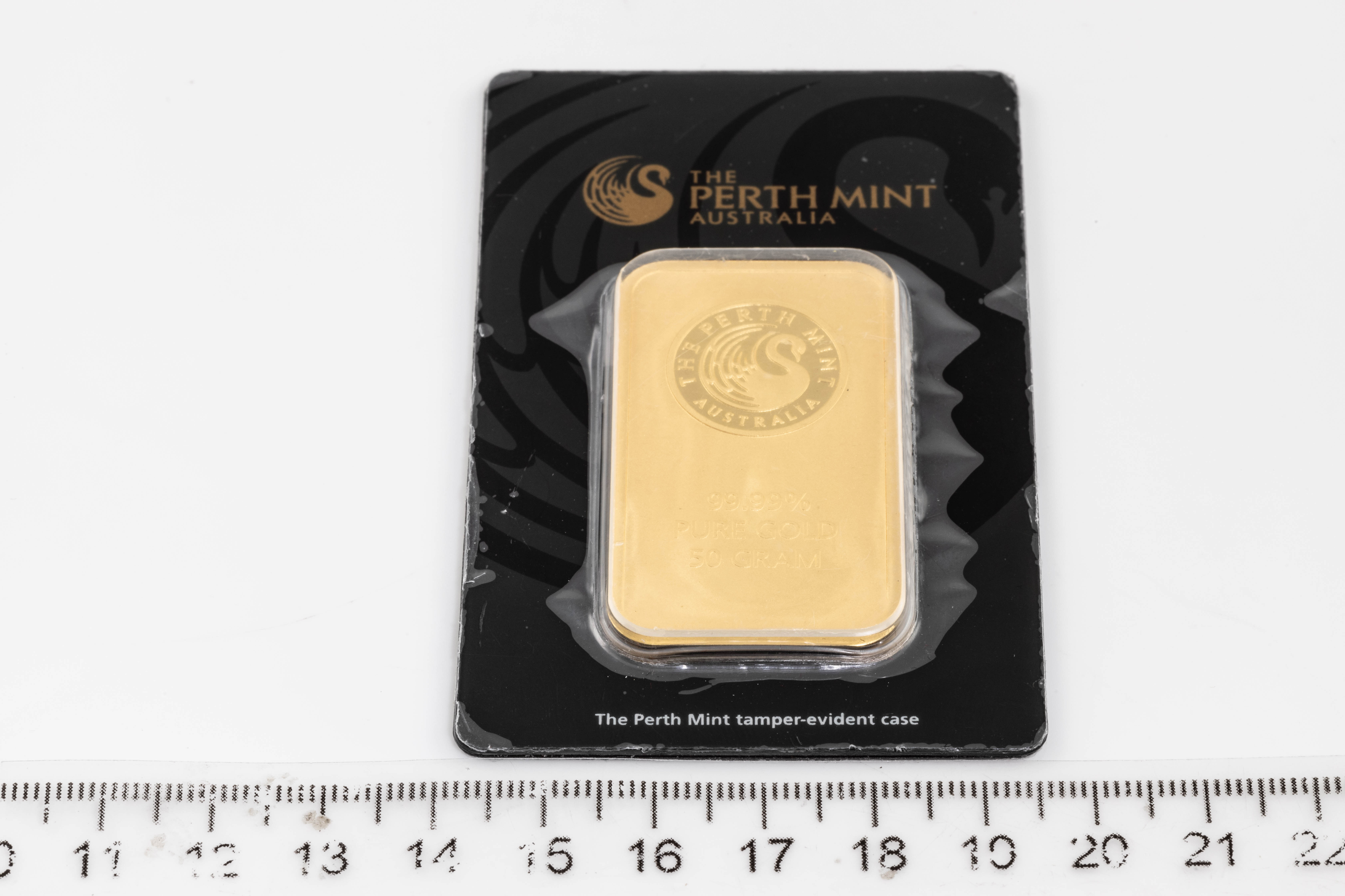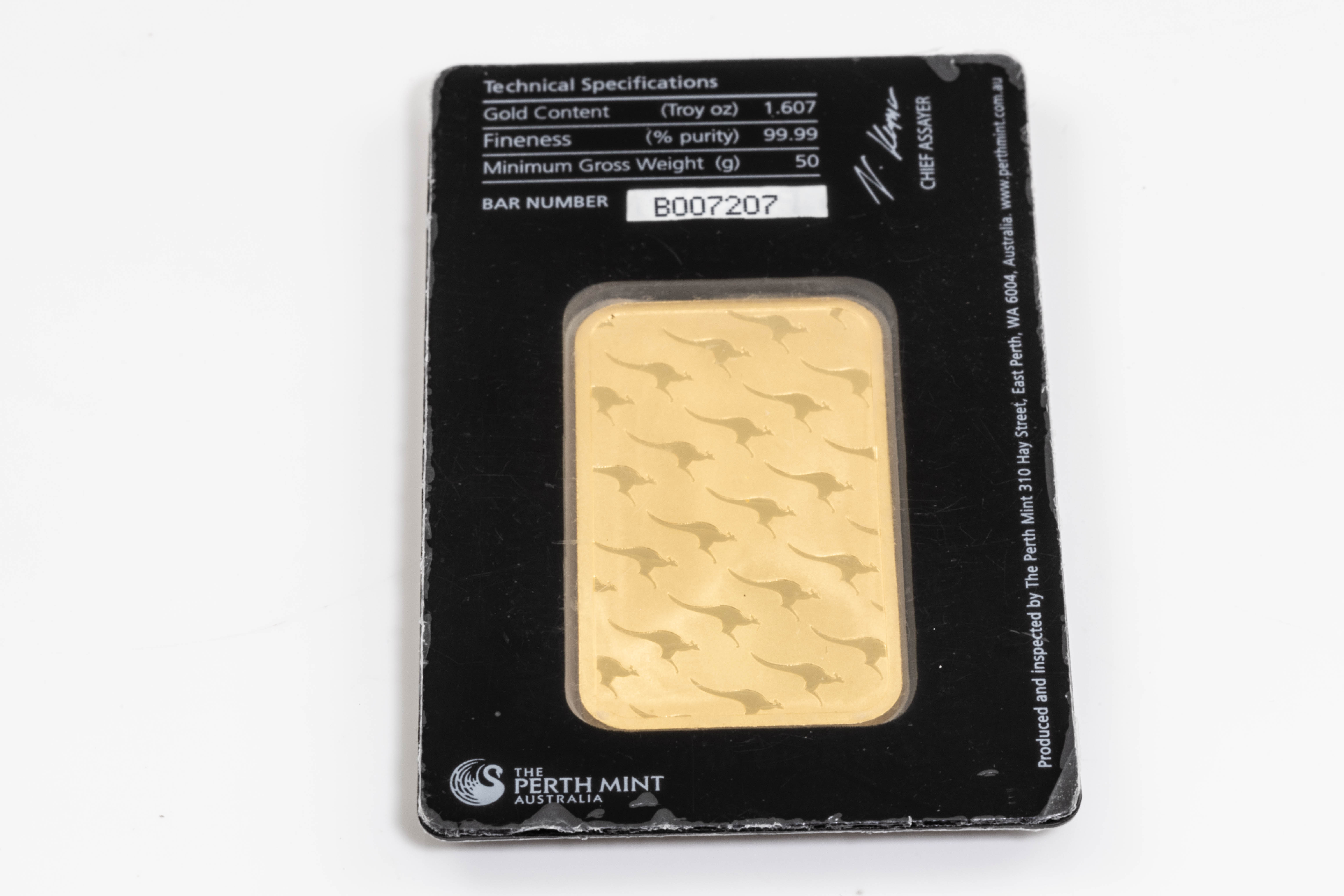 A Perth Mint Fine Gold Bar. Weight: 50g. Serial number B007207. ***Gold bullion attracts no GST and no Buyers Premium. Available for shipping within Australia only***