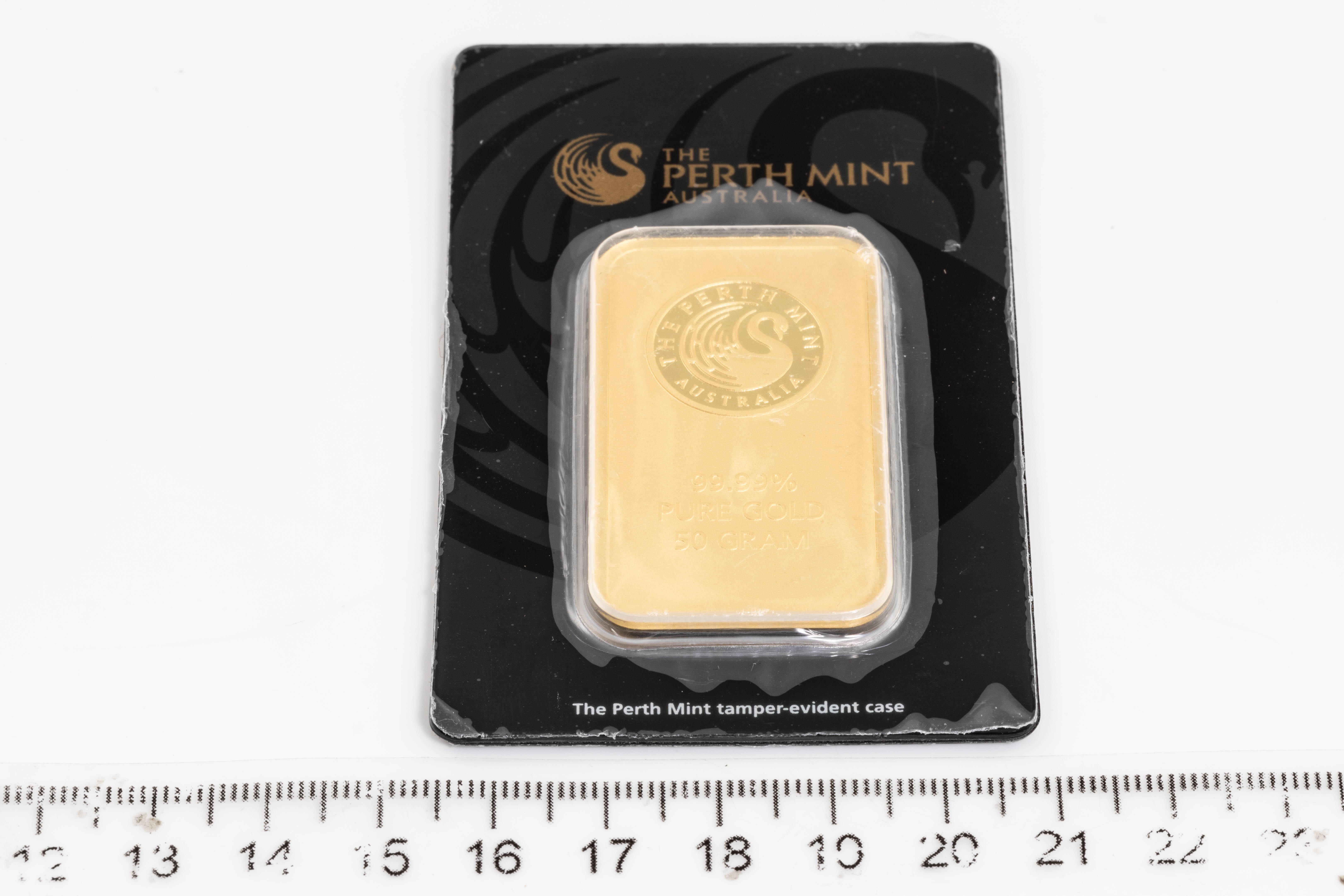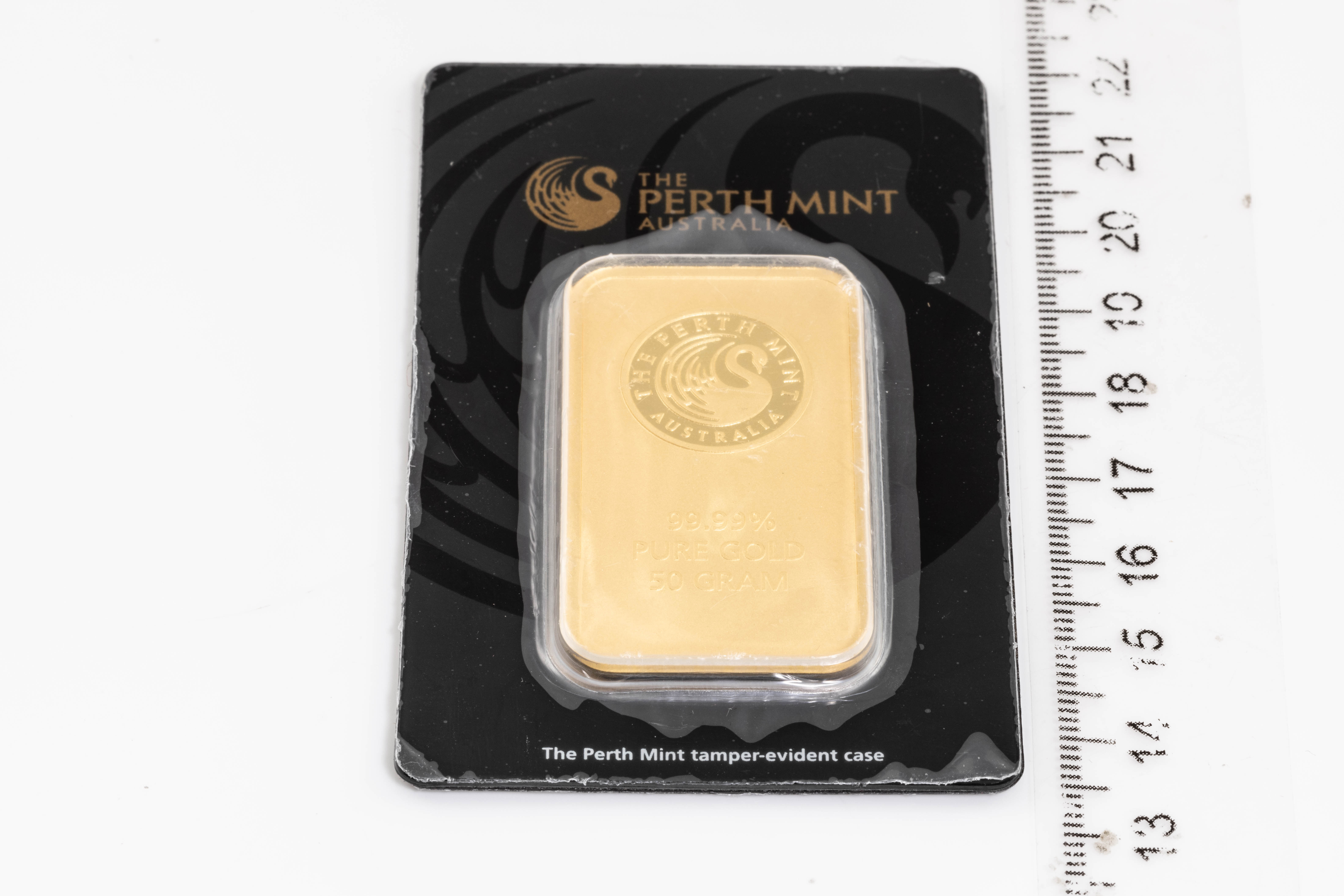 A Perth Mint Fine Gold Bar. Weight: 50g. Serial number B006646. ***Gold bullion attracts no GST and no Buyers Premium. Available for shipping within Australia only***