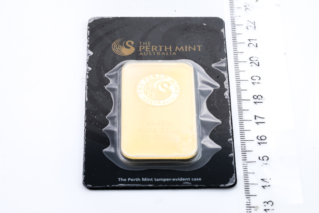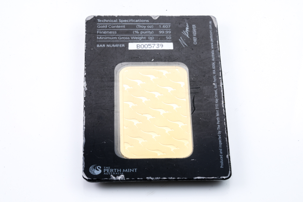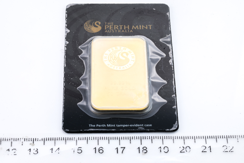 A Perth Mint Fine Gold Bar. Weight: 50g. Serial number B005739. ***Gold bullion attracts no GST and no Buyers Premium. Available for shipping within Australia only***