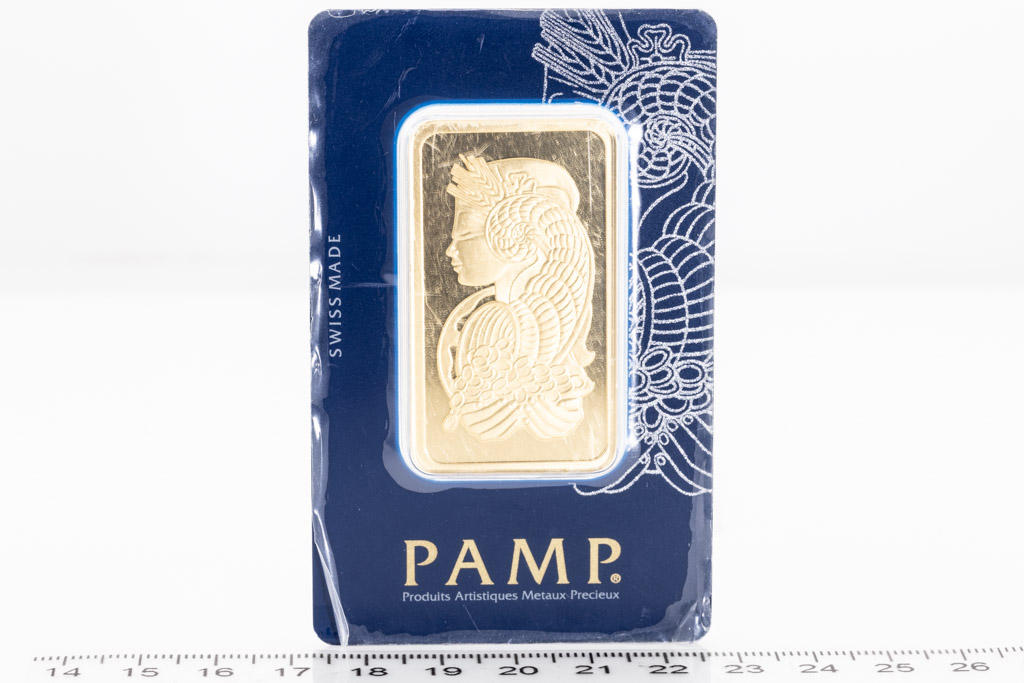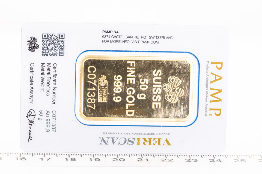 A PAMP Fine Gold Bar. Weight: 50g. Serial number C0711387. ***Gold bullion attracts no GST and no Buyers Premium. Available for shipping within Australia only***