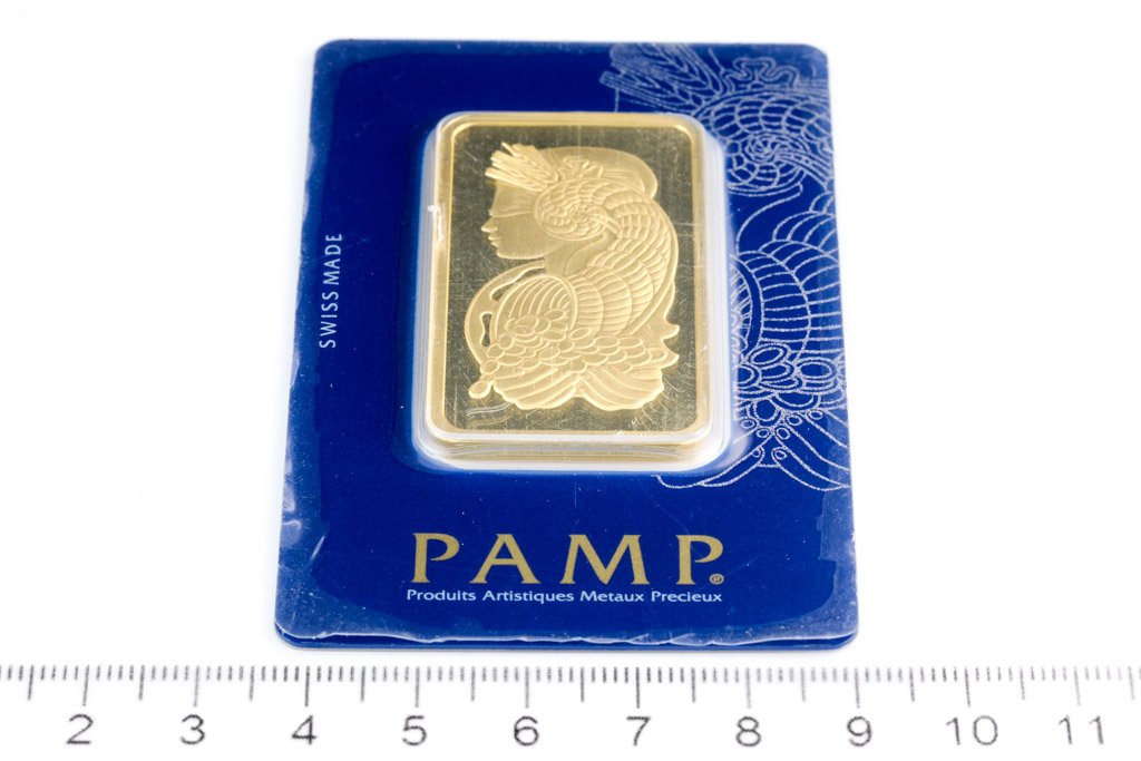 A PAMP Fine Gold Bar. Weight: 50g. Serial number C071391. ***Gold bullion attracts no GST and no Buyers Premium. Available for shipping within Australia only***