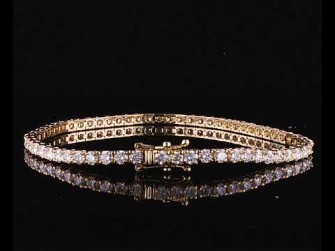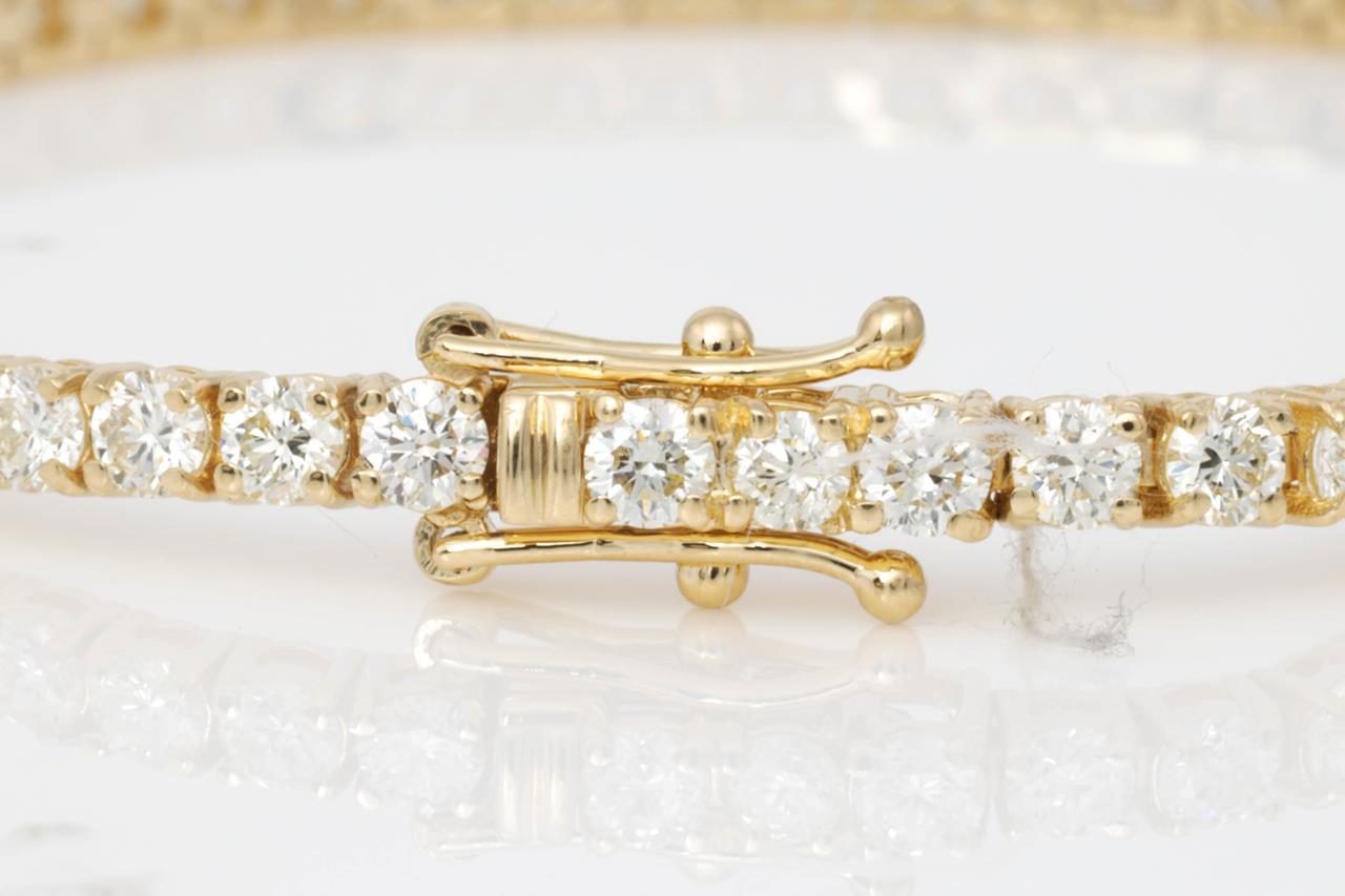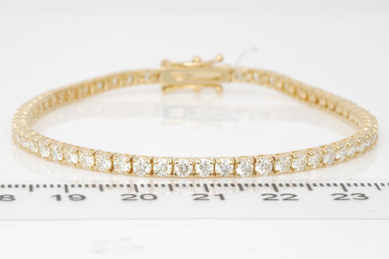 Diamond tennis bracelet with 62 round Diamonds totalling 5.10cts (Estimated grading: J VS). 18ct yellow gold. Length: 18cm. Weight: 9.9g. With certificate #414868. (New)