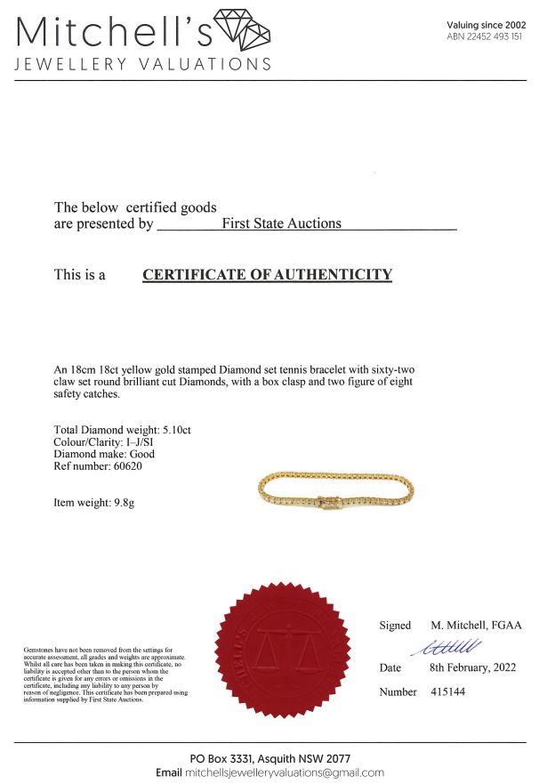Diamond tennis bracelet with 62 round Diamonds totalling 5.10cts (Estimated grading: I-J SI). 18ct yellow gold. Length: 18cm. Weight: 9.8g. With certificate #415144. (New)