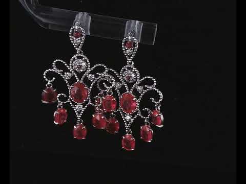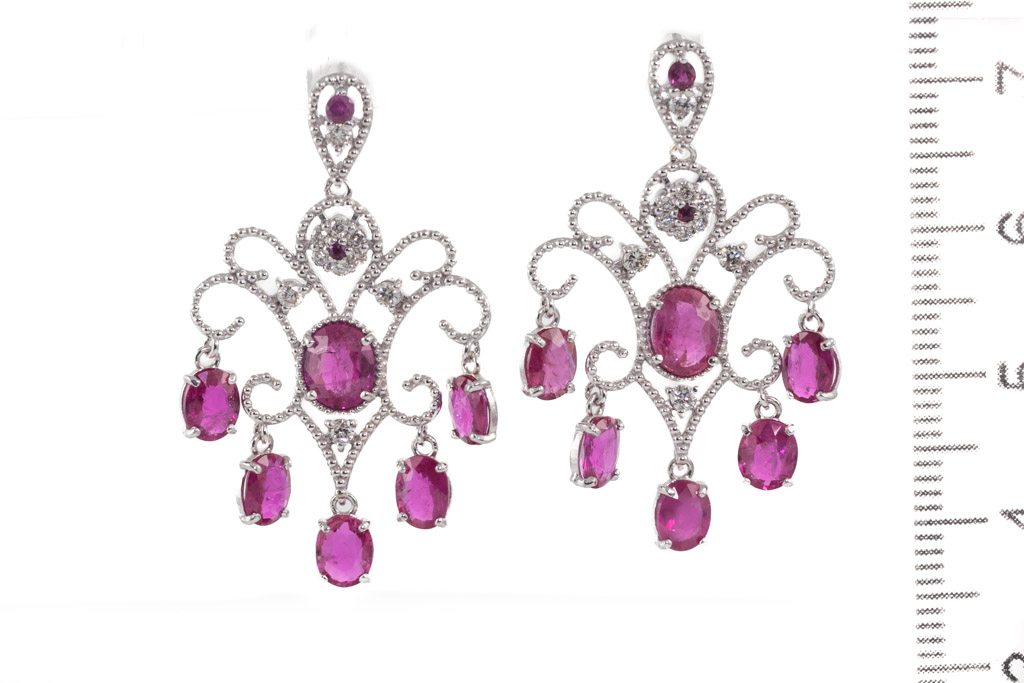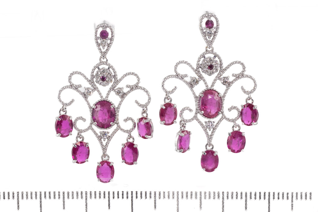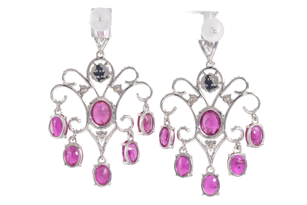 Ruby and Diamond chandelier earrings with oval & round Rubies totalling 5.14cts and round Diamonds totalling 0.30cts (Estimated grading: J P1). 18ct white gold with silicon backs. Weight: 6.0g. (Pre-owned)
