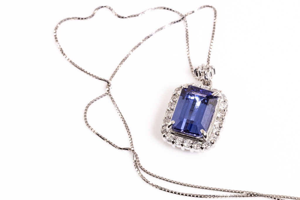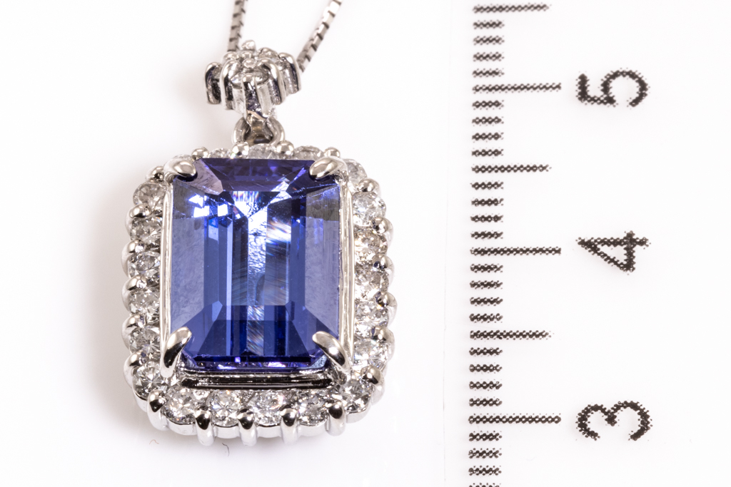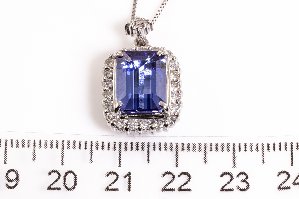 Tanzanite and Diamond pendant with emerald cut Tanzanite of 5.14ct and round Diamonds totalling 0.86cts (Estimated grading: G-H SI-P1). Platinum with 18ct white gold adjustable chain. Length:44cm. Weight: 10.9g. (Pre-owned)