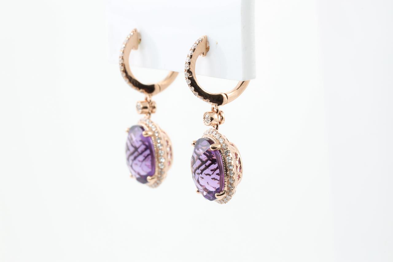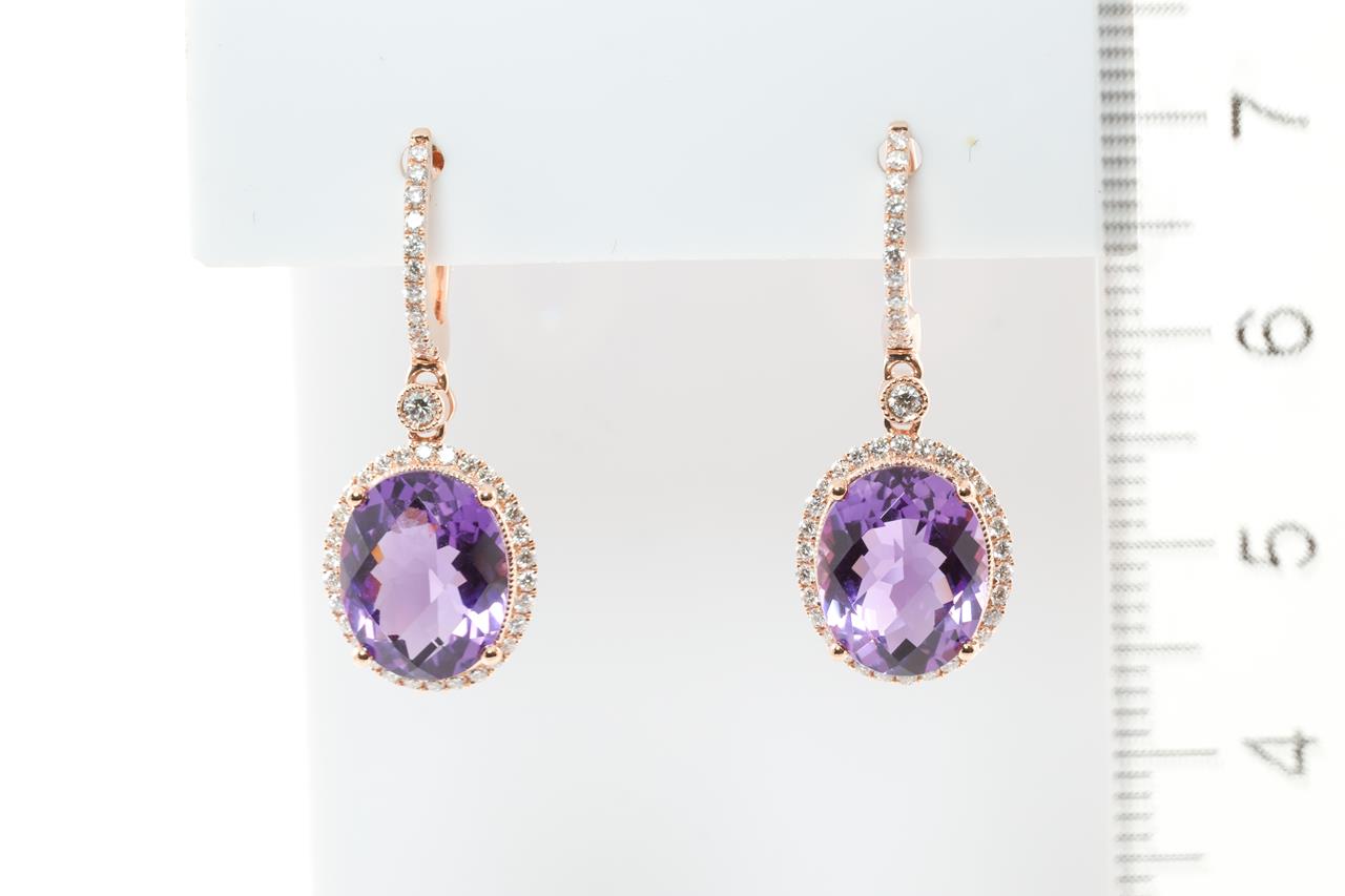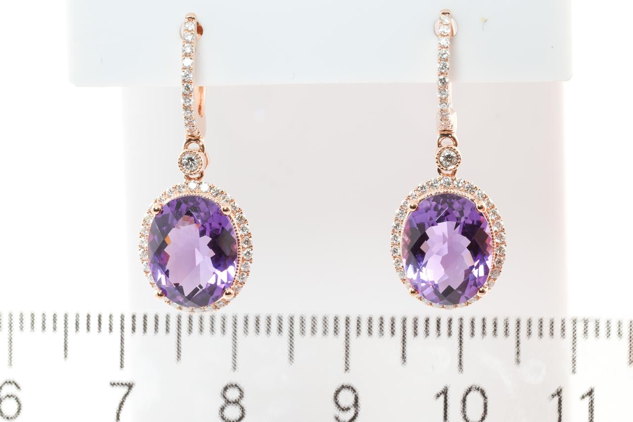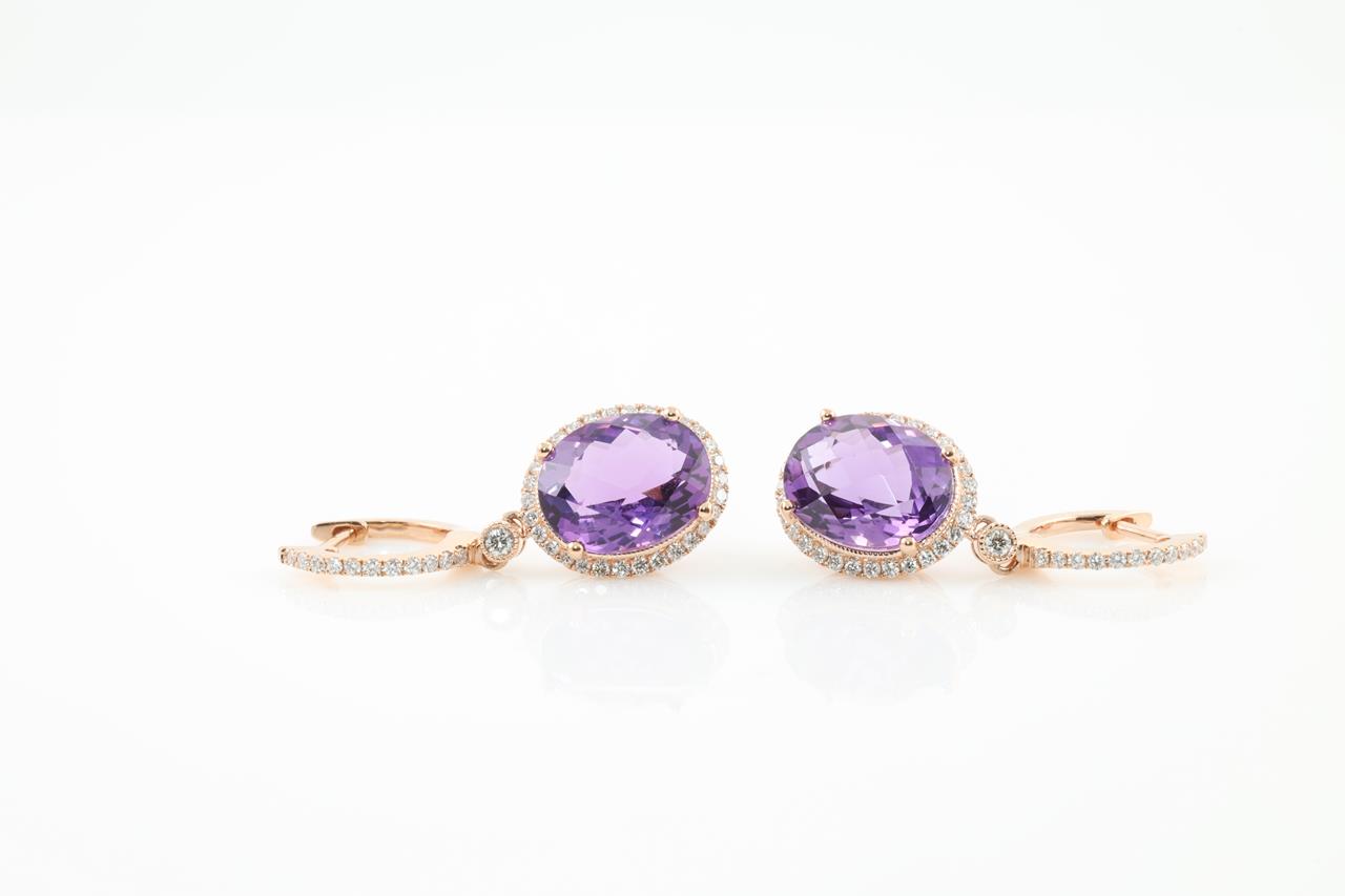 Amethyst and Diamond earrings with oval Amethysts totalling 5.15cts and round Diamonds totalling 0.41cts (Estimated grading: H-I SI). 14ct Rose gold. Weight: 3.0g (New)