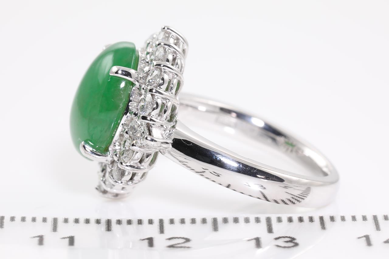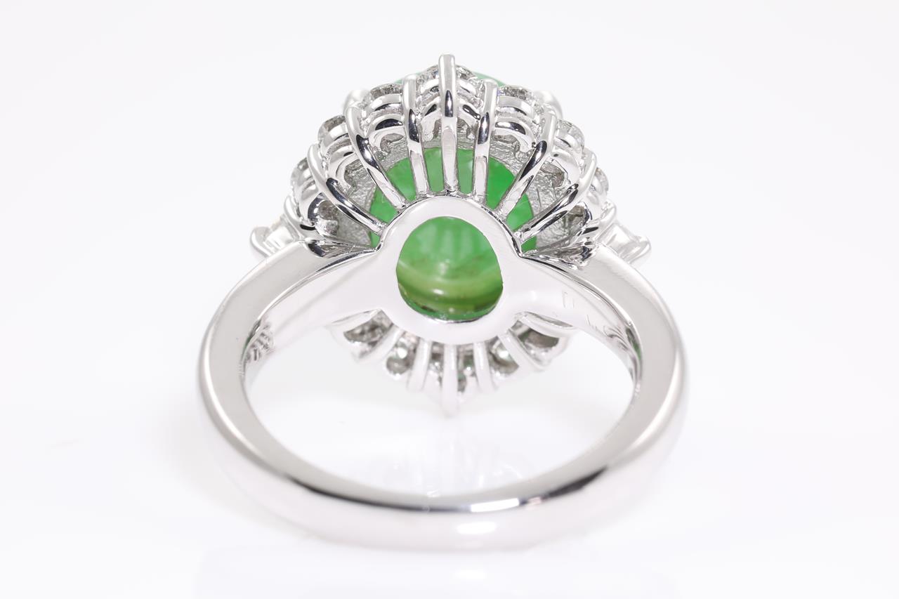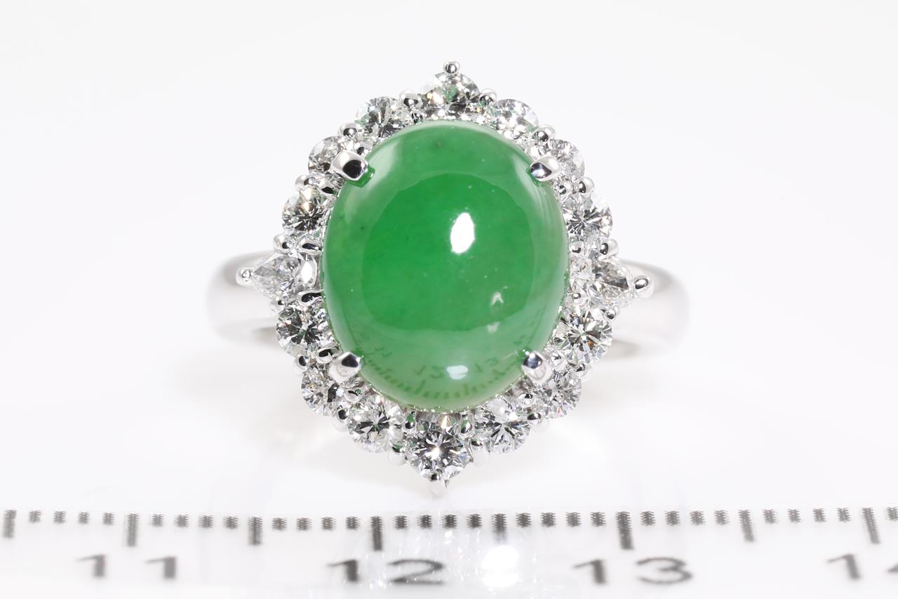Jade and Diamond ring with an oval cabochon cut natural green Jadeite Jade of 5.18ct with 14 round Diamonds and 2 pear shape diamonds totalling 0.93cts (Estimated grading: H-I SI-P1). Platinum. Ring size J. Weight: 12g. (Pre-owned)