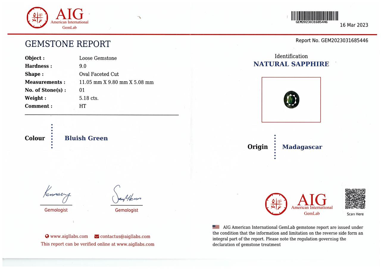 A loose oval shape bluish green Sapphire of 5.18ct (with AIG report #GEM2023031685446). Origin: Madagascar