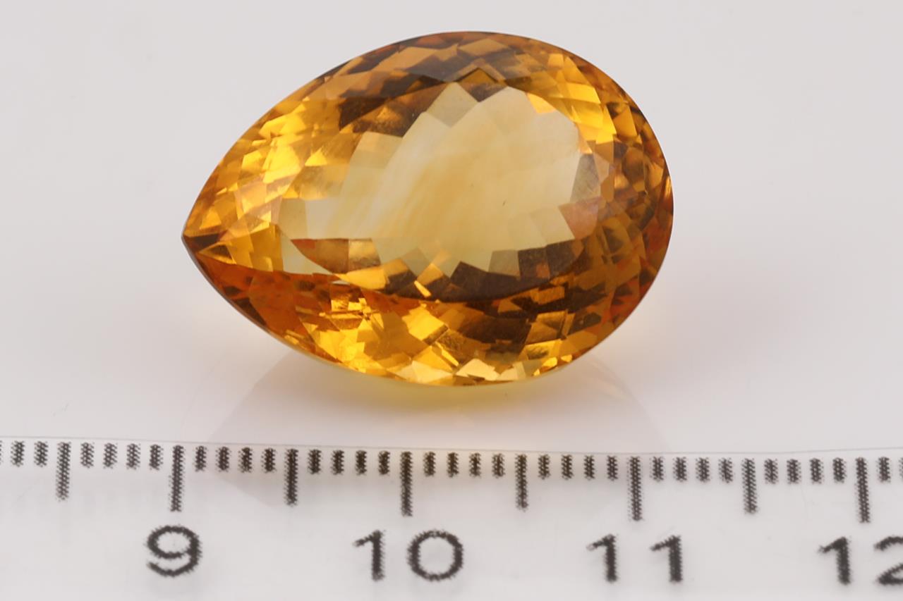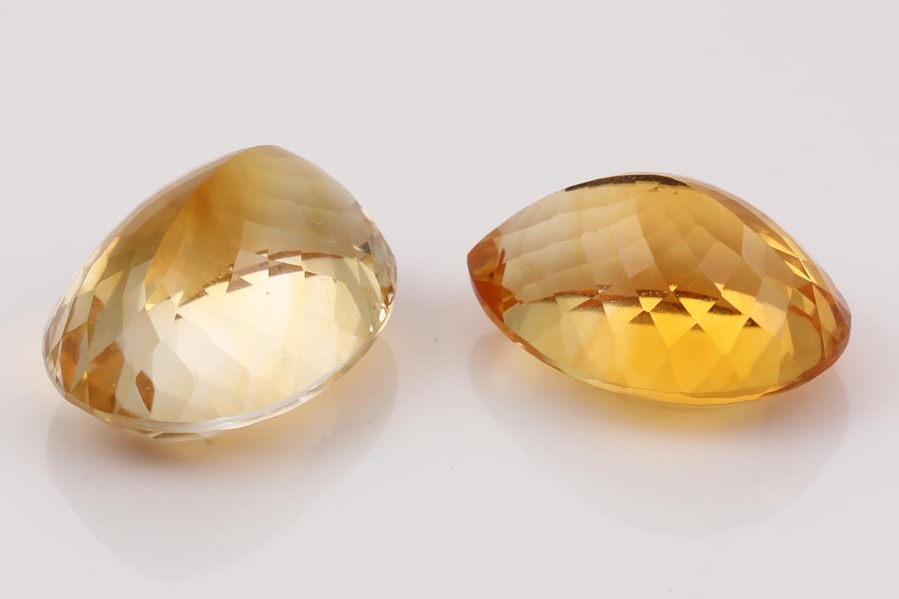 2 Loose Citrines totalling 51.94ct. 1 X Pear shape Citrine of 22.69ct, approx. size 21.8 x 16.3 x 11.4mm and 1 X oval Citrine of 29.25cts, approx. size 23.3 x 16.9 x 12.2mm. (New)