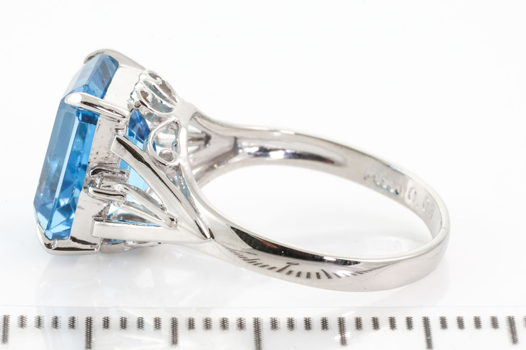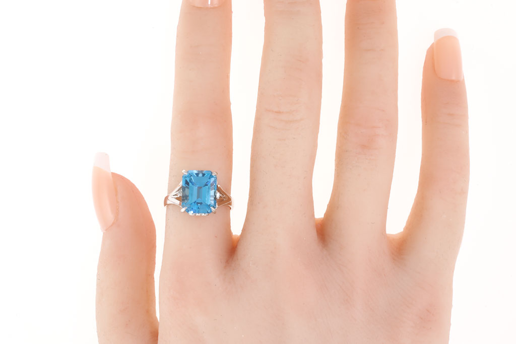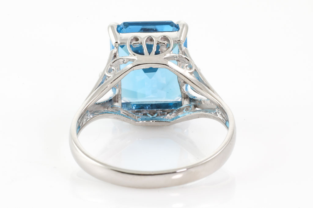 Topaz and Diamond ring with emerald cut blue Topaz of 5.19ct and round Diamonds totalling 0.03cts. Platinum-900. Ring size K 1/2. Weight: 4.6g. (Pre-owned)
